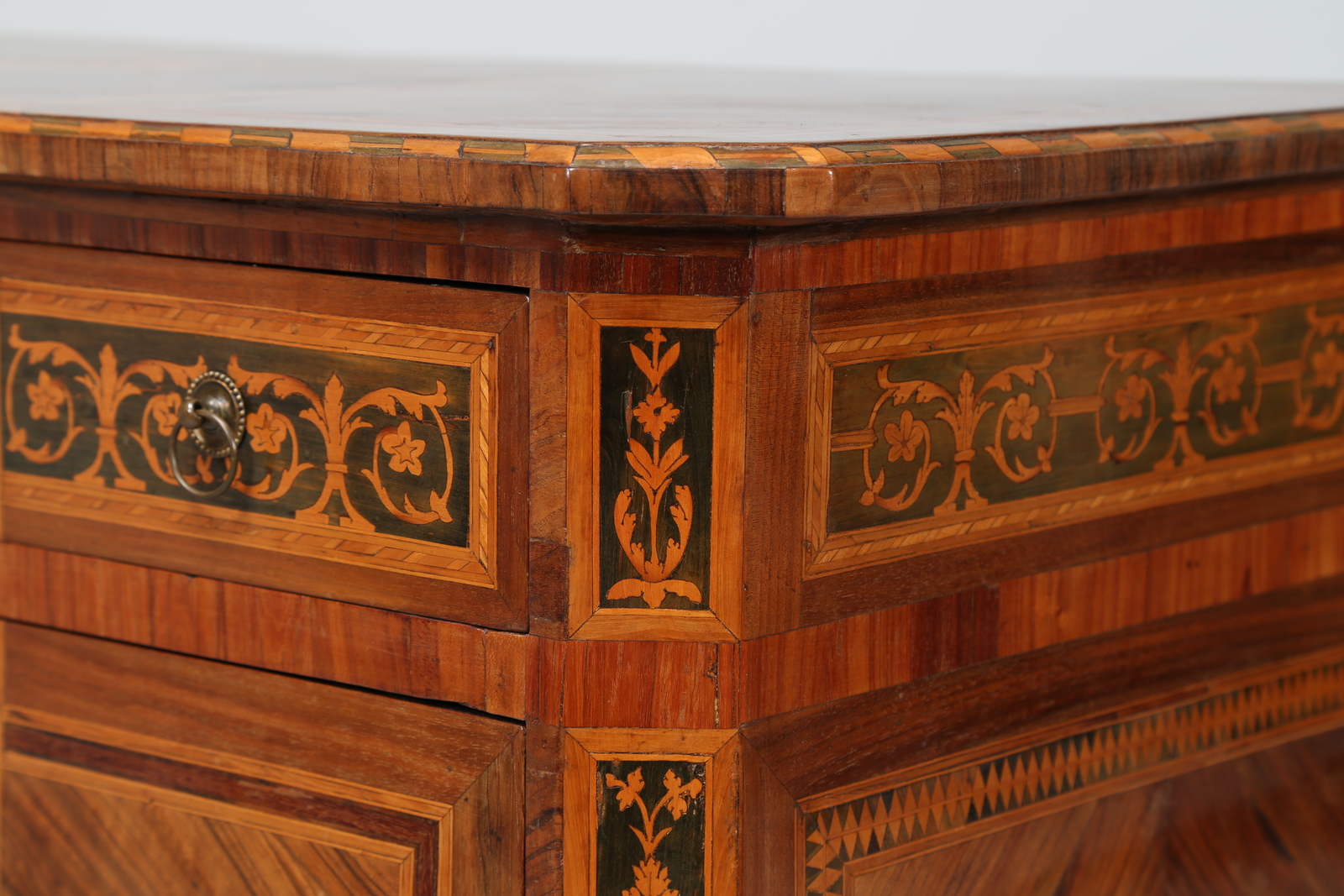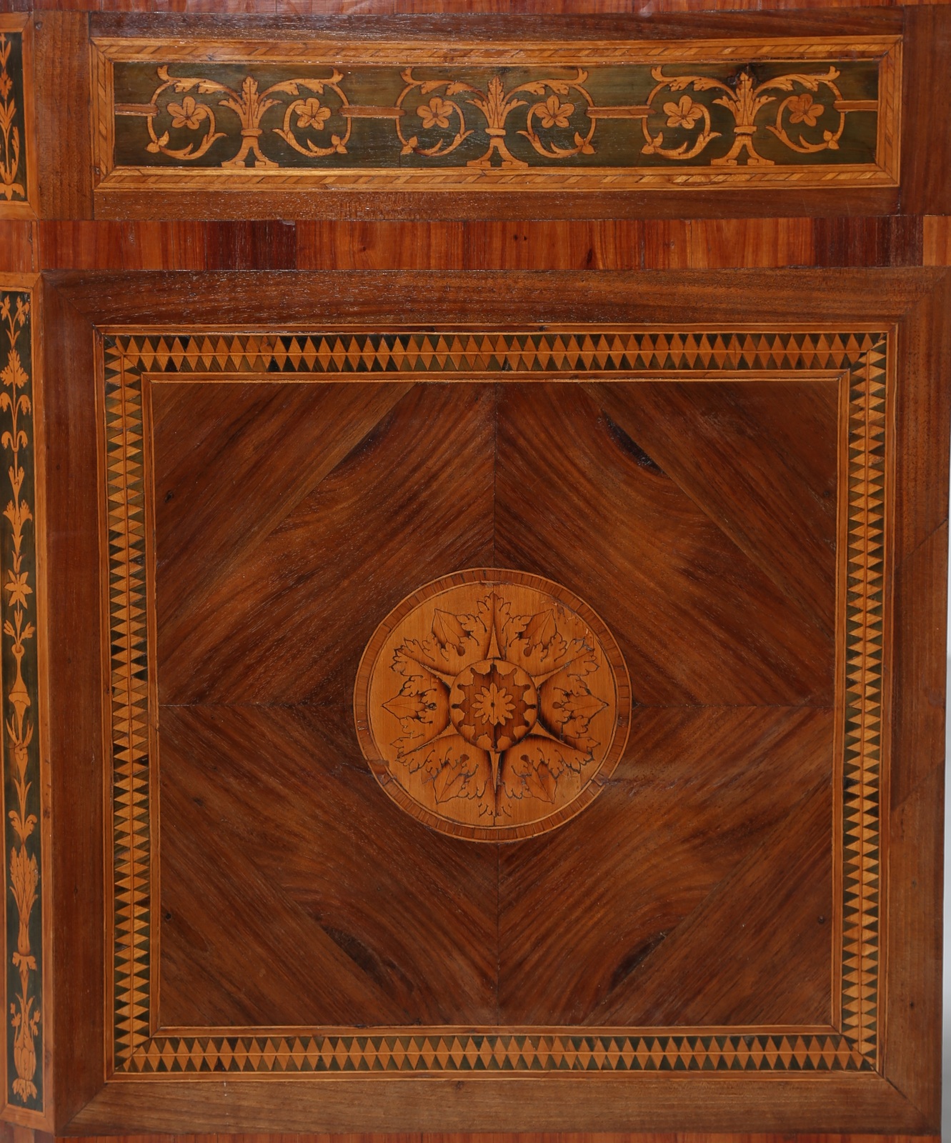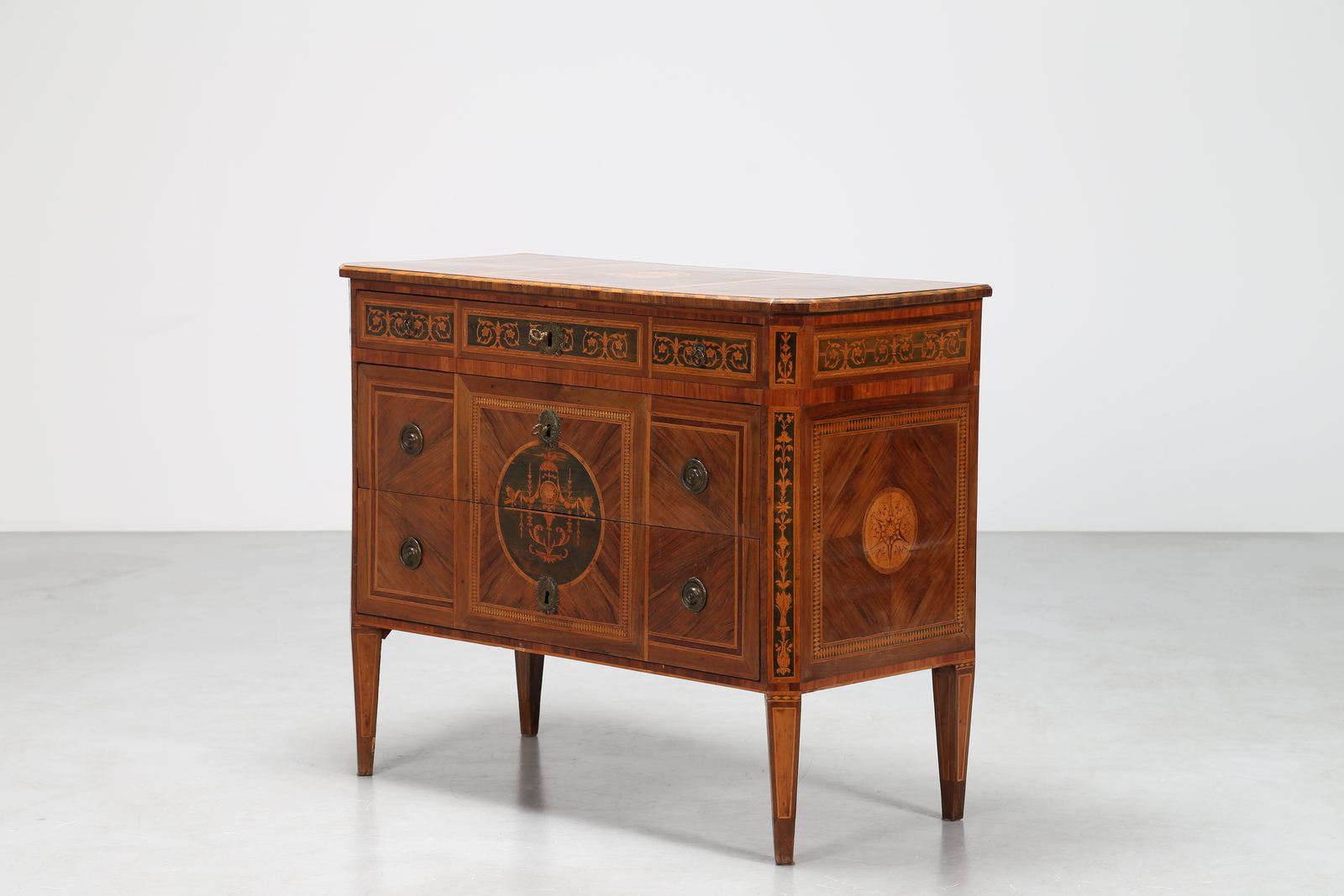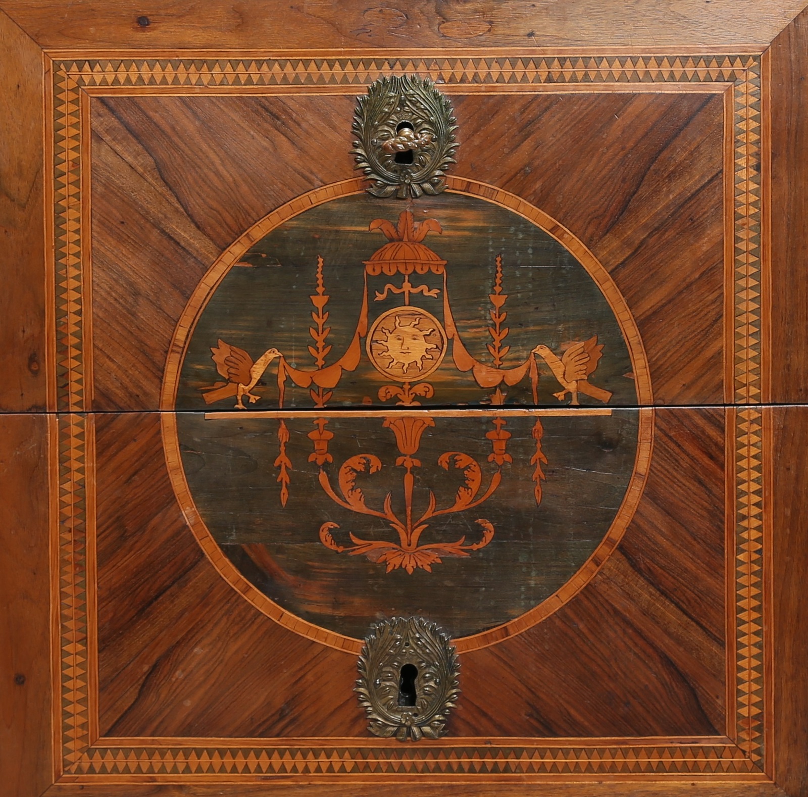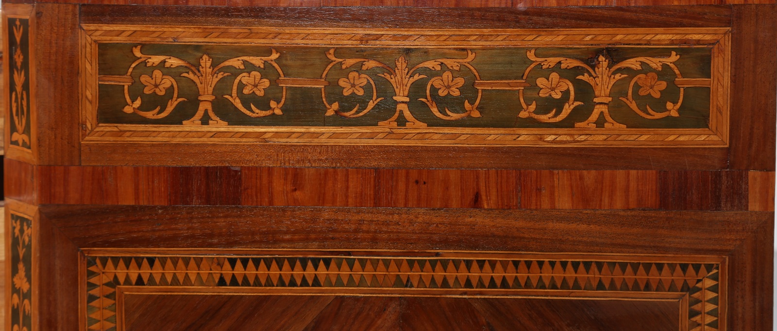 MANIFATTURA LOMBARDA DEL XVII SECOLO Cassettone lombardo filettato e lastronato a due cassetti più uno, decorati a motivi floreali, gambe troncopiramidali. . Cm 114,00 x 94,50 x 53,00.