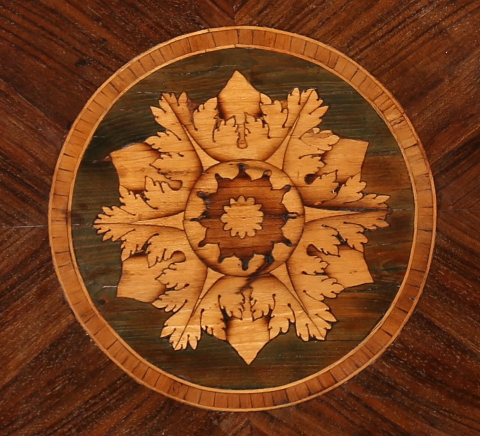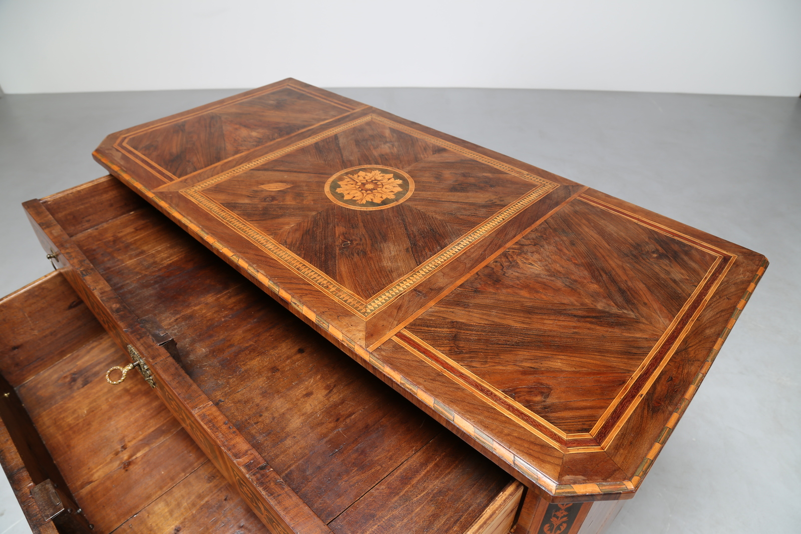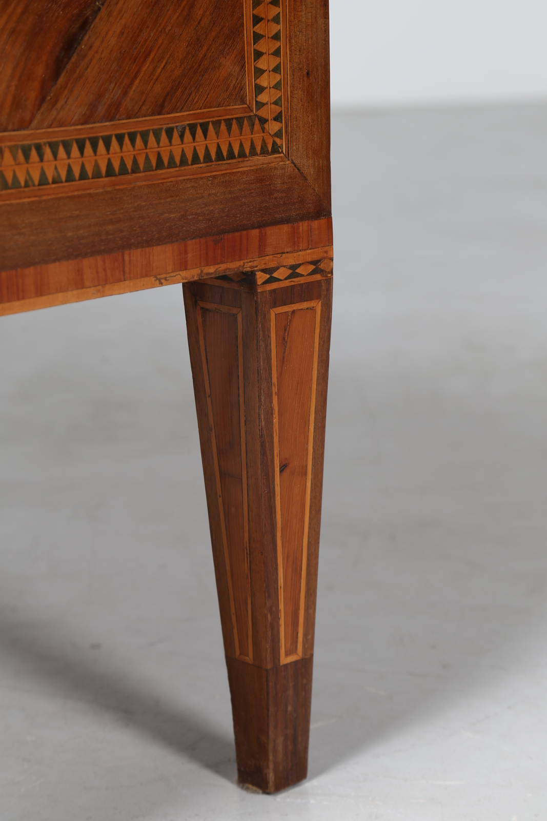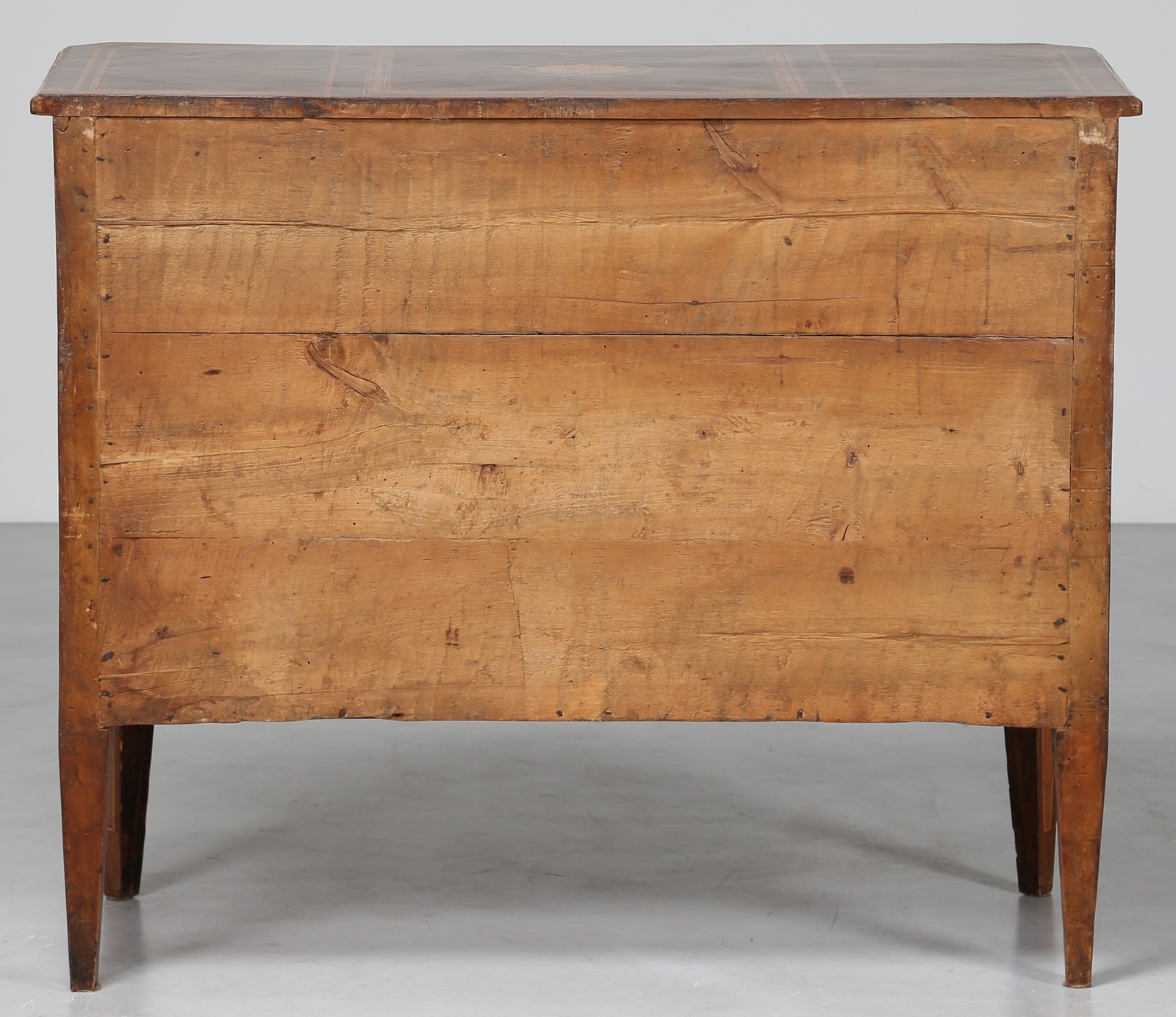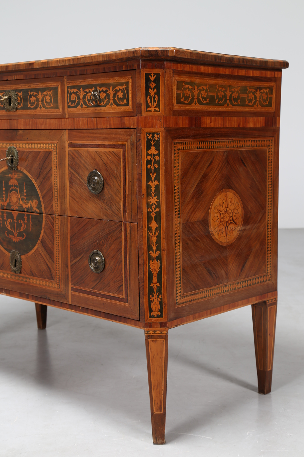 MANIFATTURA LOMBARDA DEL XVII SECOLO Cassettone lombardo filettato e lastronato a due cassetti più uno, decorati a motivi floreali, gambe troncopiramidali. . Cm 114,00 x 94,50 x 53,00.