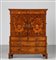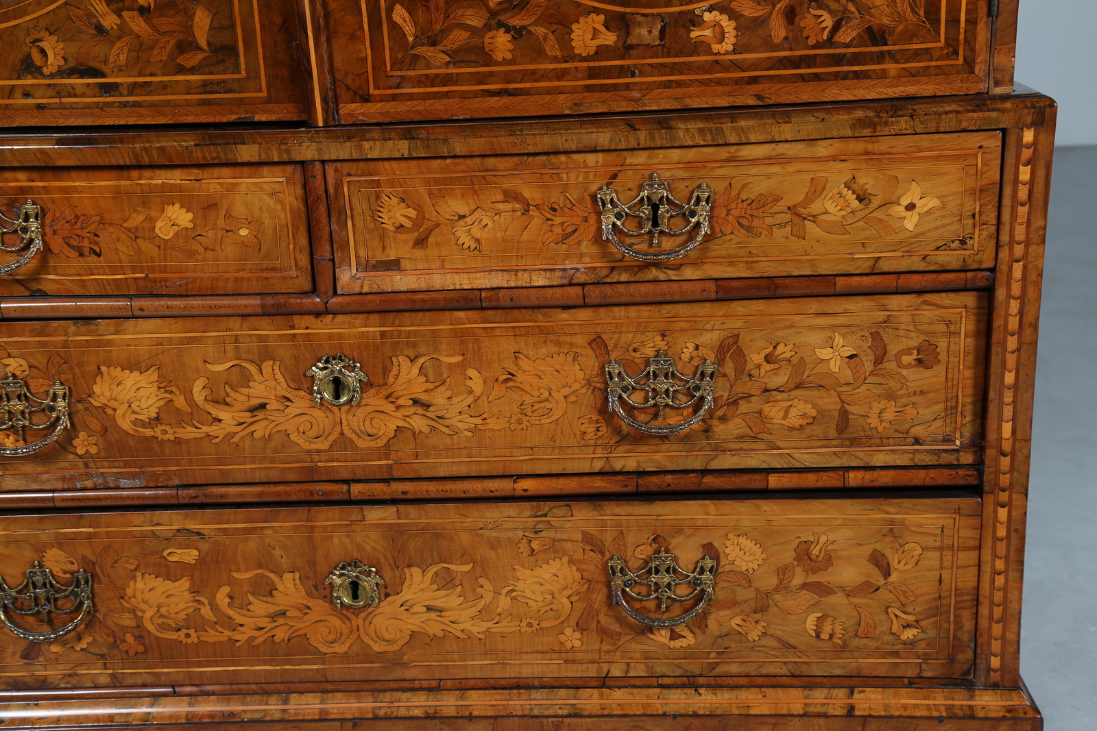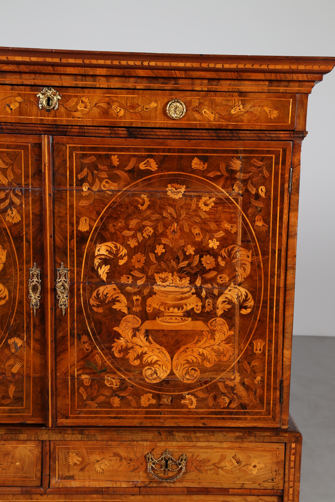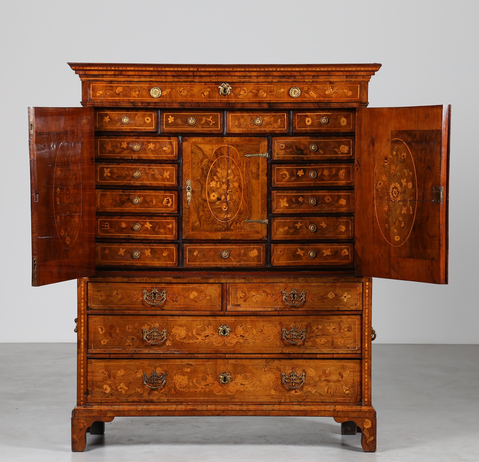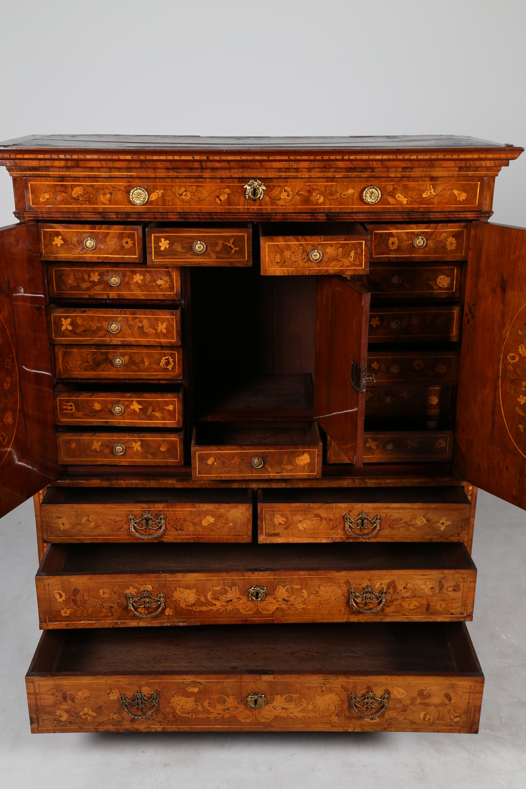 MANIFATTURA OLANDESE DEL XIX SECOLO Doppio corpo lastronato e intarsiato a motivi floreali, un cassetto superiore, due ante che presentano quindici cassetti e un vano centrale; i cassetti inferiori sono due più due. . Cm 140,00 x 175,00 x 57,00.