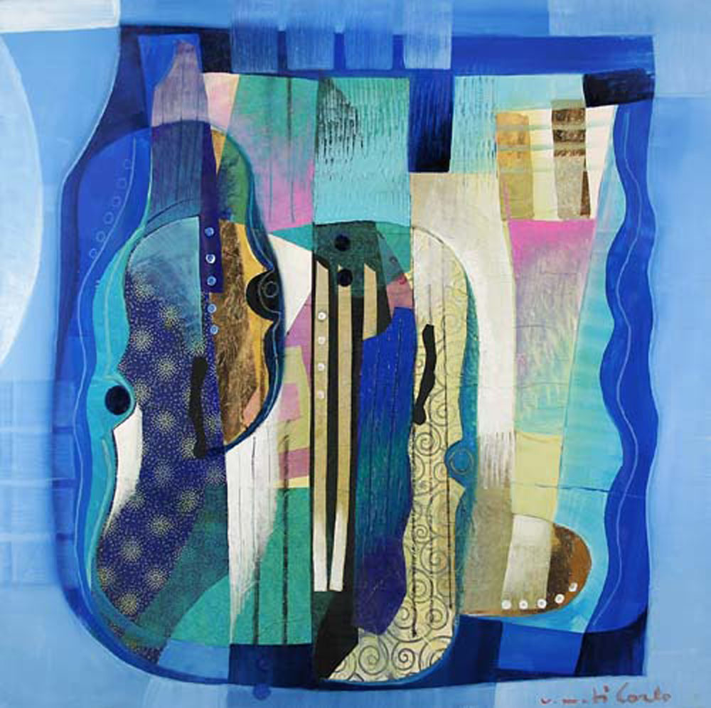VITTORIOMARIA DI CARLO S. Marco in Lamis (Fg) 1939 Strumento a corde olio e collage su tela cm. 80x80, firma in basso a destra e al retro, dichiarazione d'autenticità e archivio dell'artista numero 200/223 su foto.