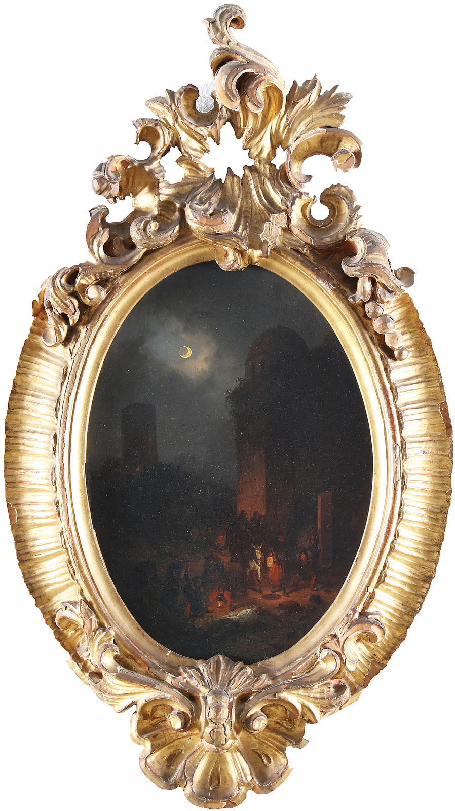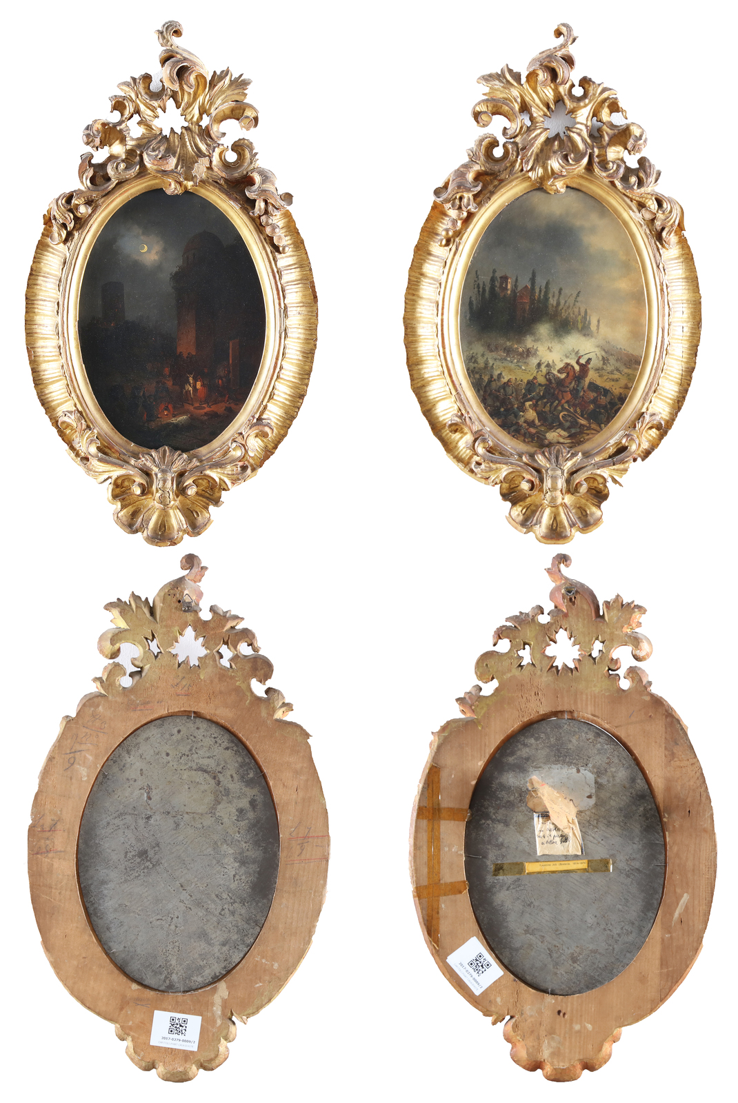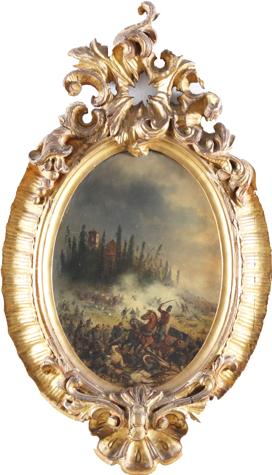 JOLI FAUSTINO (1814 - 1876) La battaglia di San Martino, La notte che seguì la battaglia di Solferino. Olio su tela . Cm 22,00 x 30,00. Faustino Joli si dedicò assiduamente a temi di carattere risorgimentale e le due opere qui presentate sono stilisticamente accostabili alla celebre serie di quattro tele conservate nelle raccolte dei Civici Musei d’Arte e Storia di Brescia, dedicate ad alcuni episodi delle “Dieci Giornate di Brescia” (23 marzo - 1 aprile del 1849: Il popolo radunato in Piazza Vecchia il 23 marzo, Il combattimento nella Piazzetta dell’Albera il 31 marzo, Saccheggi a Porta Torrelunga il 31 marzo e La Barricata a San Barnaba il 31 marzo). In tale frangente eseguì diversi dipinti per celebrare la battaglia di Solferino e San Martino, combattuta dai Franco-Sardi contro gli Austriaci il 24 giugno 1859 in territorio mantovano e bresciano. In particolare, l'artista espose all'Ateneo di Brescia nel 1863 un quadro di grande formato dedicato alla battaglia di San Martino e "Due più piccoli quadri" dedicati a Solferino. La descrizione del primo dei due dipinti corrisponde precipuamente a uno dei due ovali qui presentati: " Nuvoloso è il cielo; un tratto solo rotto fiocamente dalla luna, onde si disegnano le cime della torre crollante, della vicina chiesa [...] fra qua e là qualche fiaccola è scorta ai pietosi che dal campo recano i feriti a qualche asilo" (Commentari dell'Ateneo di Brescia per gli anni 1862,1863,1864, p. 386. . Cornice presente