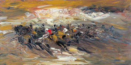 MARIO FALCHI Porto Maurizio 1950 Carica di cavalleria, 2011 olio su tela cm. 50x100, firma in basso a sinistra, titolo, firma e anno al retro, dichiarazione d'autenticità dell'artista su foto.