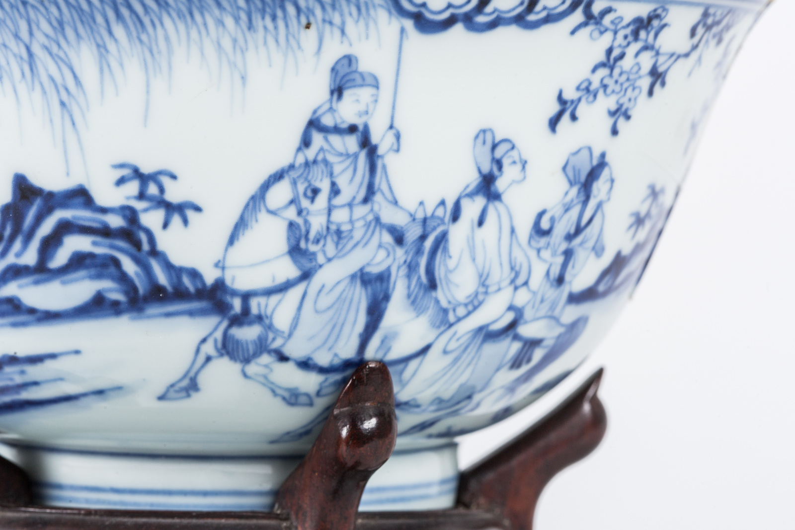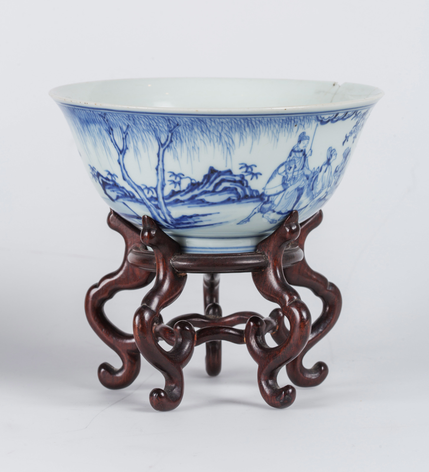 Arte Cinese Tazza Kangxi in porcellana bianco/blu con stand in legno Cina, dinastia Qing, XVIII secolo . -. Cm 18,50 x 9,00. Dipinta in blu sottocoperta con raffigurazioni di personaggi in paesaggio, marchio Xuande apocrifo a sei caratteri sulla base. Rottura incollata. base h. 11 cm