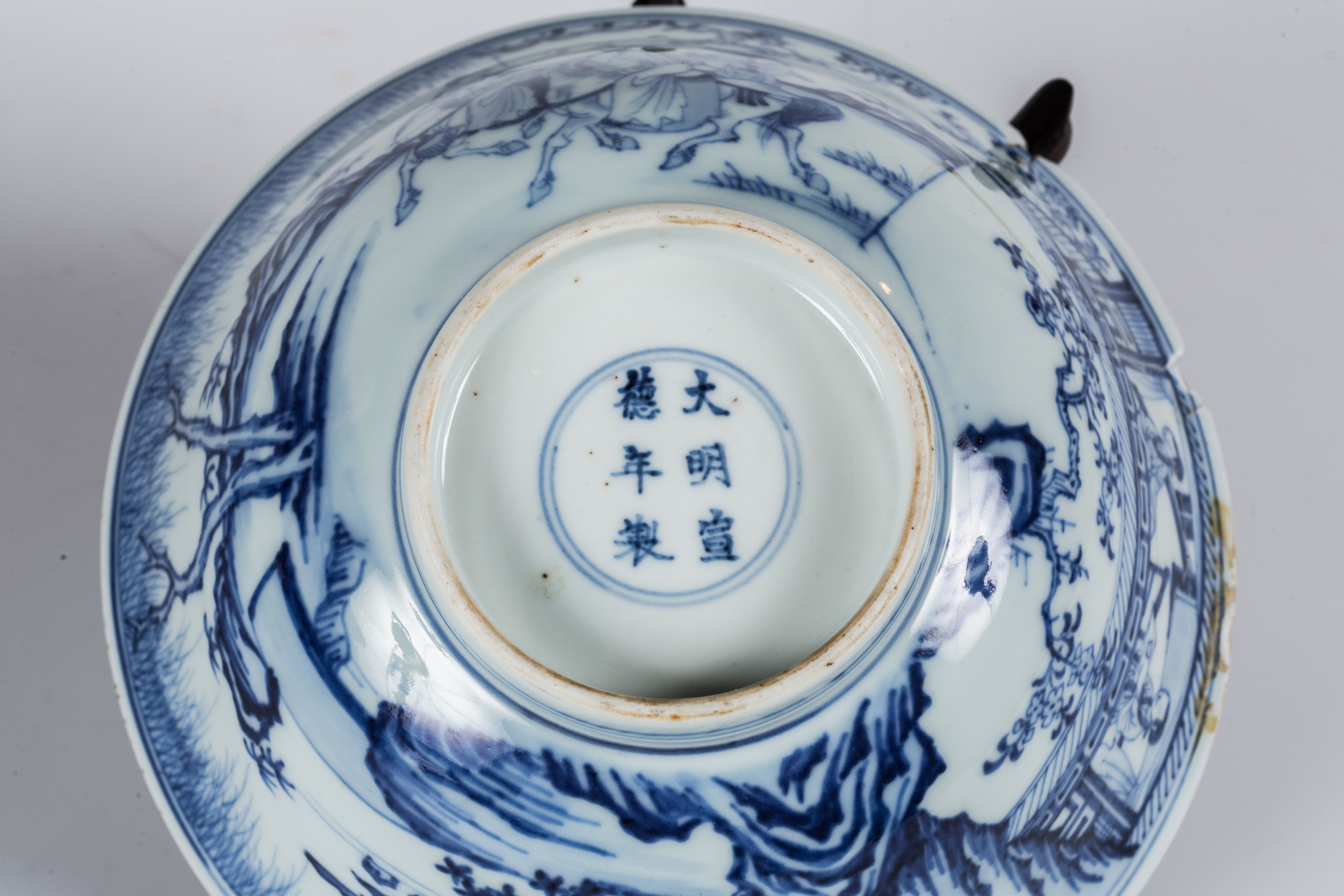 Chinese Art A porcelain blue and white Kangxi bowl painted with characters in landscape and bearing a spurious Xuande six character mark at the base China, Qing dynasty, 18th century . . Cm 18,50 x 9,00. Broken piece temporaly glued.