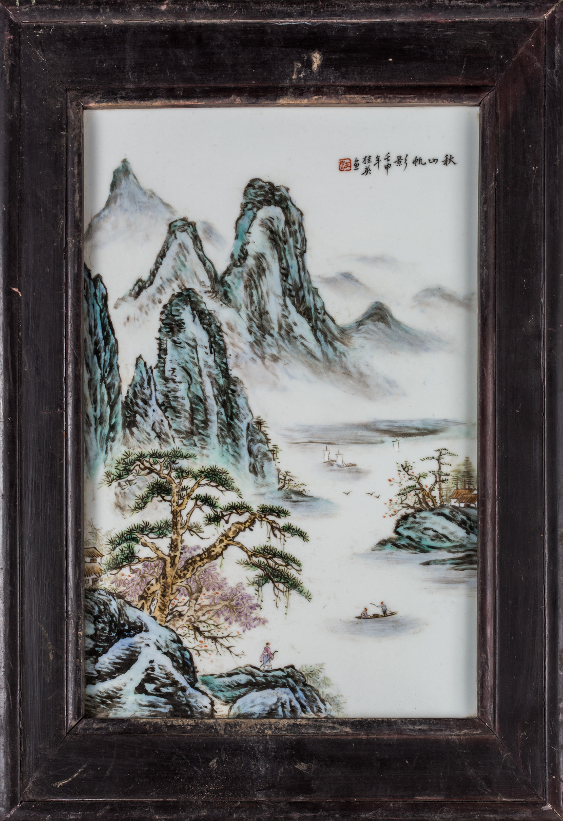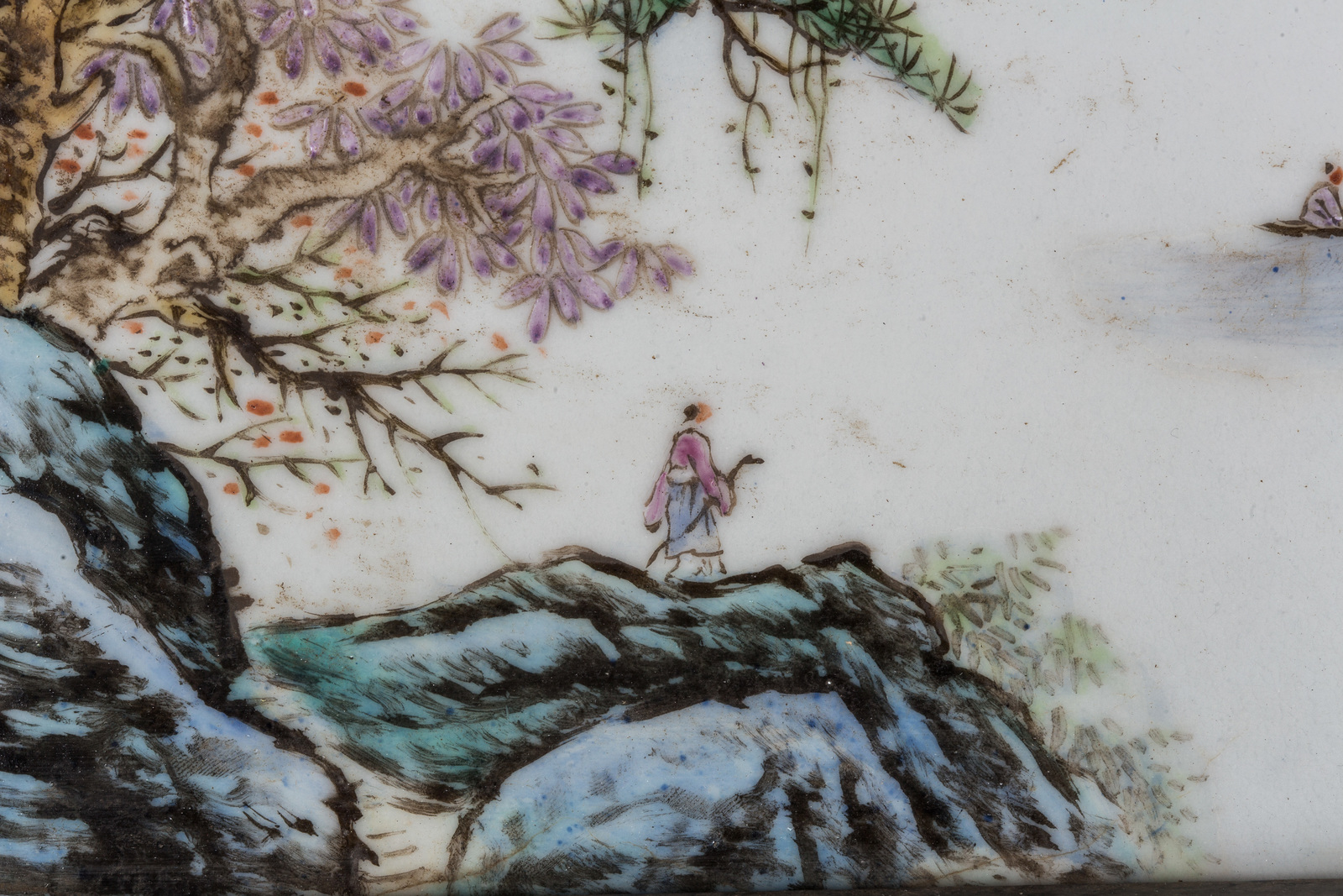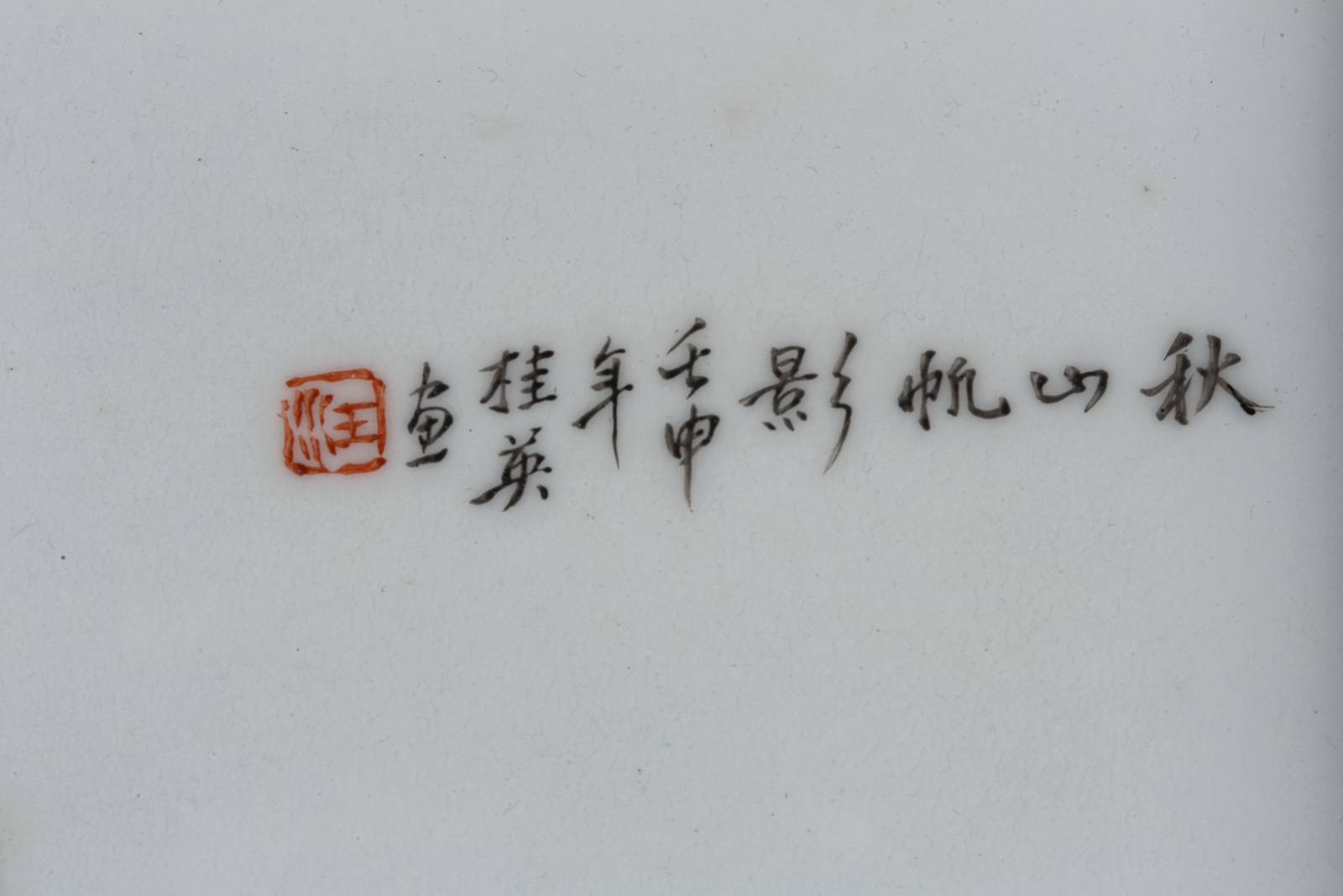 Placca in porcellana policroma dipinta con paesaggio, firmata Yu Guiying,sigillo Wang Shui