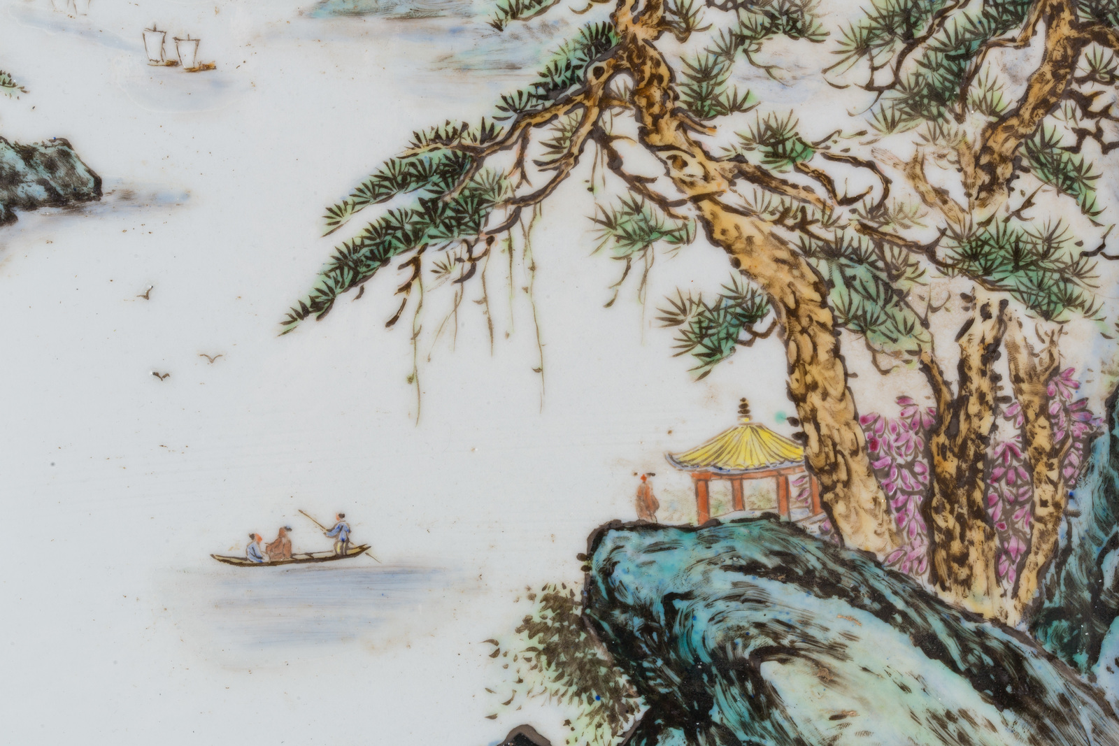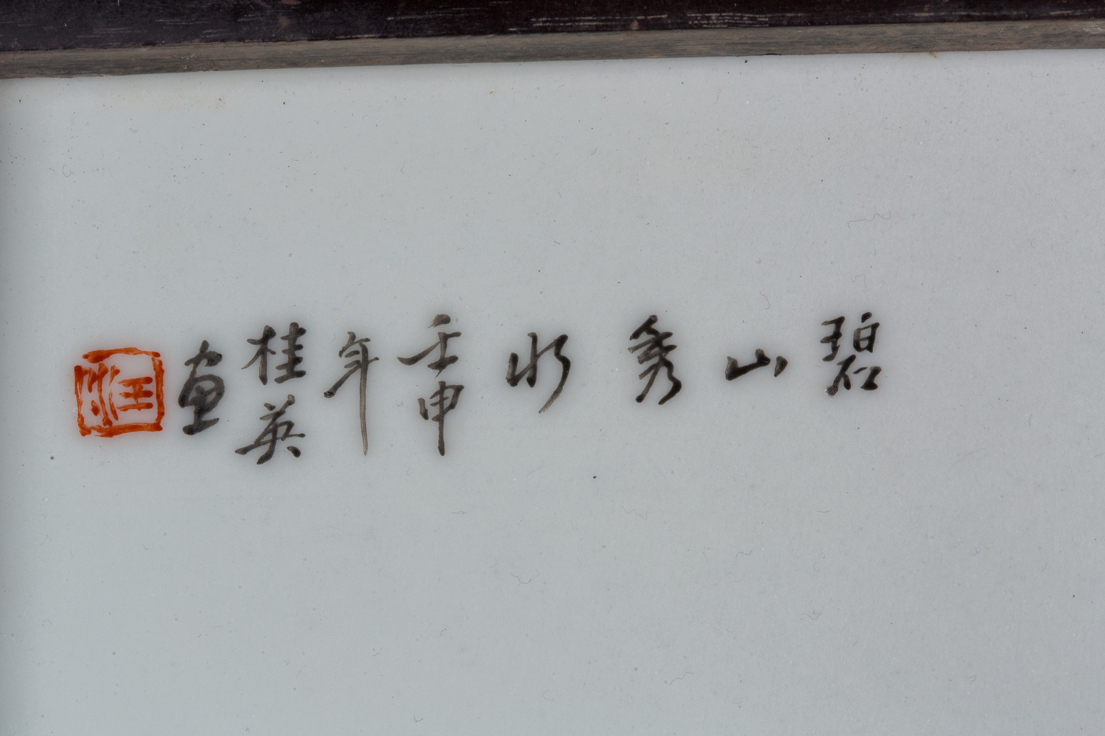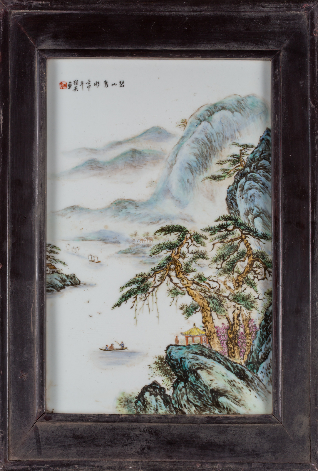 Placca in porcellana policroma dipinta con paesaggio firmata Yu Guiying, sigillo Wang Shui