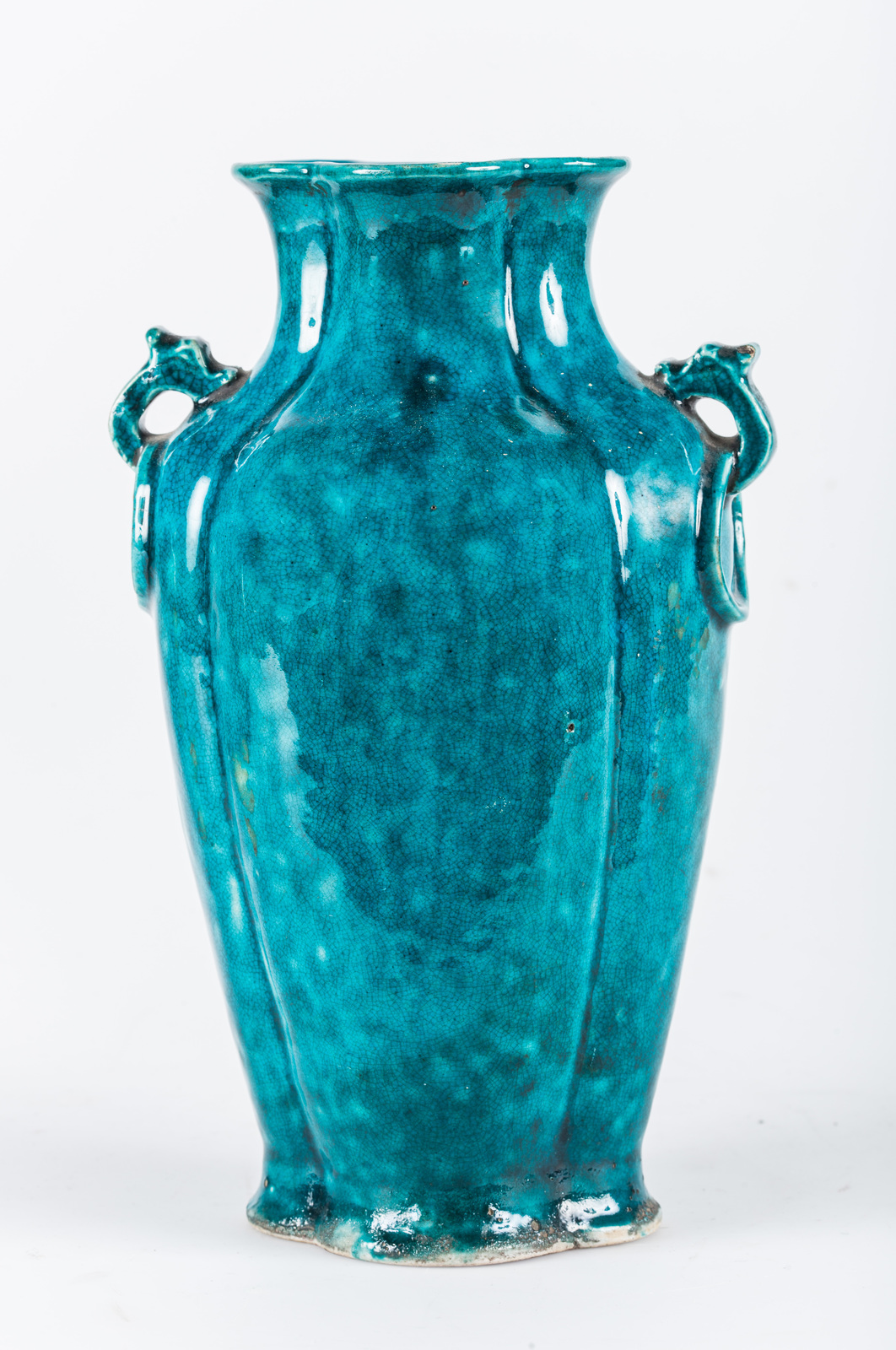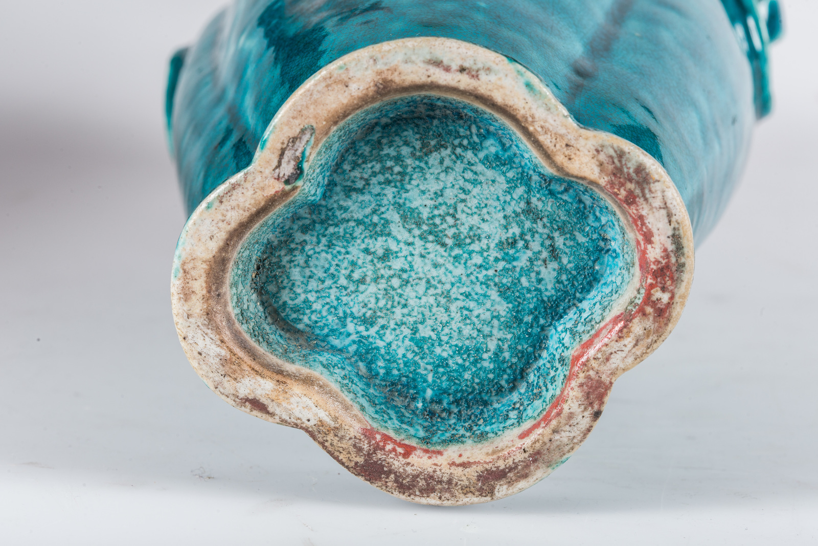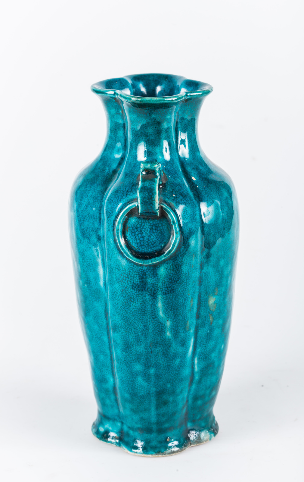 Chinese Art A pottery turquoise glazed lobed vase with double handles