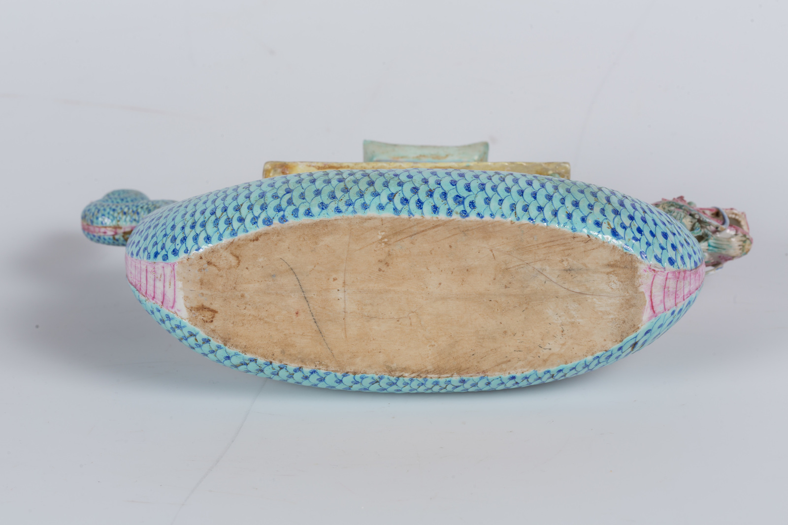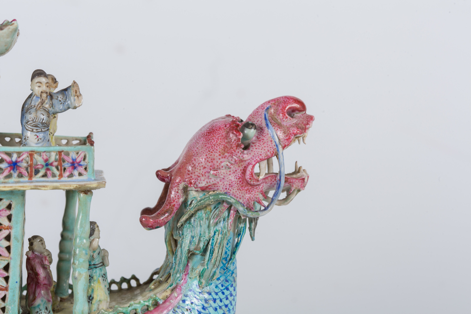 Arte Cinese Barca in ceramica smaltata Cina, dinastia Qing, XIX secolo . -. Cm 25,50 x 14,00. Veliero in forma di dragone azzurro e rosa che trasporta una cabina con dei personaggi.