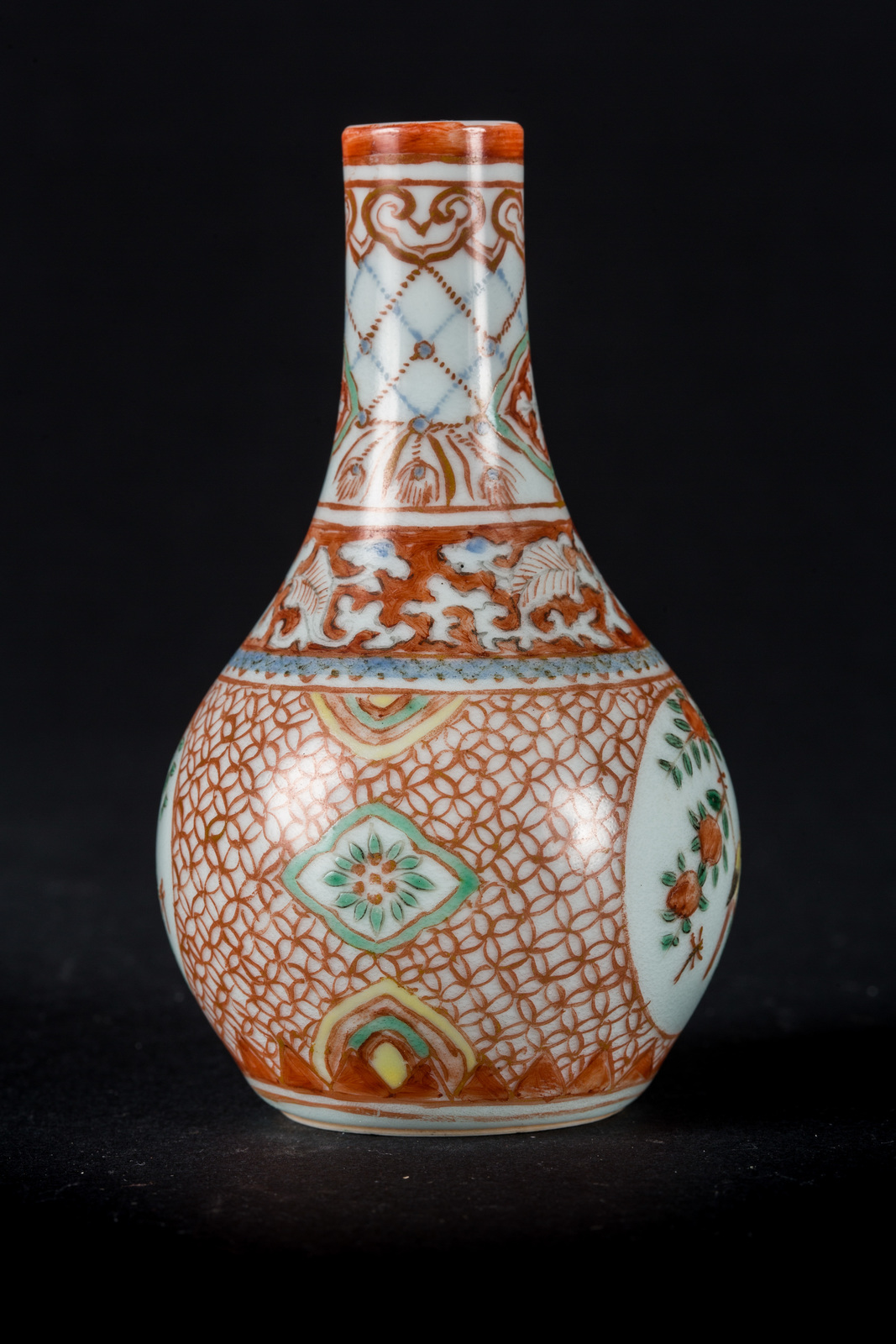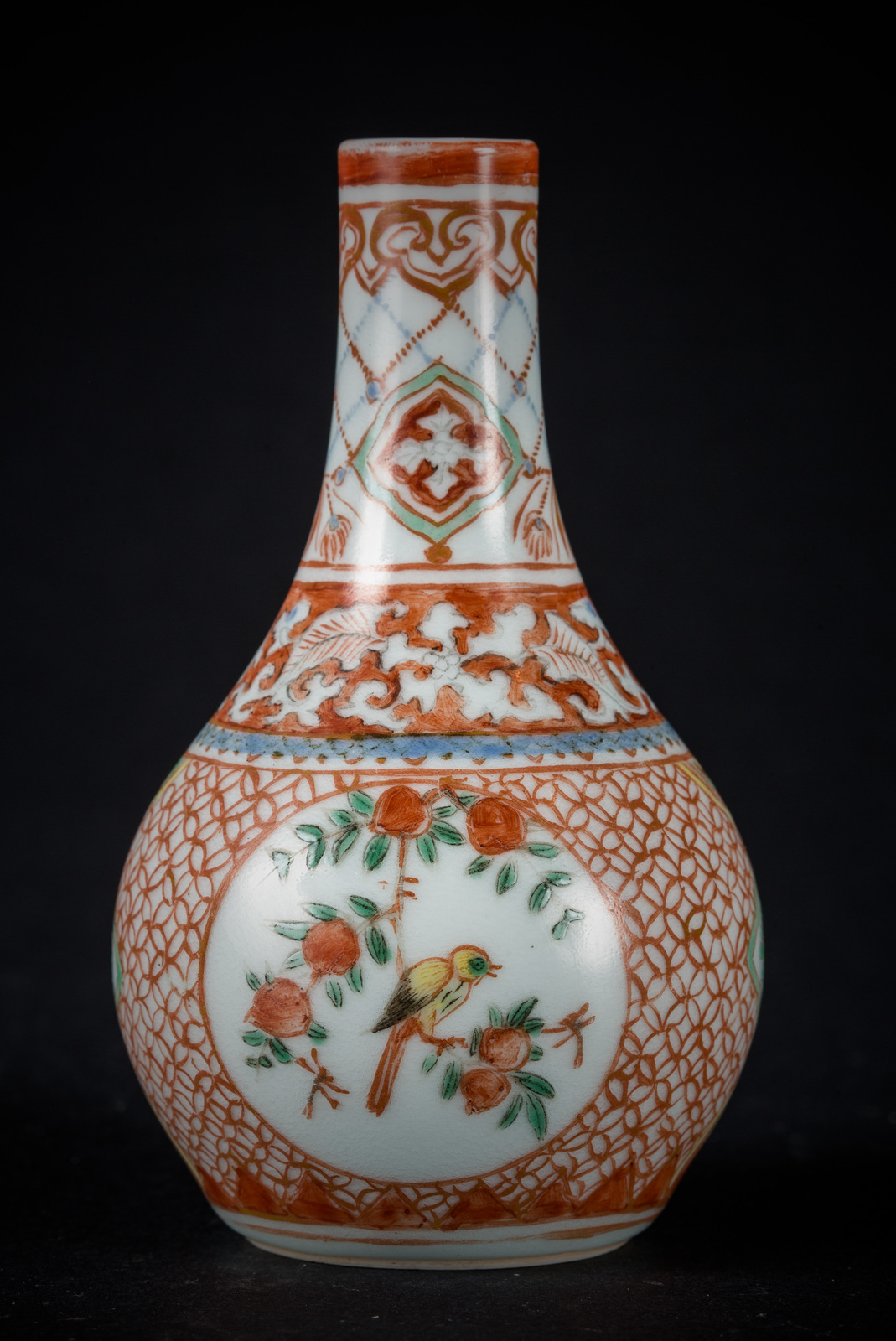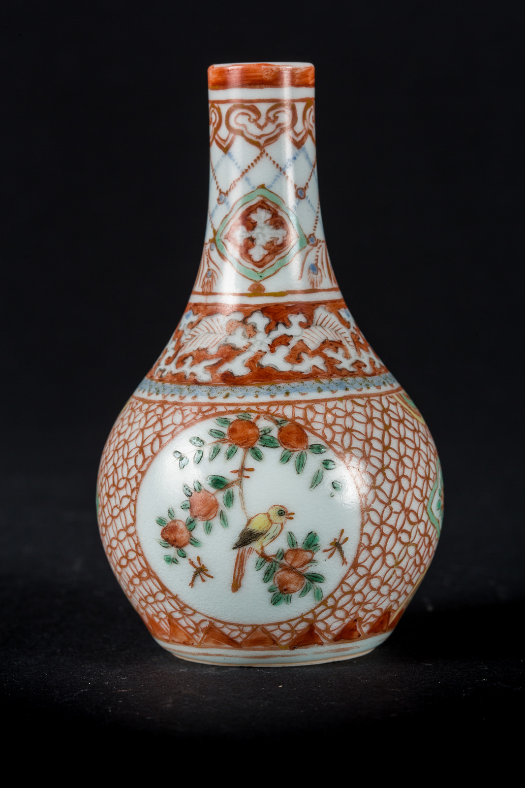 Cina, dinastia Qing, XIX secolo . -. Cm 6,00 x 11,00. Piccolo vaso con corpo globulare e collo stretto decorato con delicate riserve circolari contenenti un uccello su rami di pesco. Il resto della superficie mostra motivi decorativi astratti in smalto rosso sovracoperta con piccoli tocchi di blu cobalto sottocoperta.