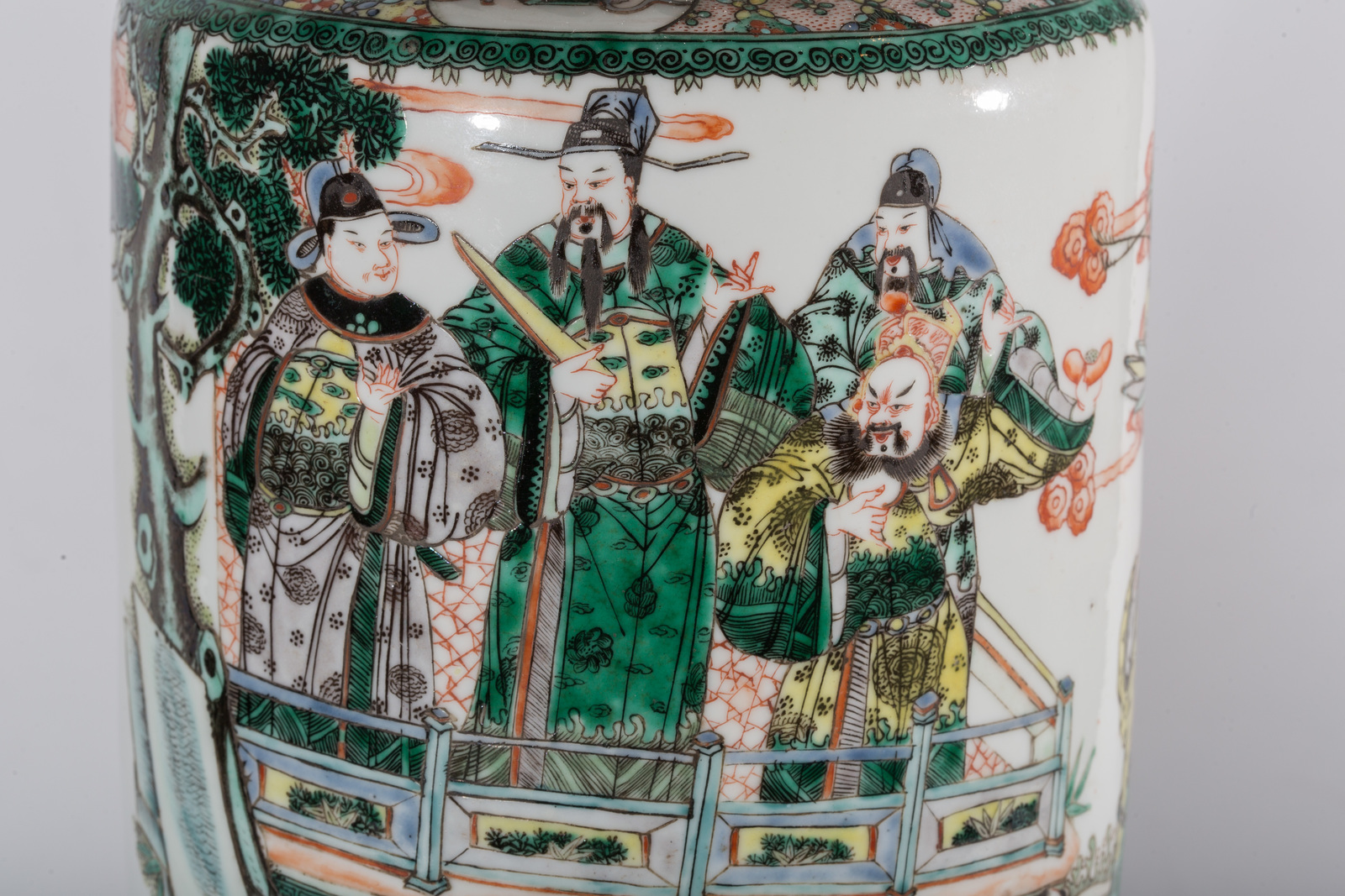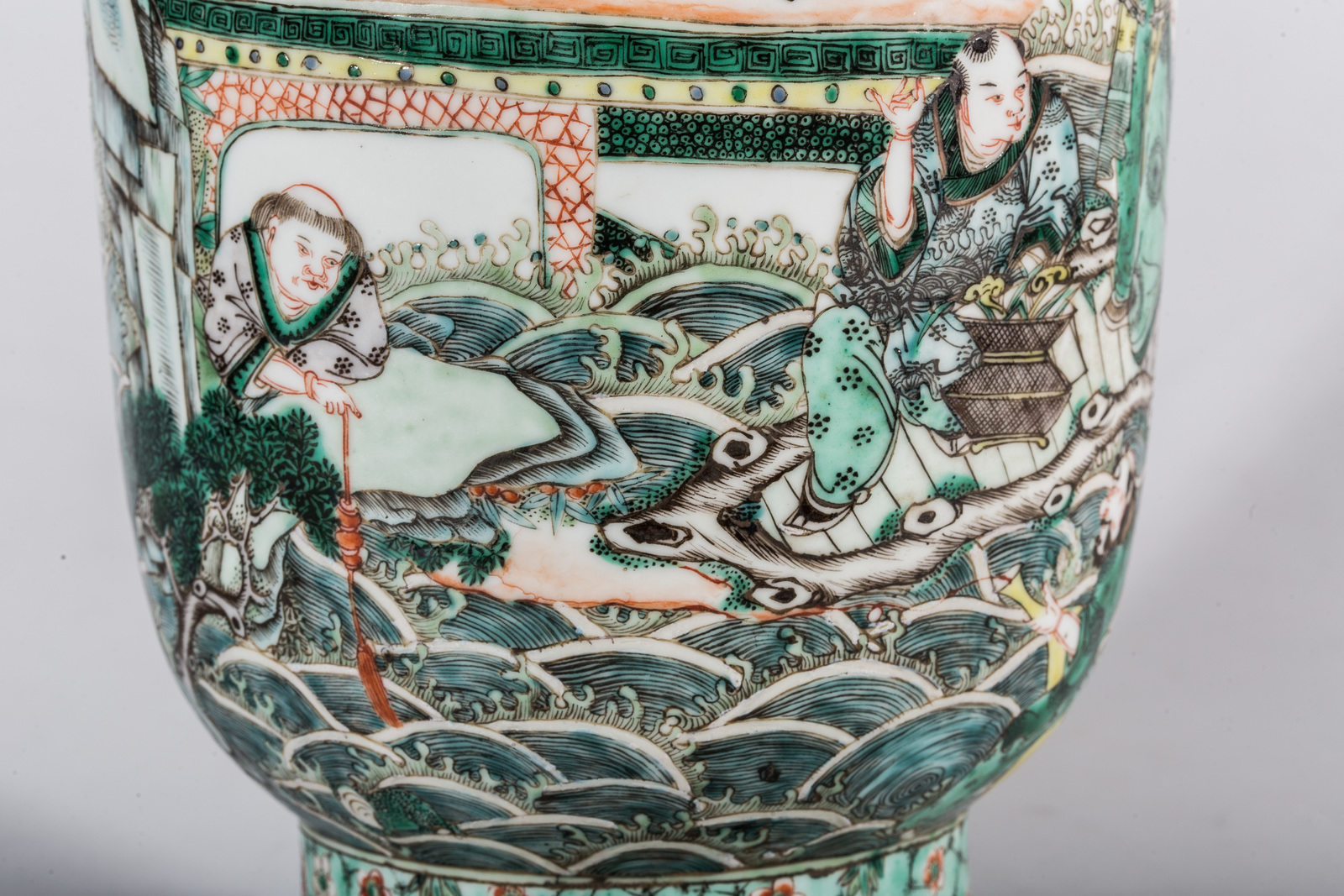 Cina, dinastia Qing, XIX secolo. -. Cm 17,00 x 45,50. Vaso a balaustro finemente dipinto con dignitari entro grandi riserve rettangolari. Lo sfondo mostra diversi motivi decorativi tra cui onde fluttuanti, nuvole e simboli astrologici. Marchio a quattro caratteri sulla base.