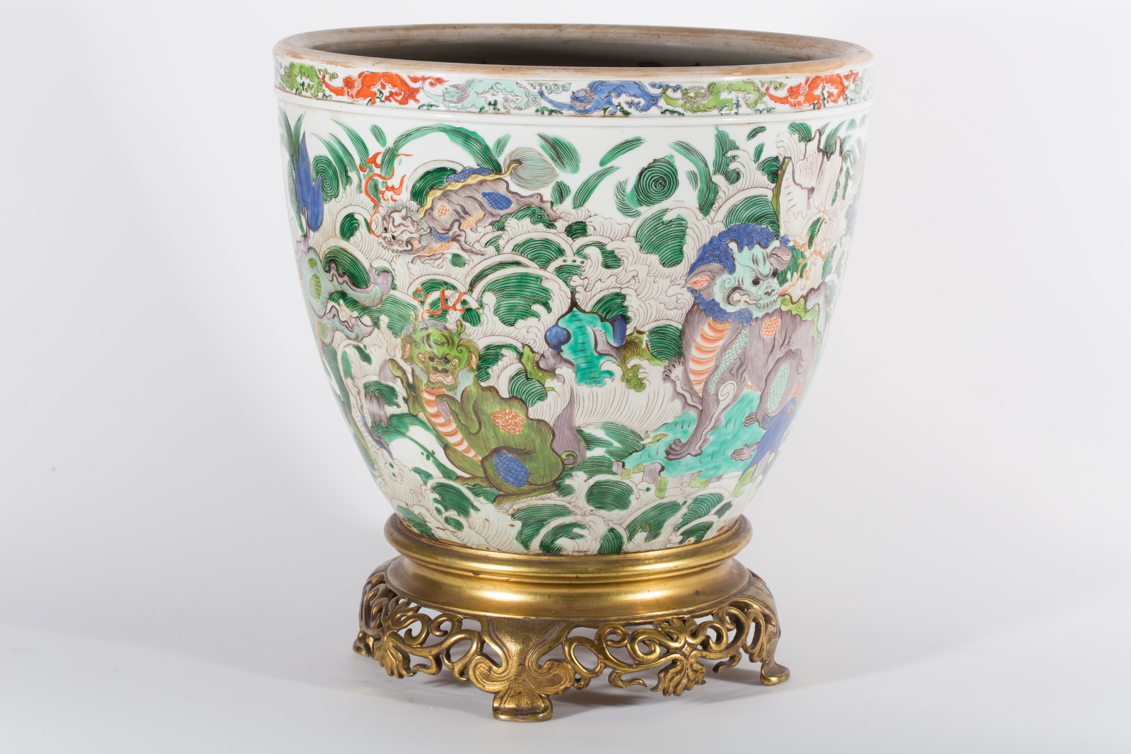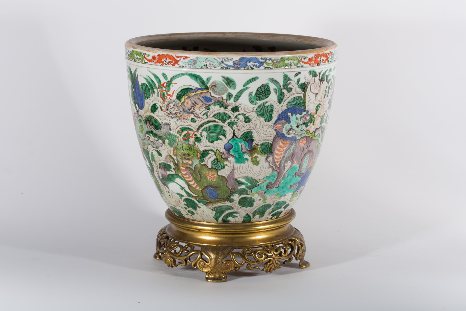 Arte Cinese Vasca per pesci in ceramica montata su bronzo