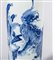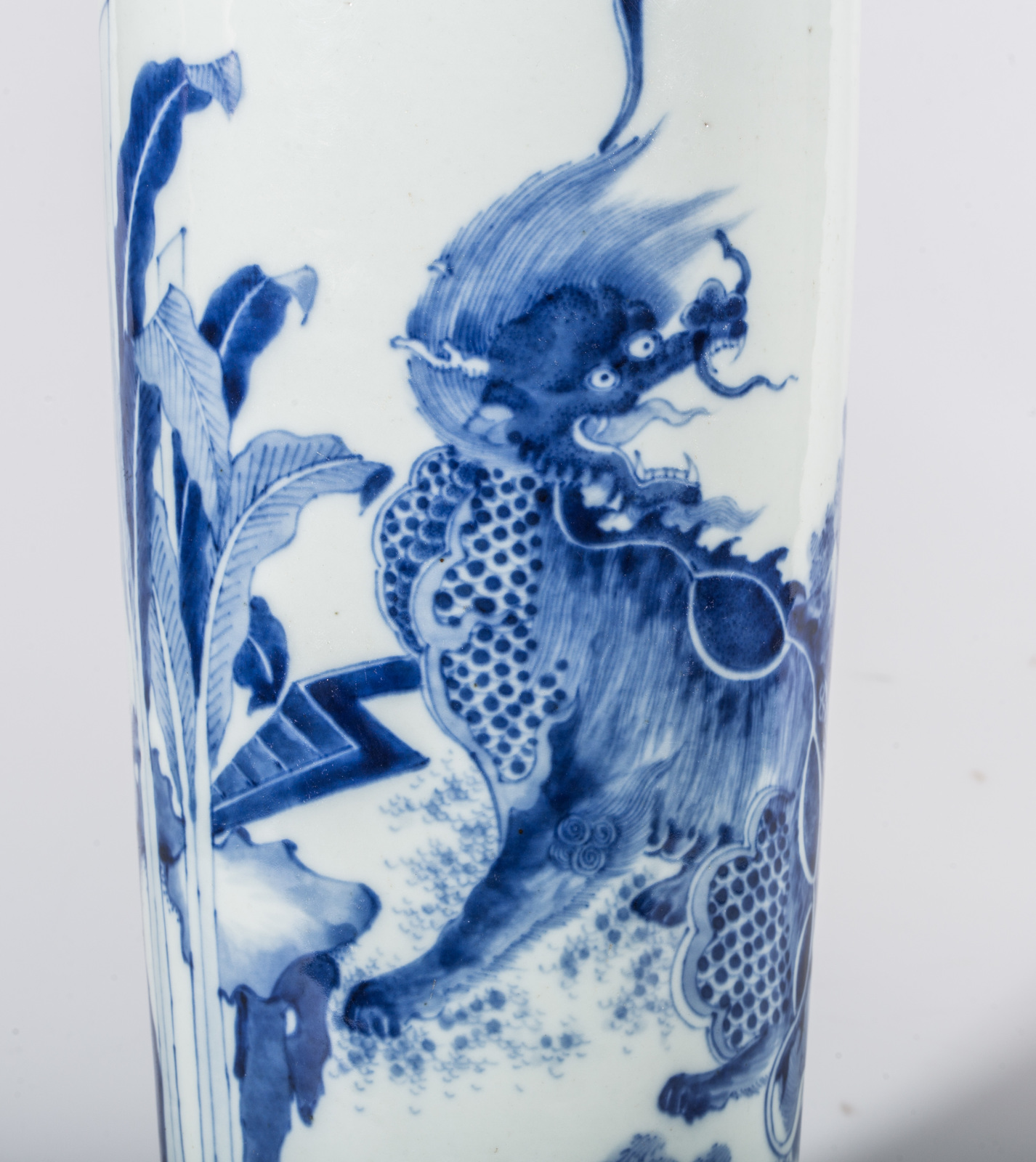 Cina, Epoca Transizione, XVII secolo . -. Cm 14,00 x 47,00. Alto vaso a rullo con margine superiore svasato e bocca estroflessa. La superficie è dipinta in blu cobalto sottocoperta con cani di fo in paesaggio.