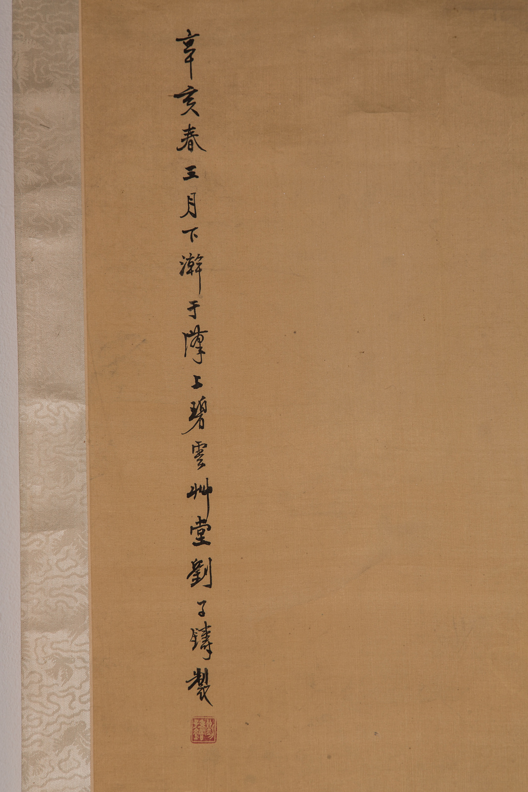 Cina, dinastia Qing, XIX secolo . -. Cm 67,00 x 130,00. Raffigurante la divinità stante tra rami fioriti di ciliegio e canne di bamboo. Iscrizione con sigillo dell'artista in alto a sinistra.