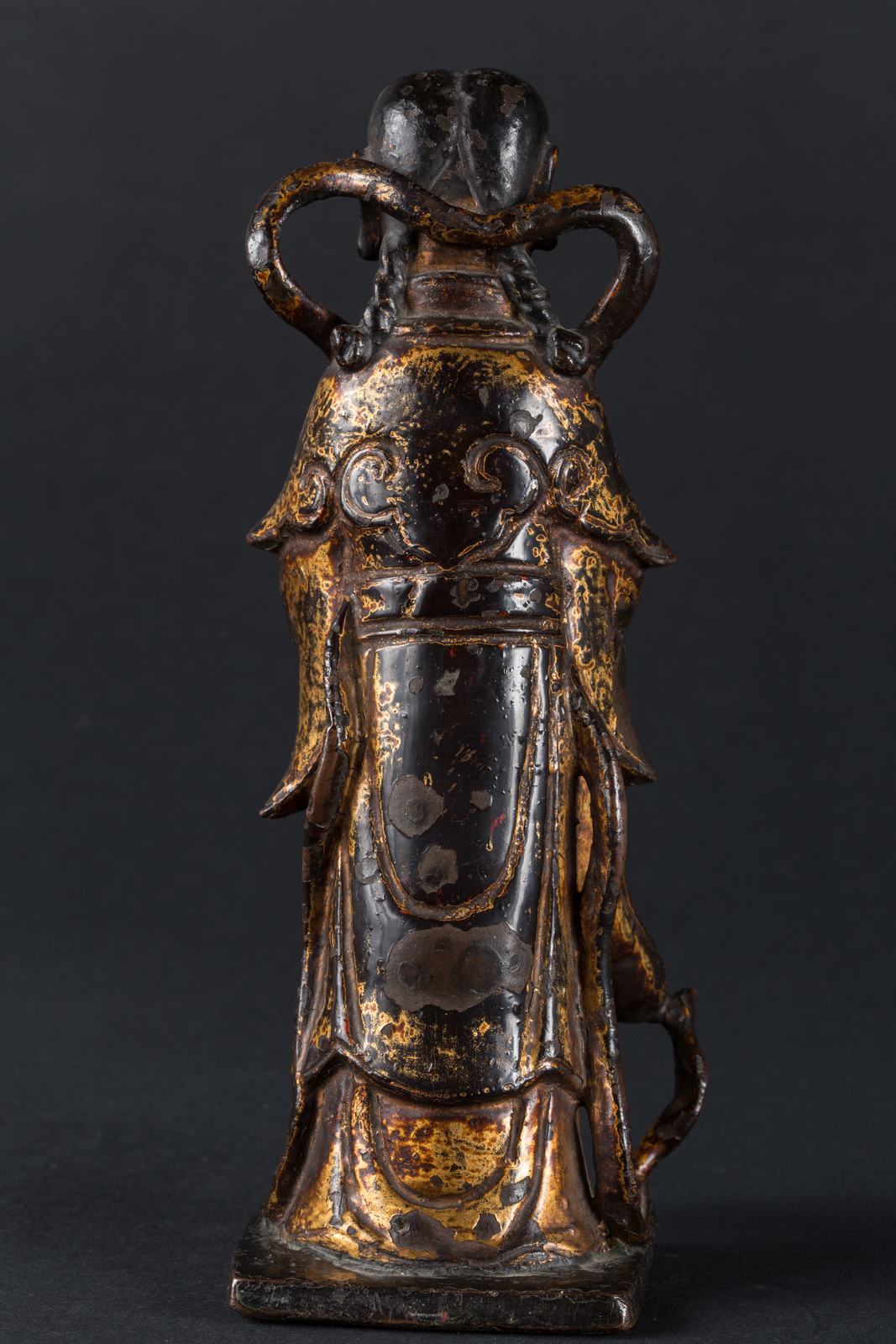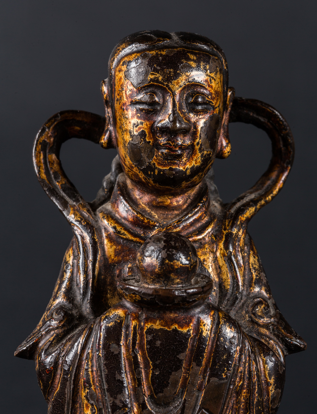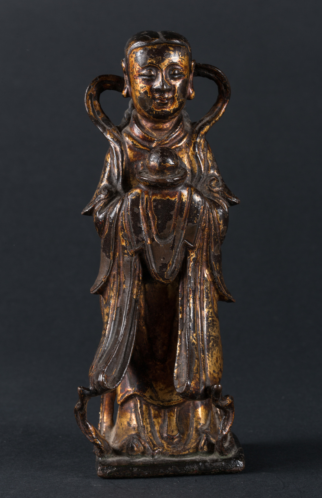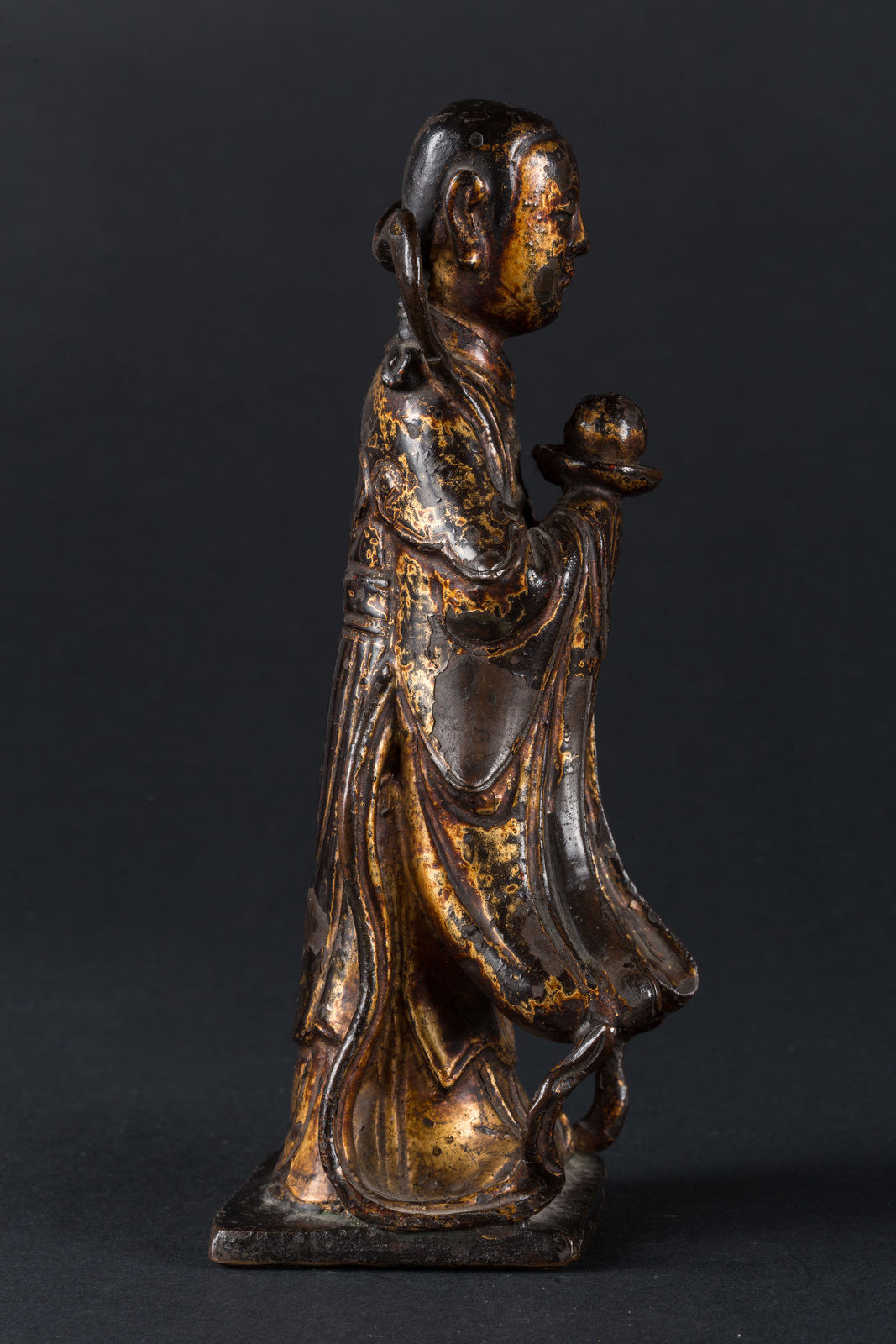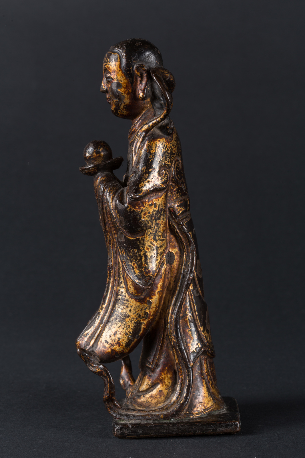 Chinese Art A lacquered bronze figure of a standing woman with a pearl China, Ming dynasty, 16th century . . Cm 8,00 x 22,00.