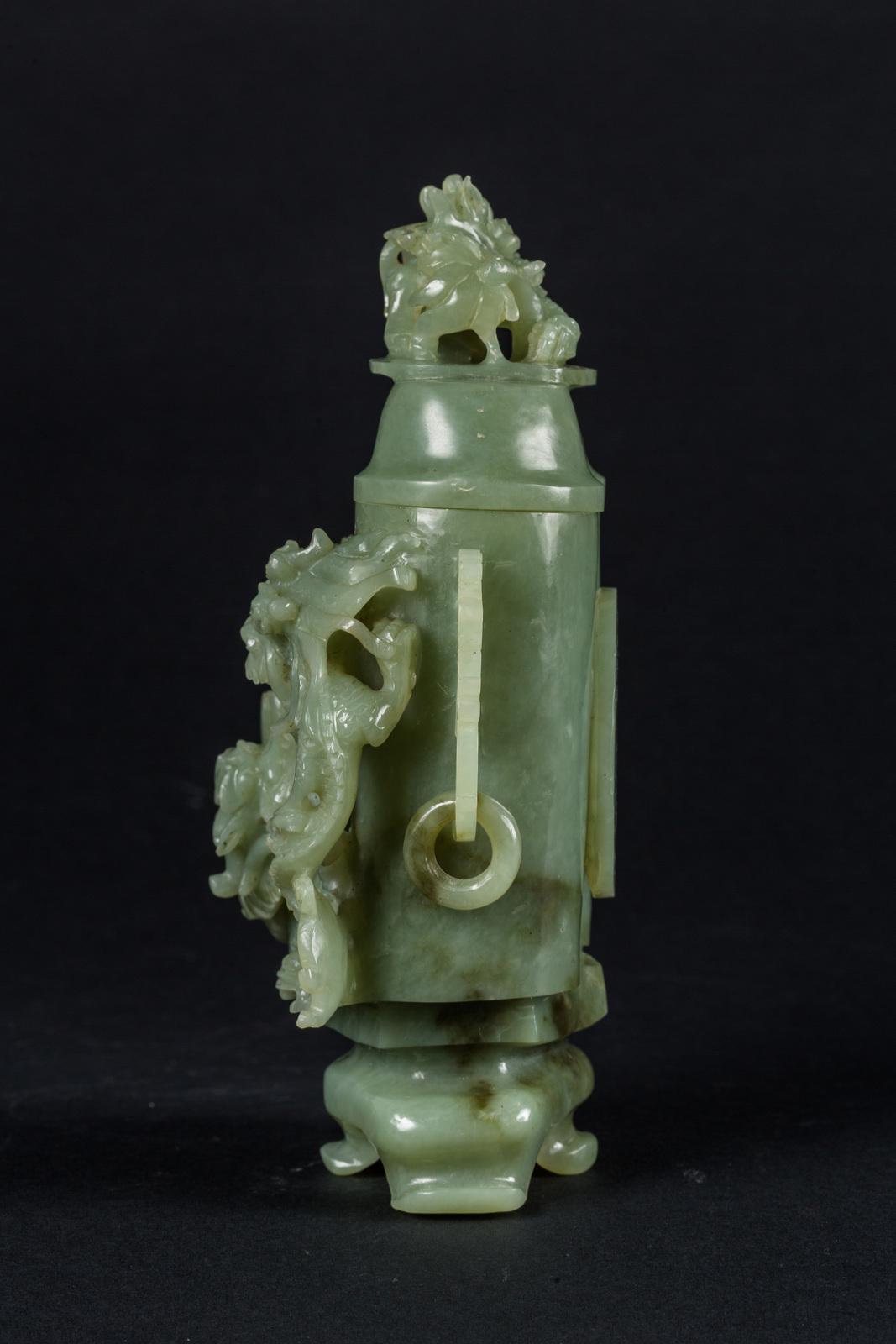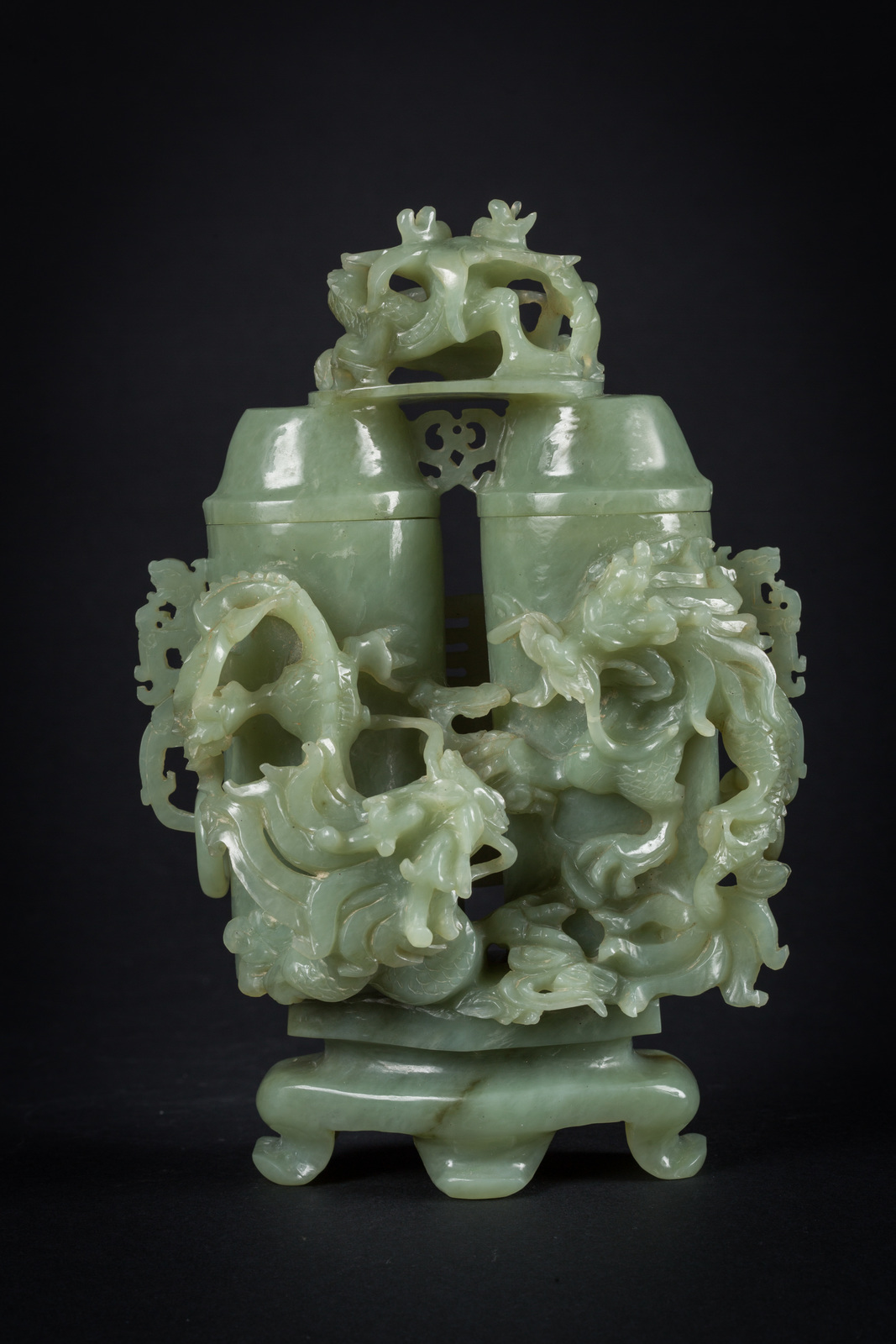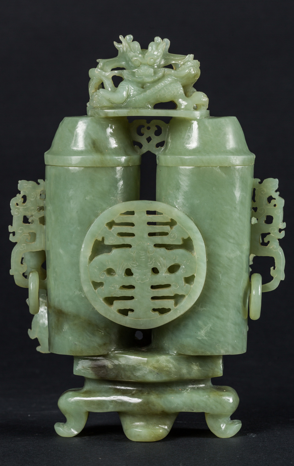 Cina, tardo XIX secolo . . Cm 15,00 x 22,00 x 9,00. Gruppo scultoreo composto da base su due livelli, doppia boccetta cilindrica e coperchio, decorato con draghi affrontati in rilievo, doppia ansa in stile arcaico e medaglione con simbolo del buon auspicio sul retro.
