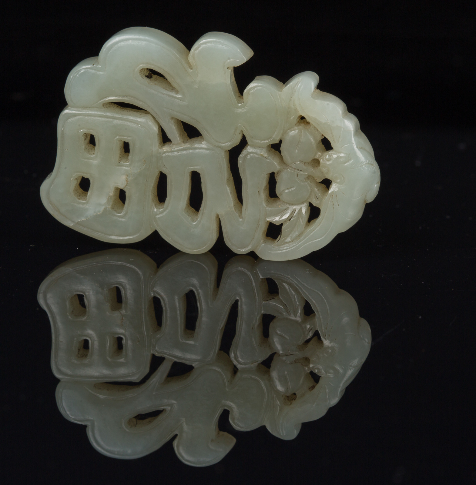Chinese Art A jade plaque carved with the good luck symbol, bat and peaches