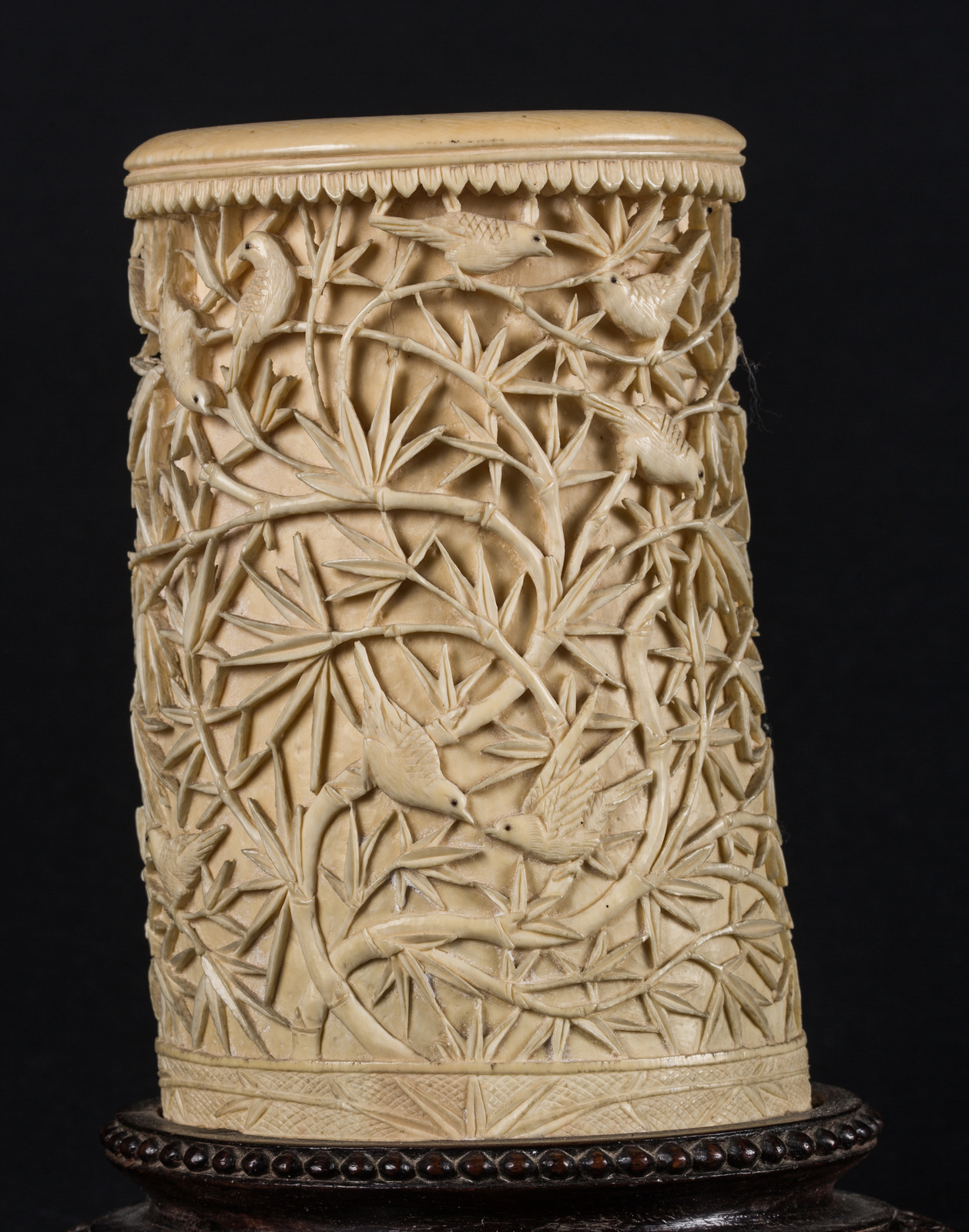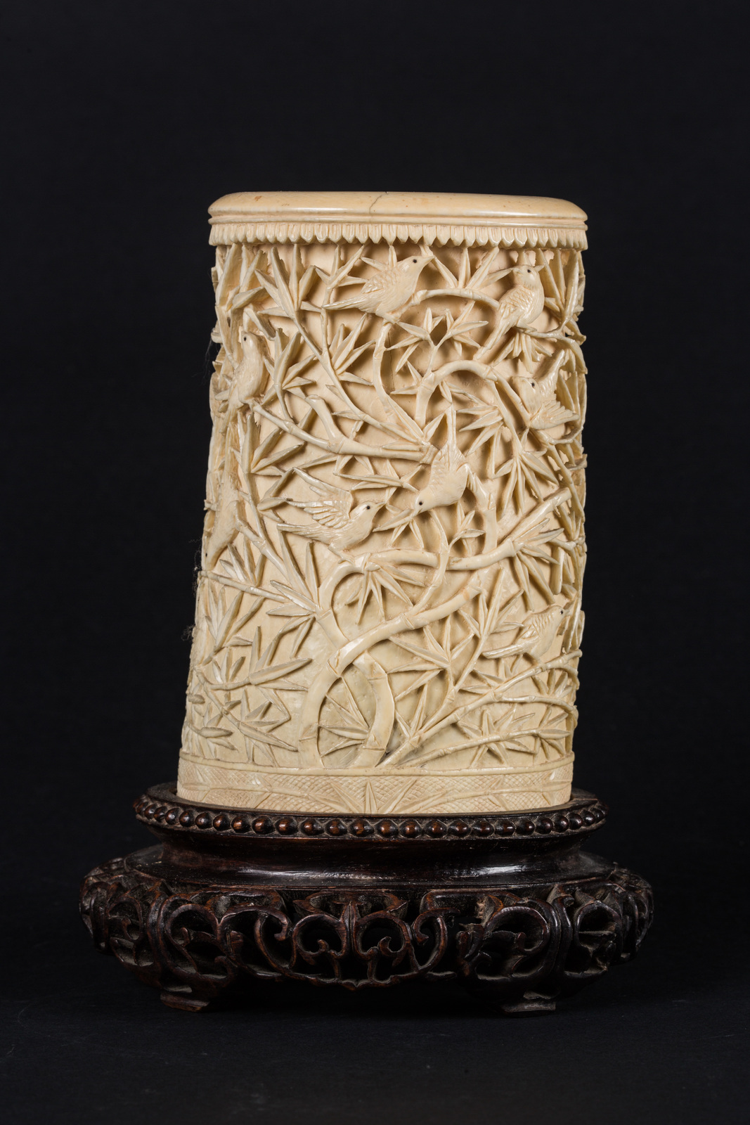 Chinese Art An ivory brush holder carved with birds on bamboo branches