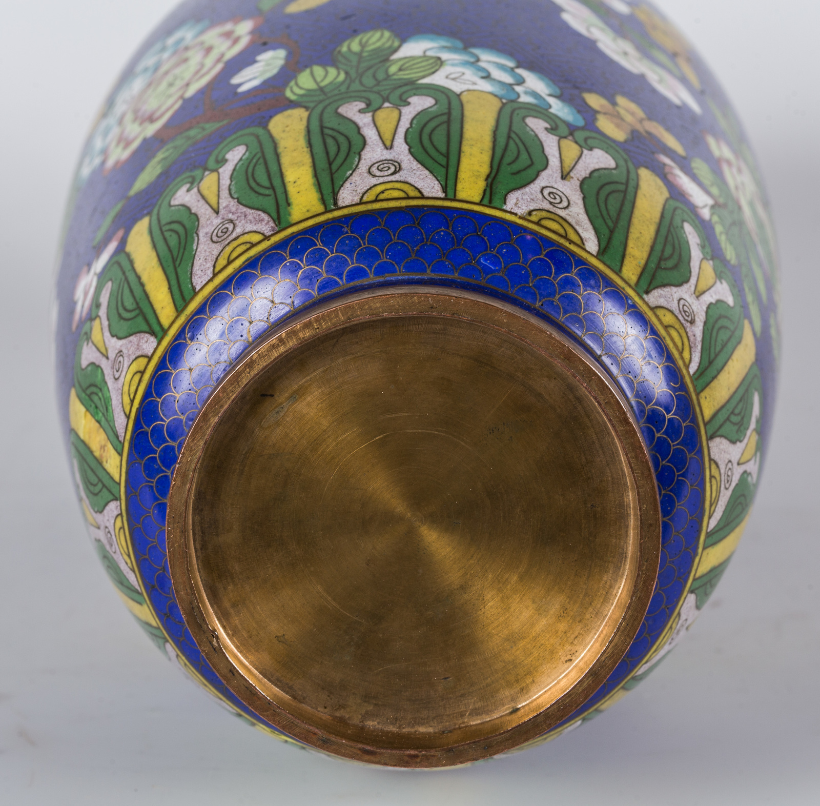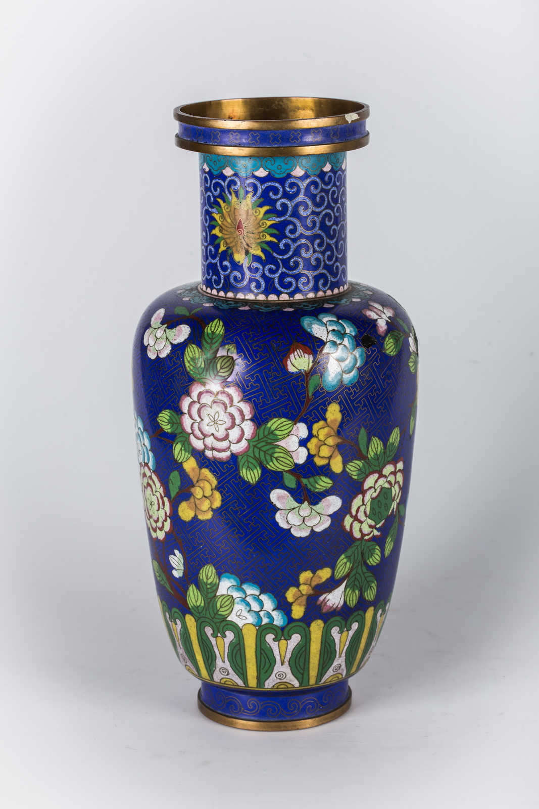 Chinese Art A cloisonné vase decorated with floral motifs over blue ground China, Qing dynasty, late 19th century. . Cm 15,50 x 36,50. Small damages.