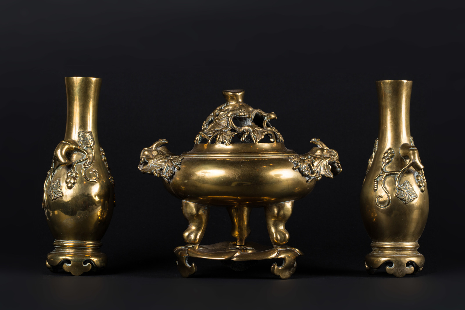 Chinese Art A bronze set composed of a censer with base and two bottles
