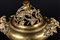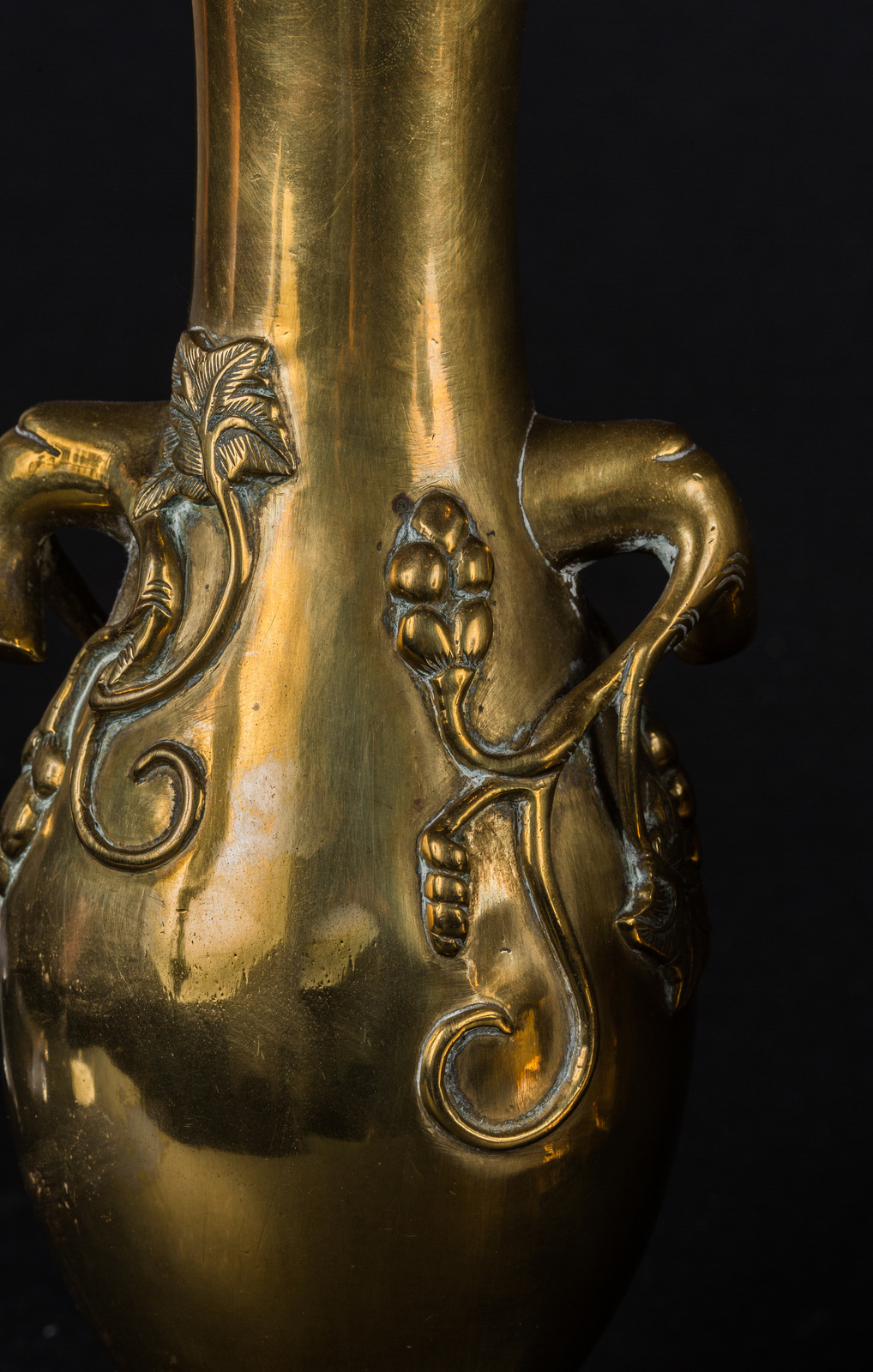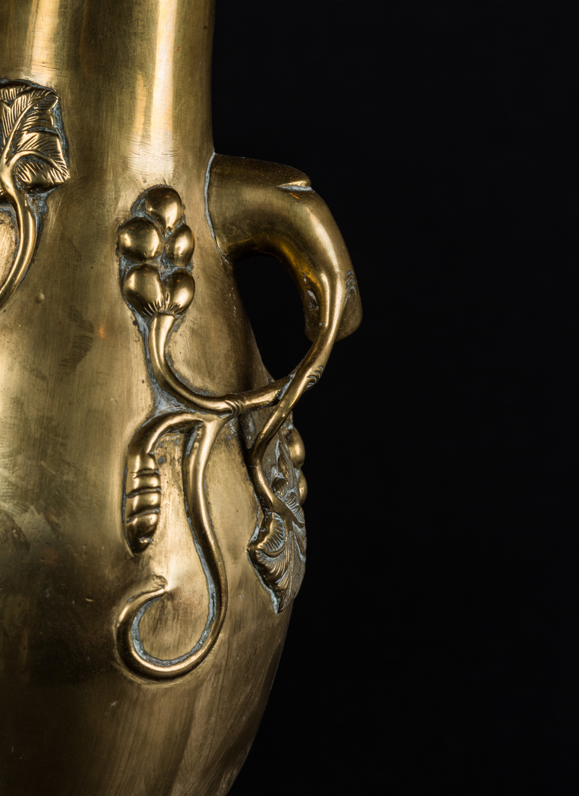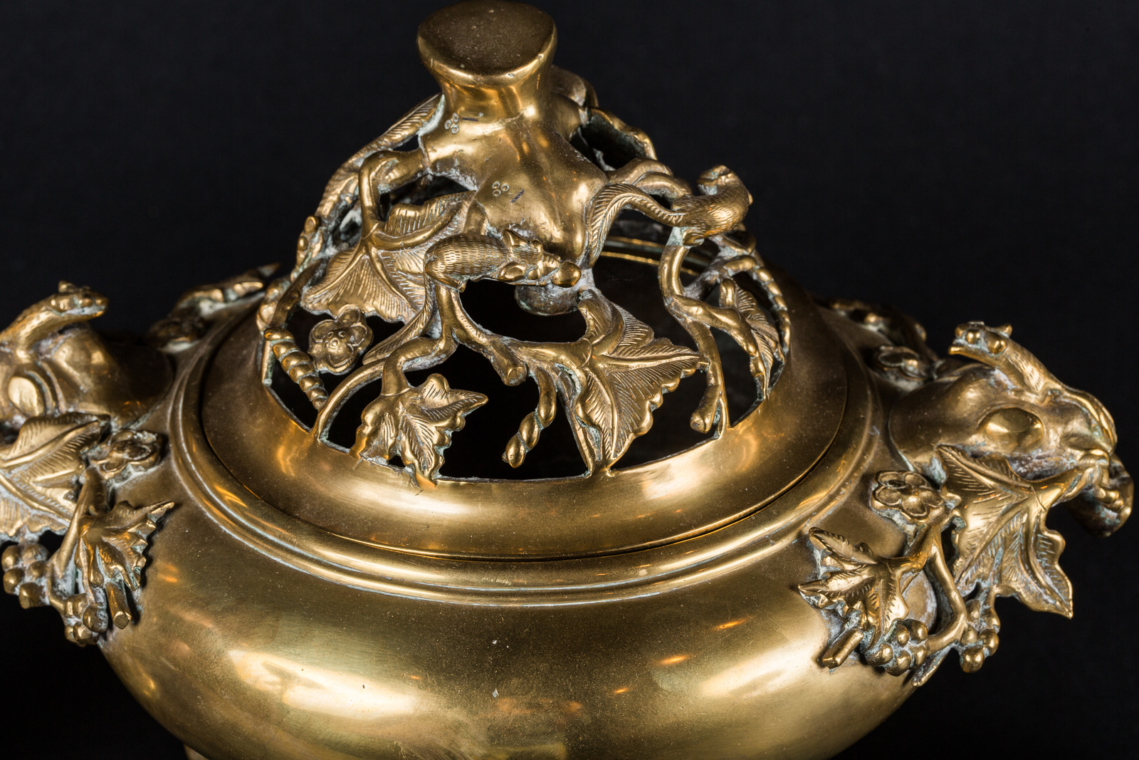Vietnam, XIX - XX secolo. -. Cm 24,00 x 25,00. Incensiere tripode su base sagomata a fiore e caratterizzato da doppia ansa decorata con motivi vegetali e zoomorfi ripresi sul coperchio, lavorato a traforo. Le due bottiglie risultano fuse in un unico pezzo con la base e sono abbellite da tralci in rilievo.