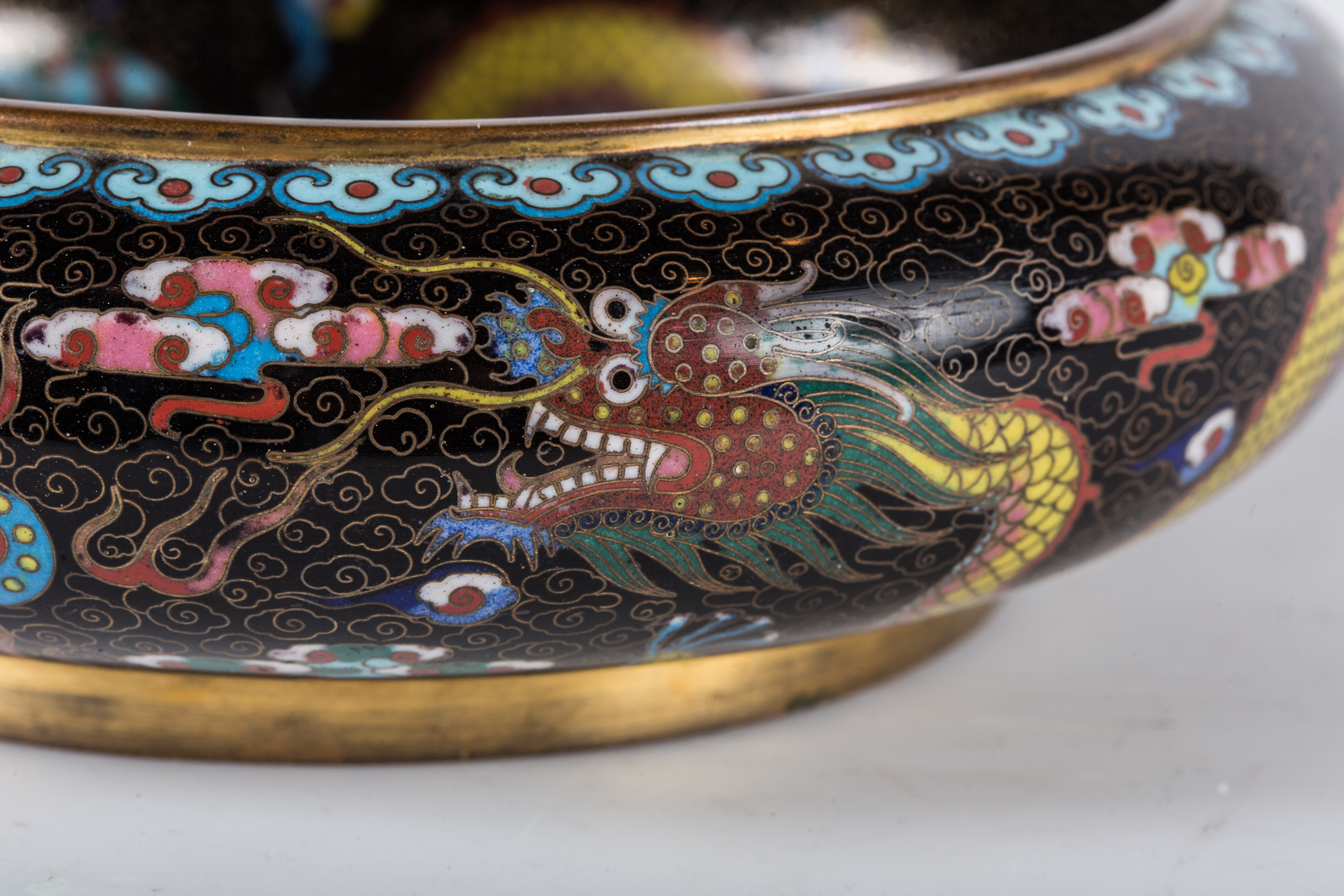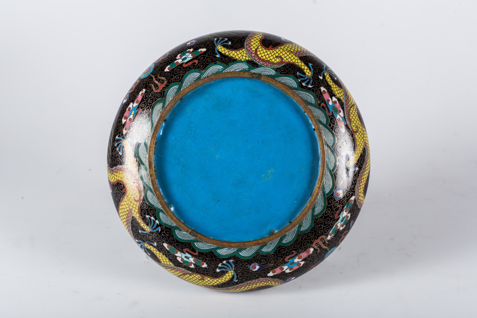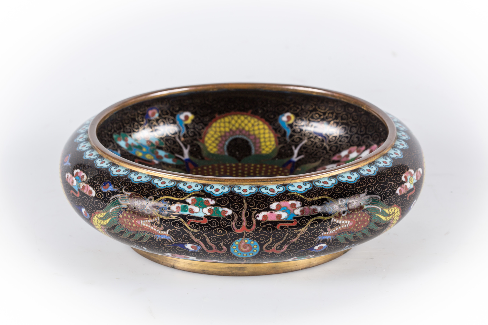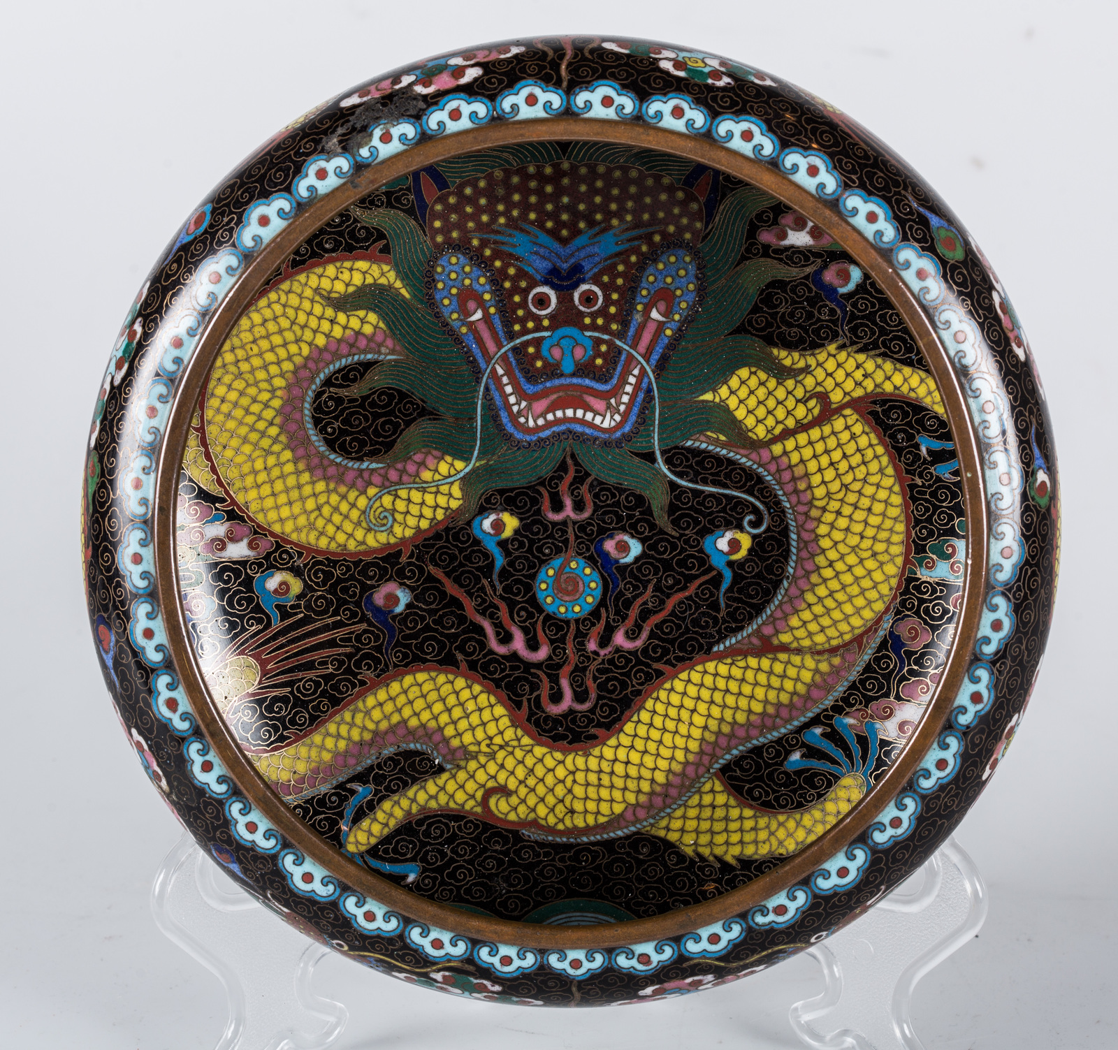 Cina, dinastia Qing, periodo Tongzhi, metà XIX secolo . -. Cm 21,00 x 6,00. Basso bacile con pareti arrotondate realizzato in smalto cloisonnè a fondo nero decorato con drago centrale, teste di ruyi sul bordo esterno e motivi geometrici a nuvola.