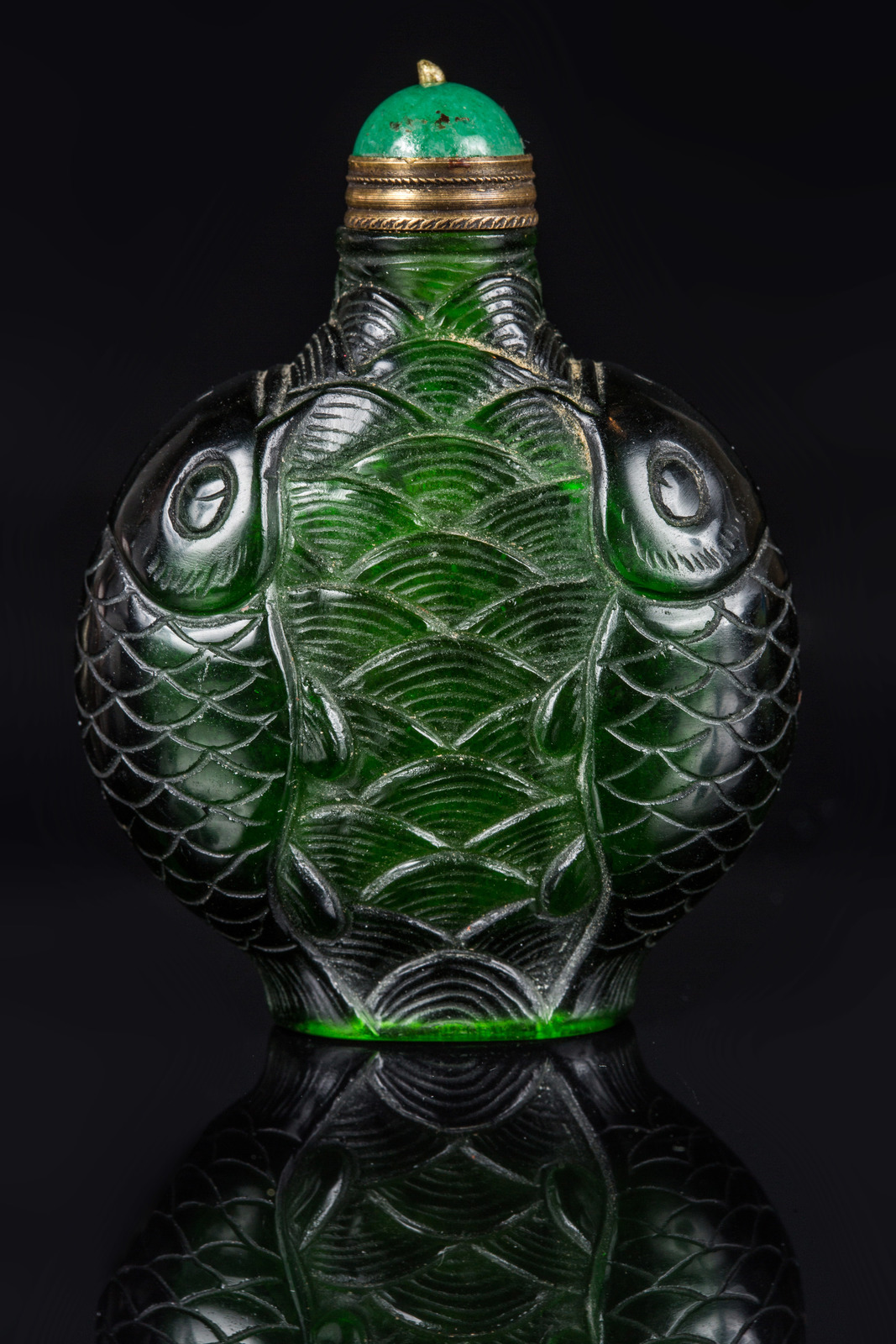 Chinese Art A green Beijing glass snuff bottle carved with fishes and waves China, 19th - 20th century . . Cm 5,00 x 7,00 x 2,00.