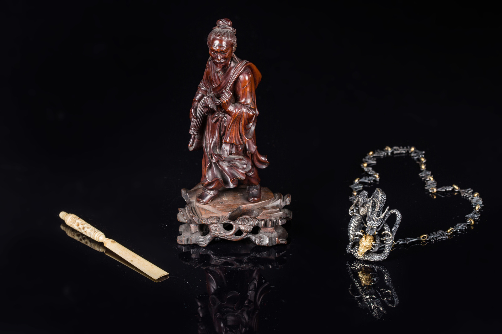 Chinese Art Lot composed of: an ivory spatula, a necklace with dragon pendant and a wooden carved figure