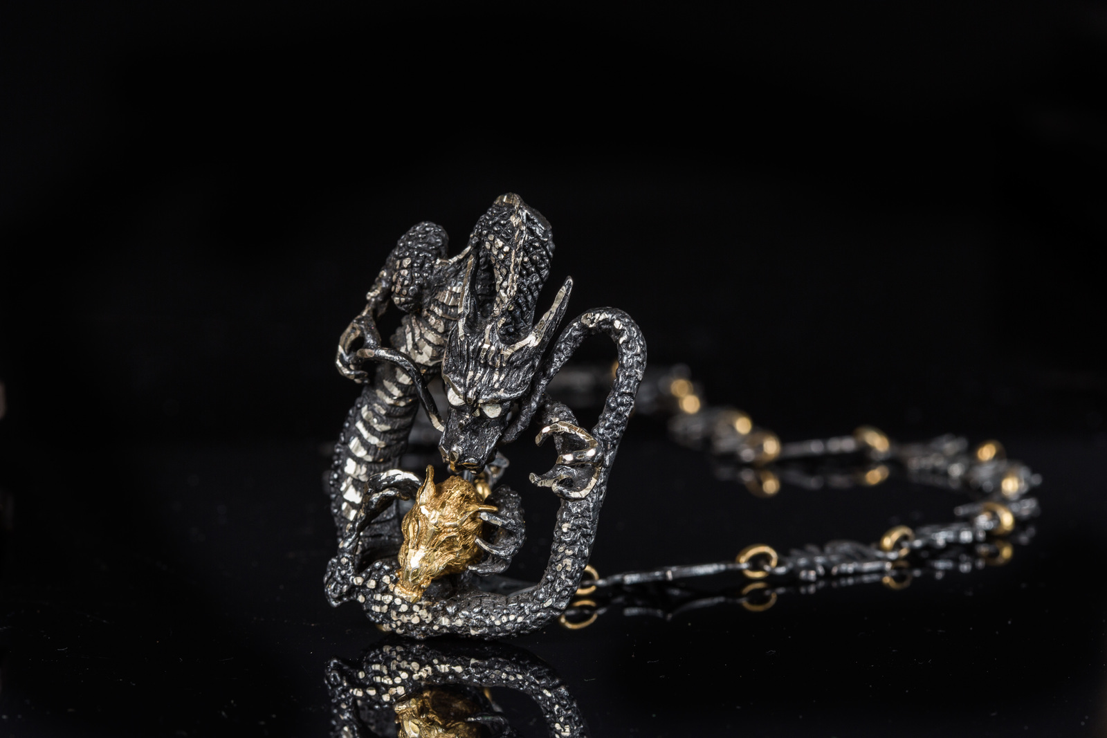 Collana con ciondolo/spilla raffigurante un drago che tiene la testa di un cinghiale: 6 cm