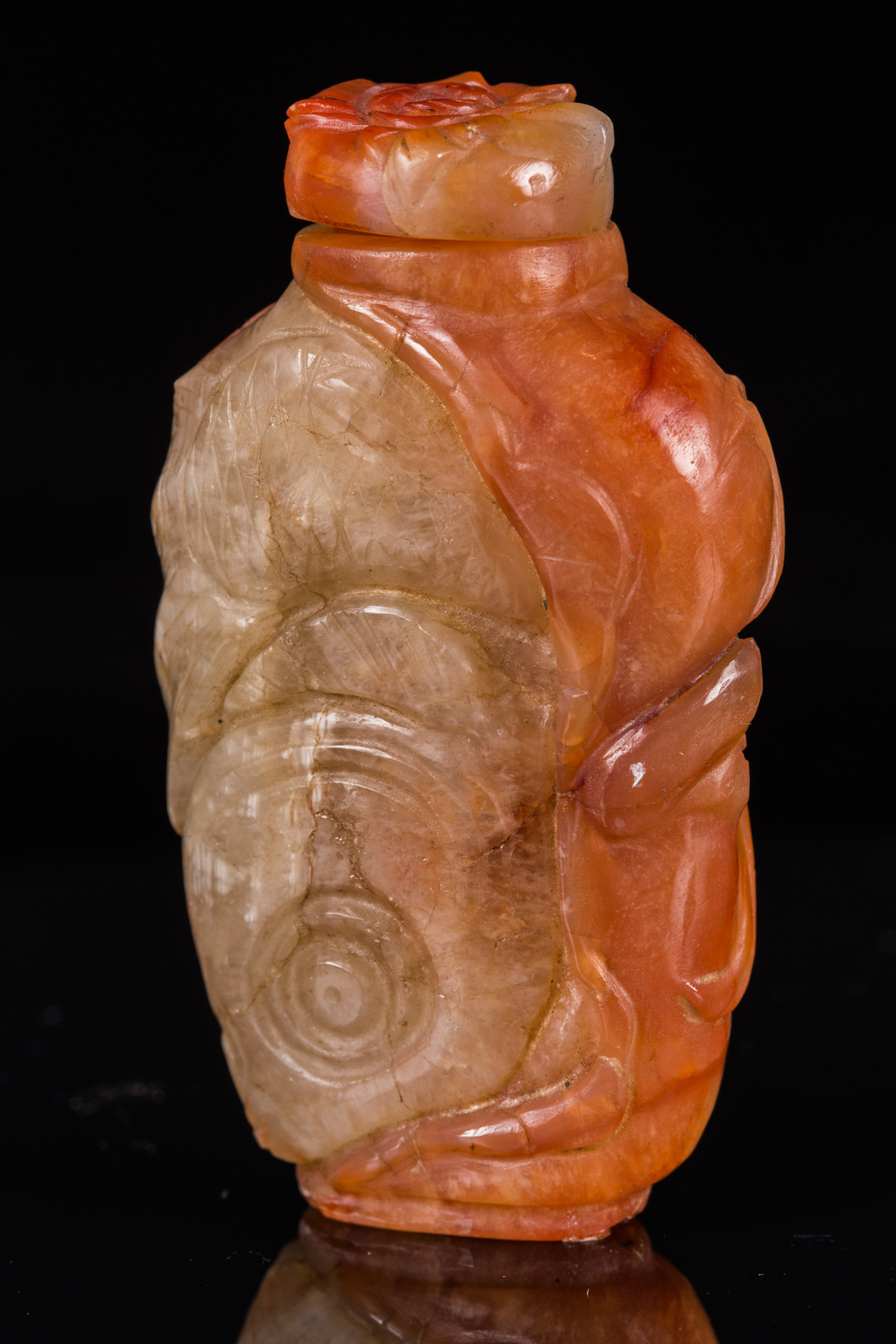Arte Cinese Tabacchiera in agata arancione intagliata con motivi vegetali