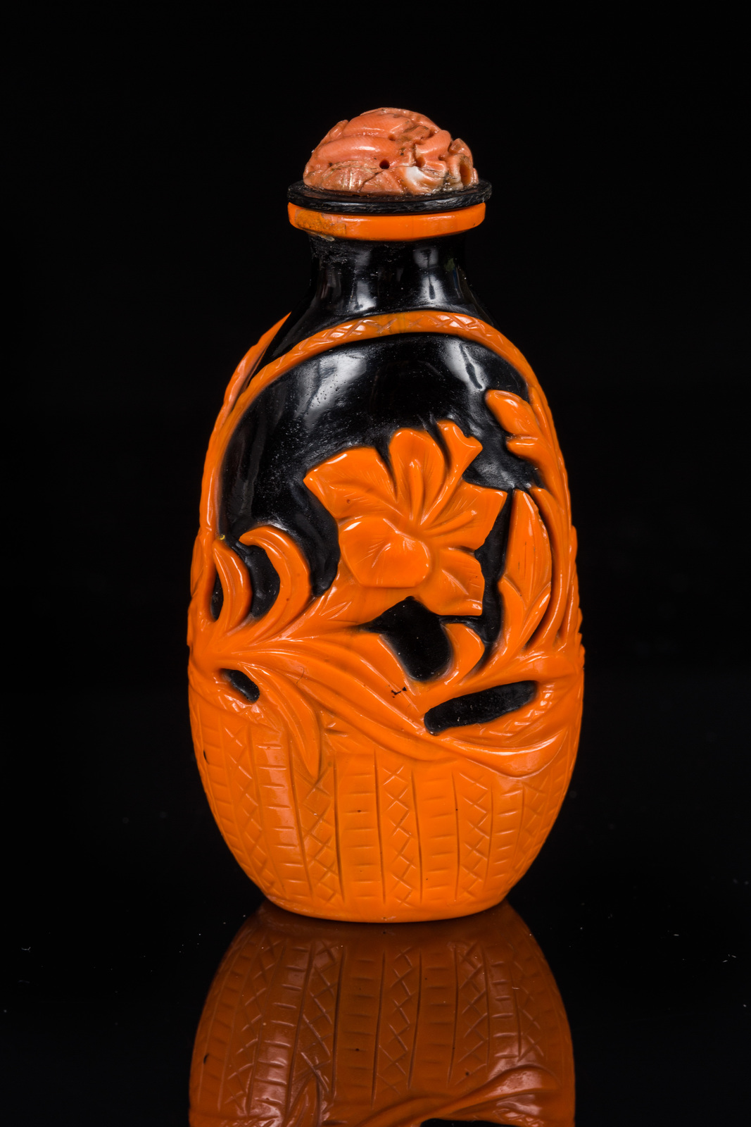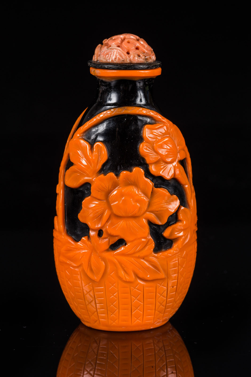 Arte Cinese Tabacchiera nera in vetro di Pechino con fiori arancioni e tappo in corallo