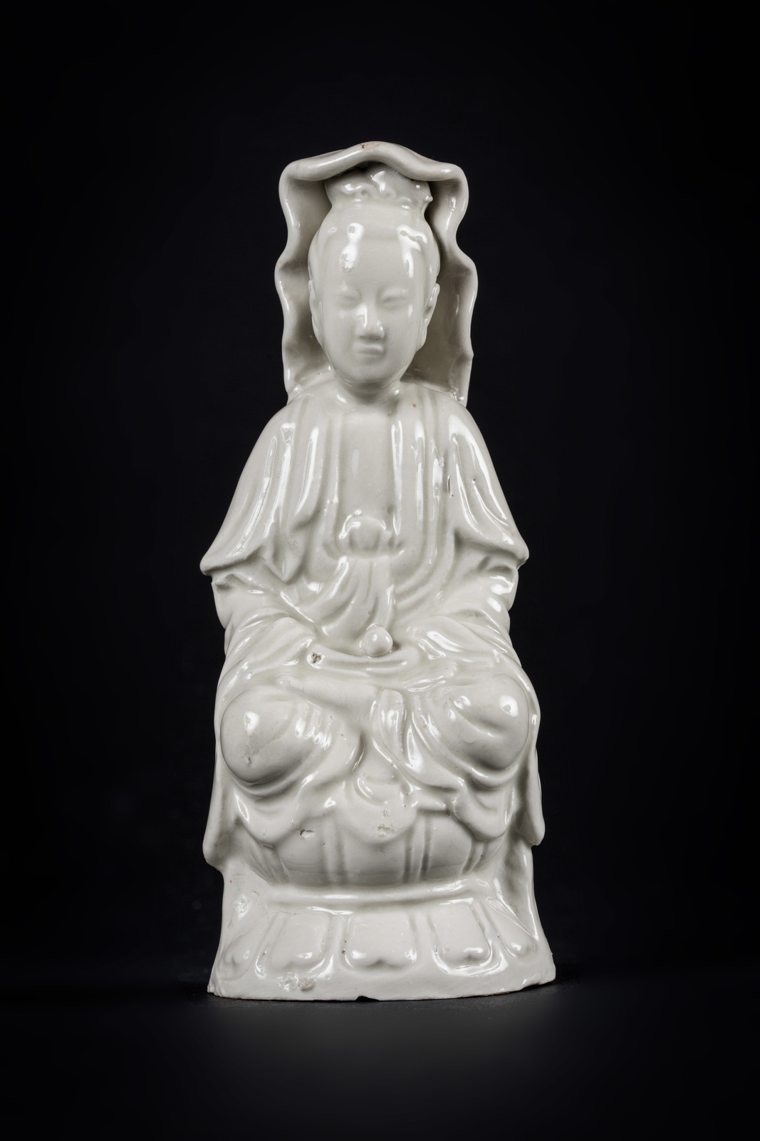 Arte Cinese Figura in porcellana bianco di Cina raffigurante Guanyin Cina, dinastia Qing, XIX secolo. -. Cm 7,50 x 18,50. Raffigurante la divinità seduta in padmasana su base a doppio fiore di loto.