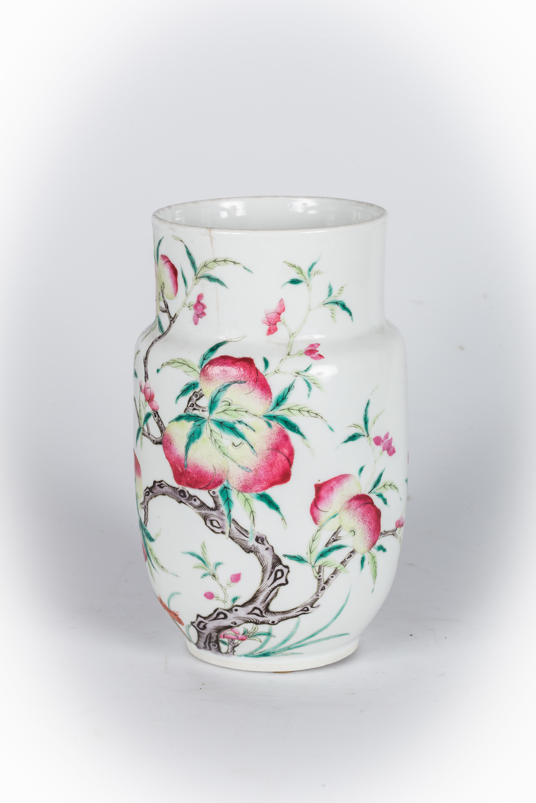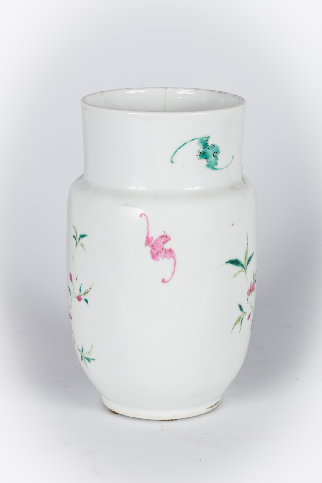 Arte Cinese A porcelain famille rose vase painted with peaches and a bat and bearing a mark at the base