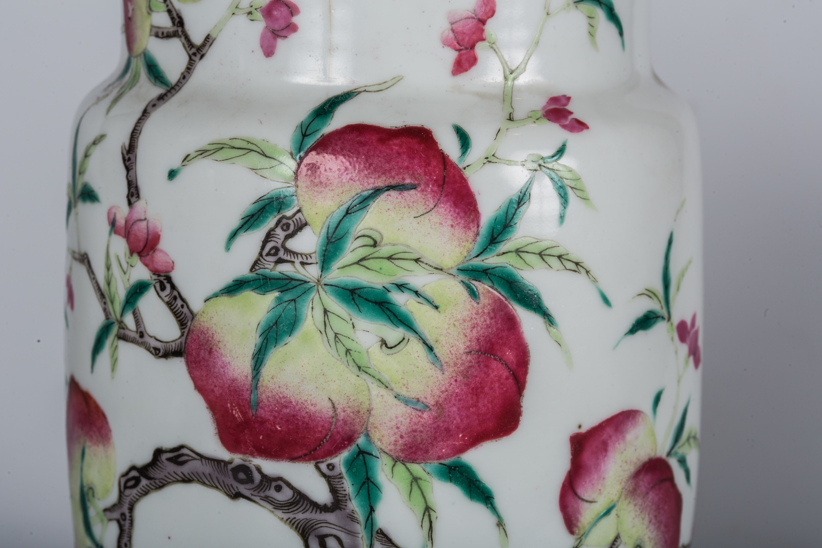Arte Cinese Vaso in porcellana famiglia rosa dipinto con pesche. Marchio alla base