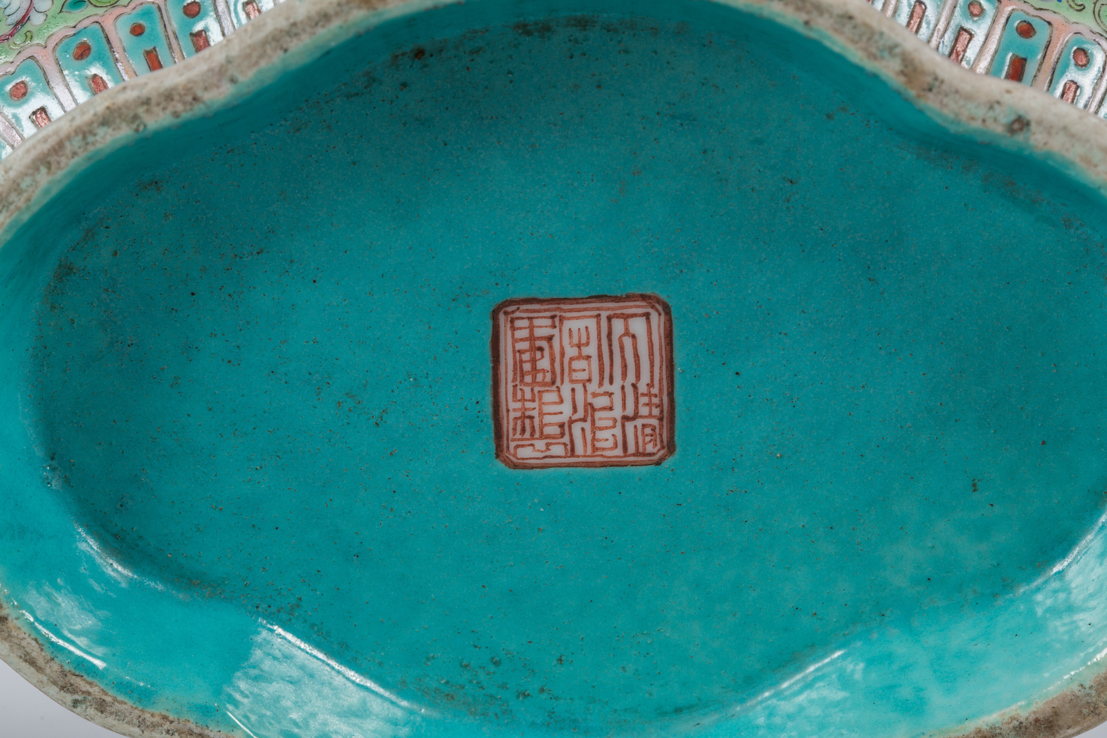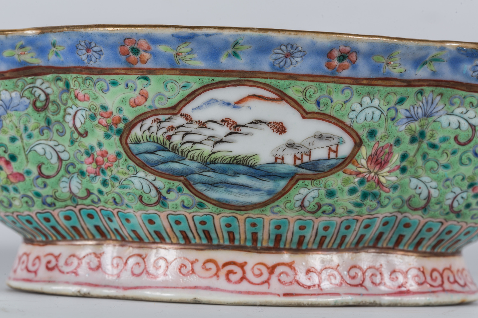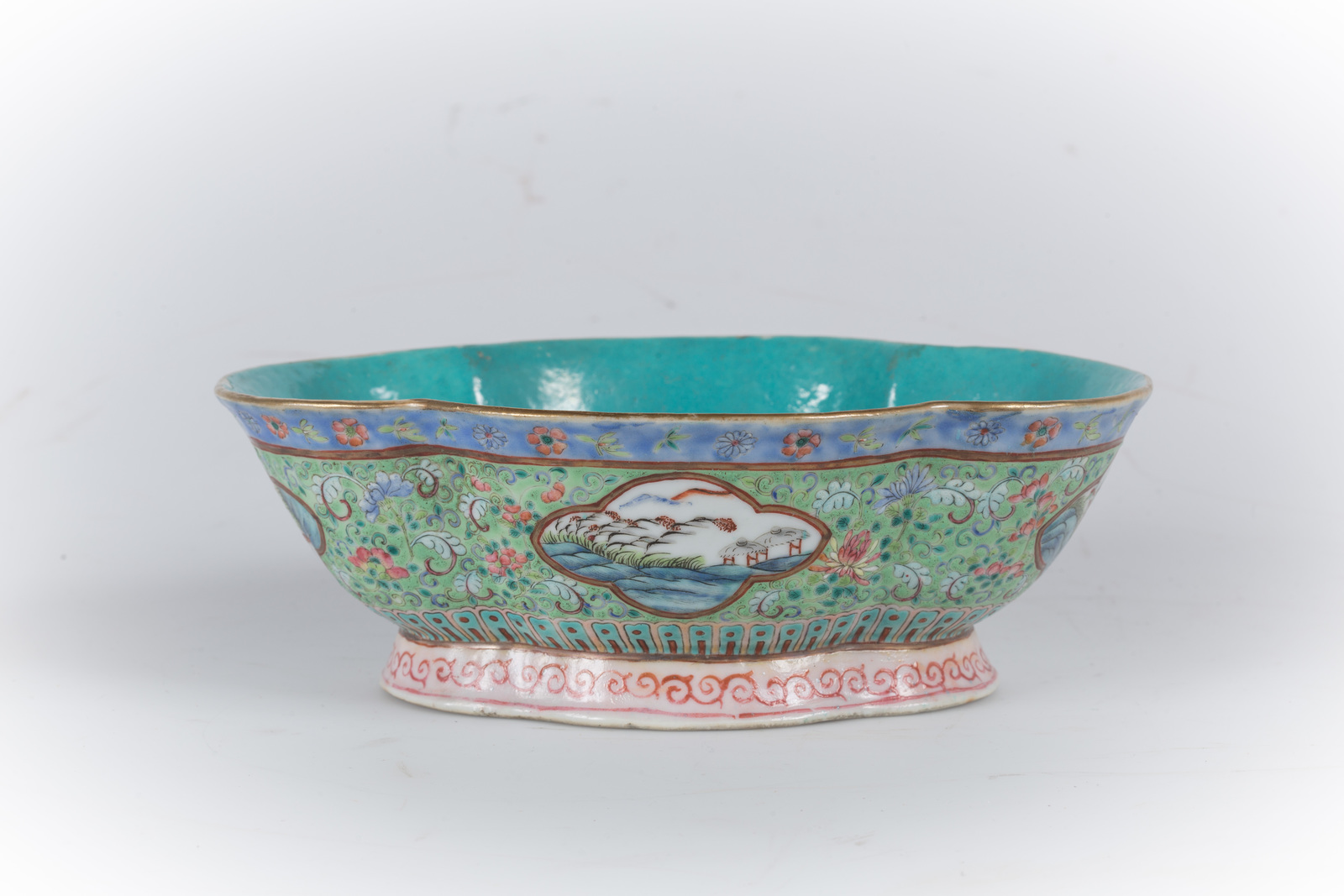 Arte Cinese A lobed polycrome bowl painted with landscapes over green floral ground and bearing a Tongzhi seal mark at the base