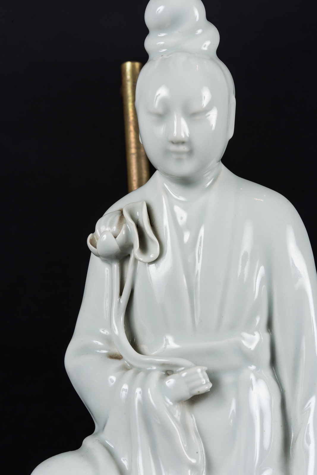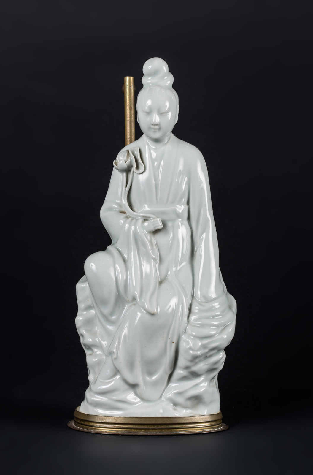 Arte Cinese Bianco di Cina raffigurante Guanyin con tracce di un montaggio a lampada