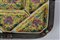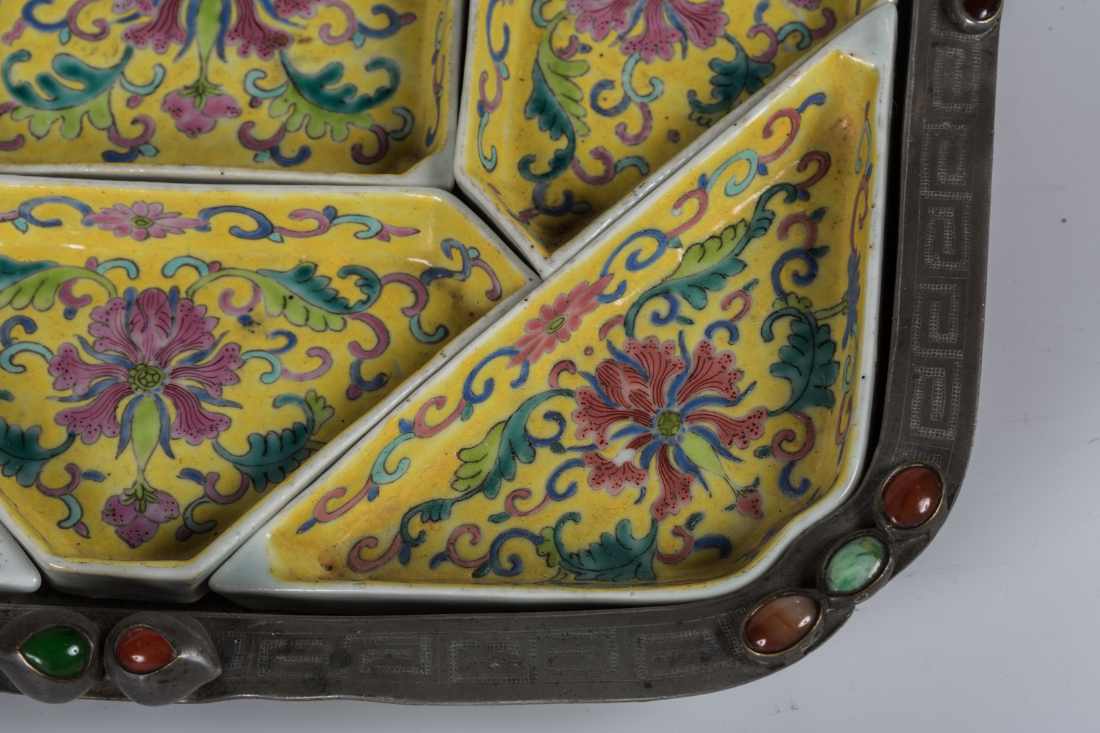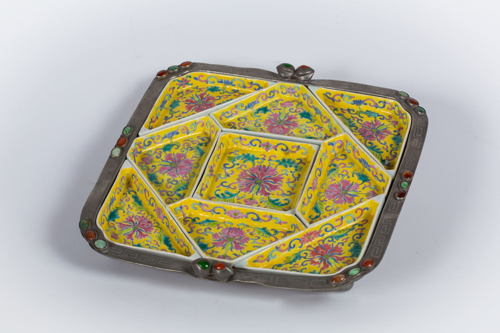 Cina, XIX secolo . -. Cm 30,00. in forma quadrata, composta di piccoli vassoio in composizione geometrica, decorata con tralci e peonie su fondo giallo e contenuta in vassoio in peltro decorato con motivi vegetali ed ornato con corniole, giada e vetri colorati.