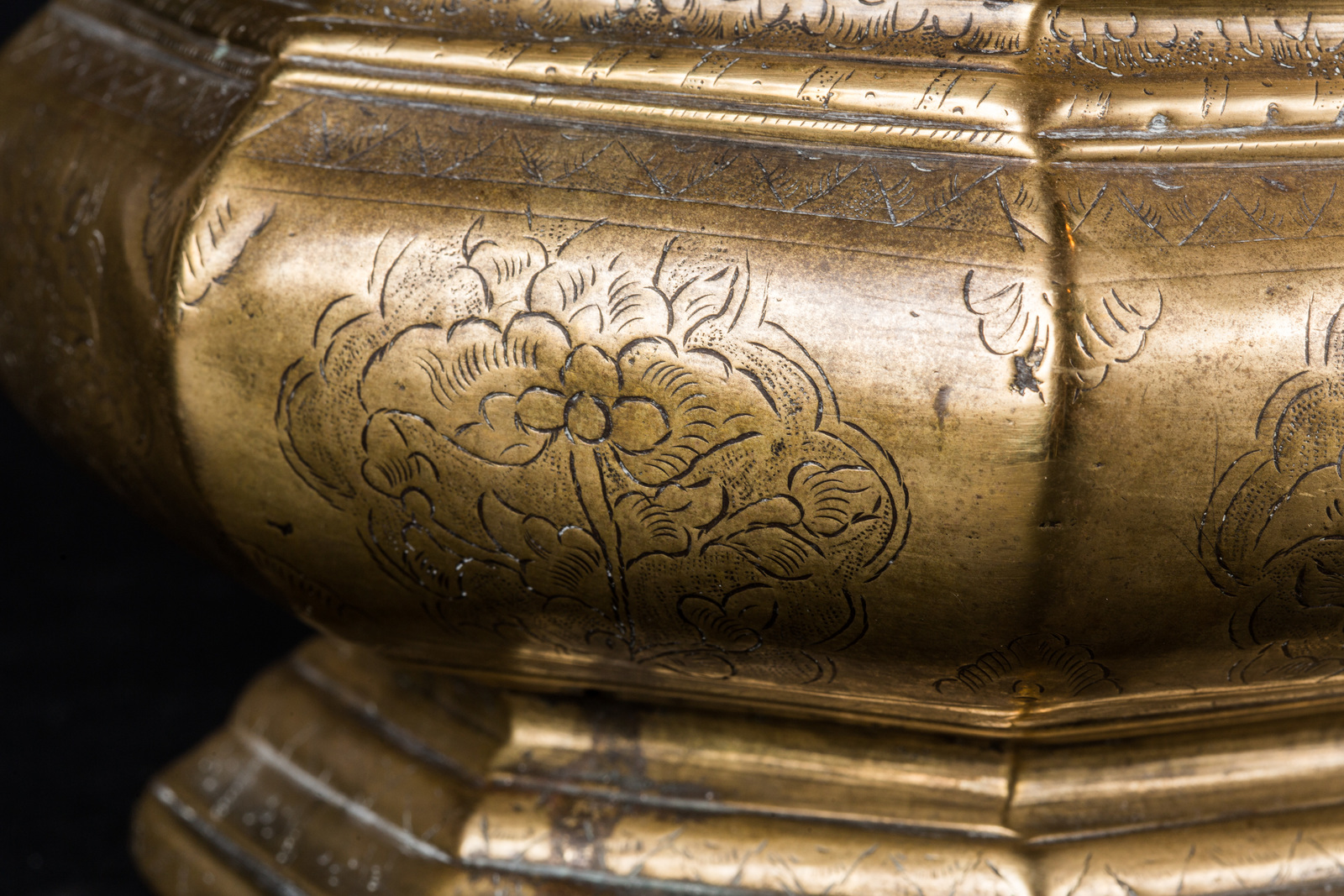 Arte Cinese Recipiente ottagonale in bronzo inciso con fiori Cina, XIX secolo...