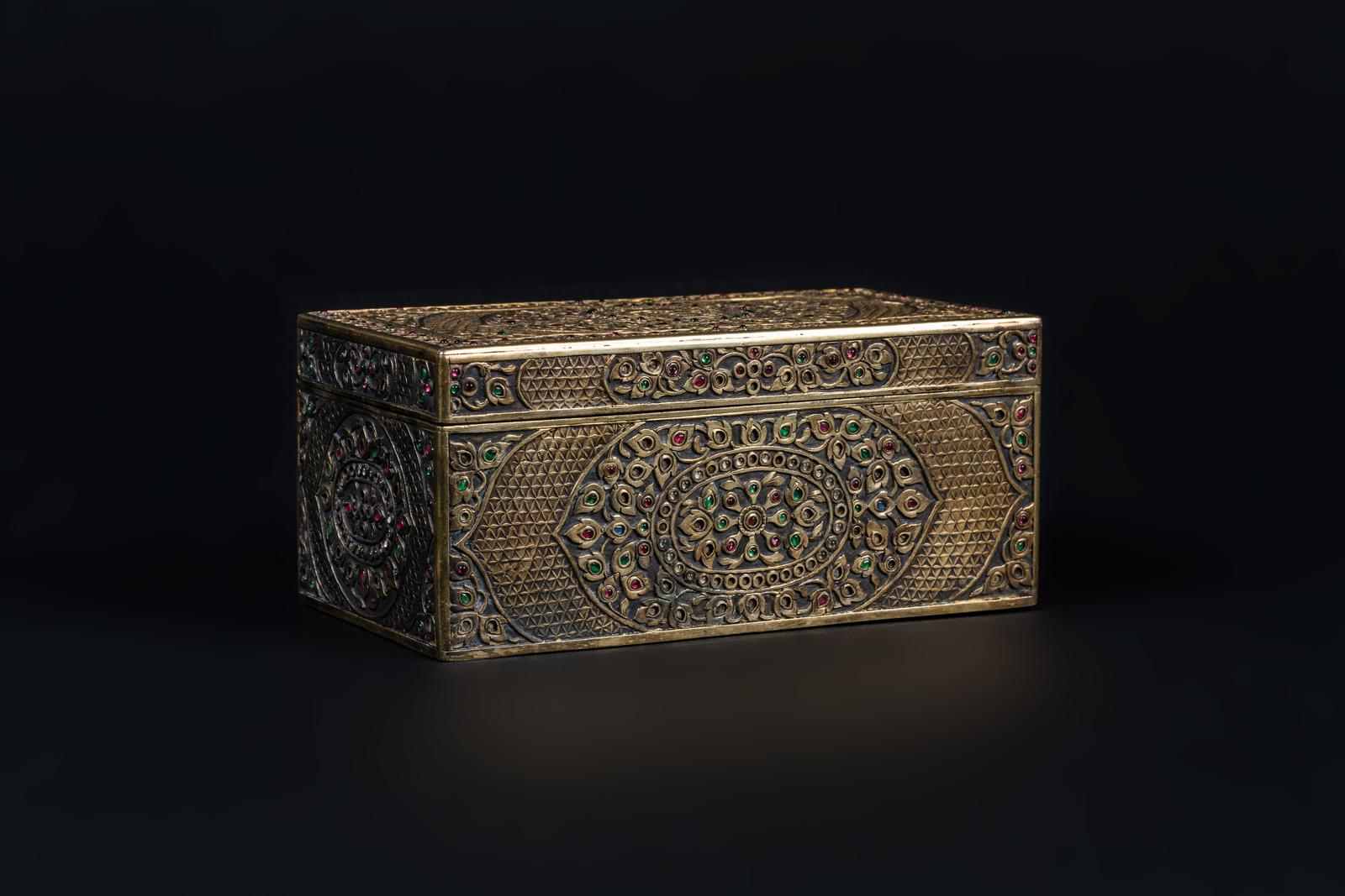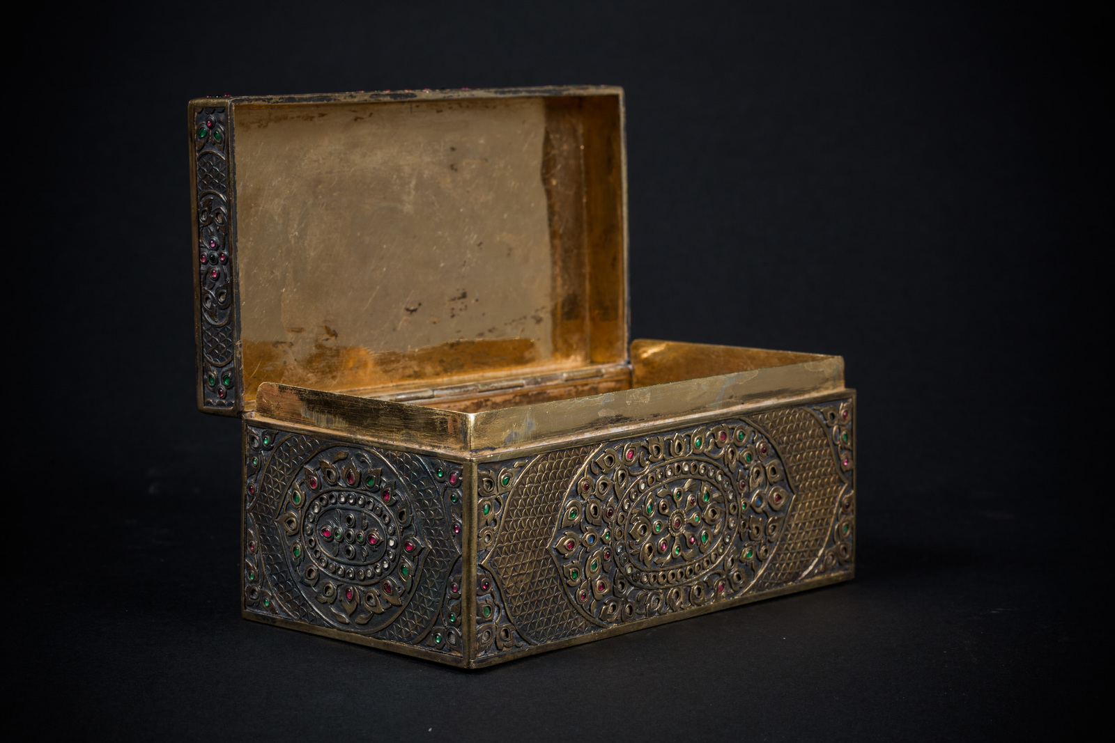 Arte Cinese Silver box encrusted with coloured glasses and semi precious stone with silver mark at the base China, late 19th . . Cm 16,00 x 7,00 x 8,02.