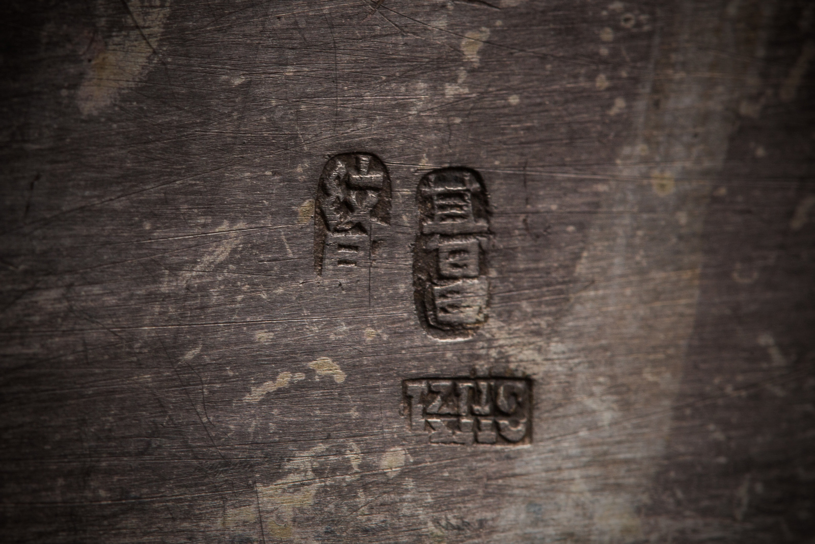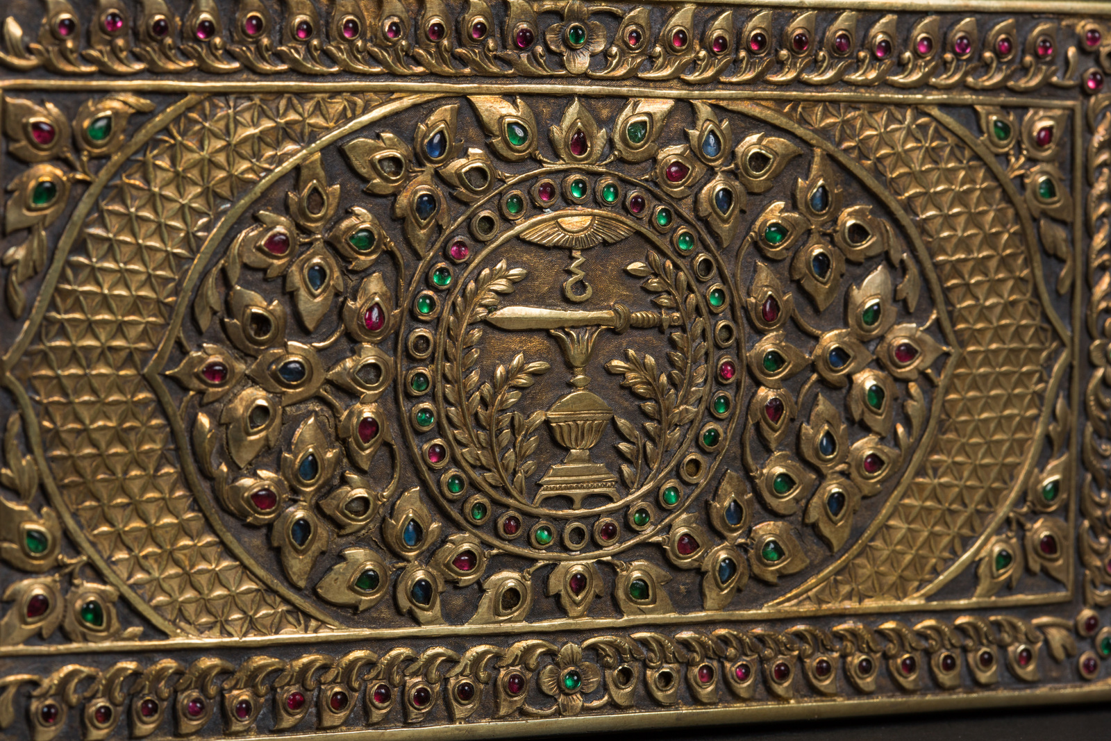 Arte Cinese Scatola in argento incrostata con vetri colorati e pietre semi-preziose Cina, tardo XIX. -. Cm 16,00 x 7,00 x 8,02. Di forma rettangolare, il coperchio incernierato decorato con foglie incrostate con pietre semi-preziose. Nel tondo centrale la raffigurazione di un calice entro foglie pendenti. Marchio dell'argento sulla base.