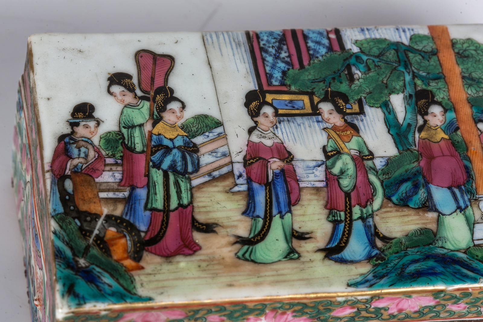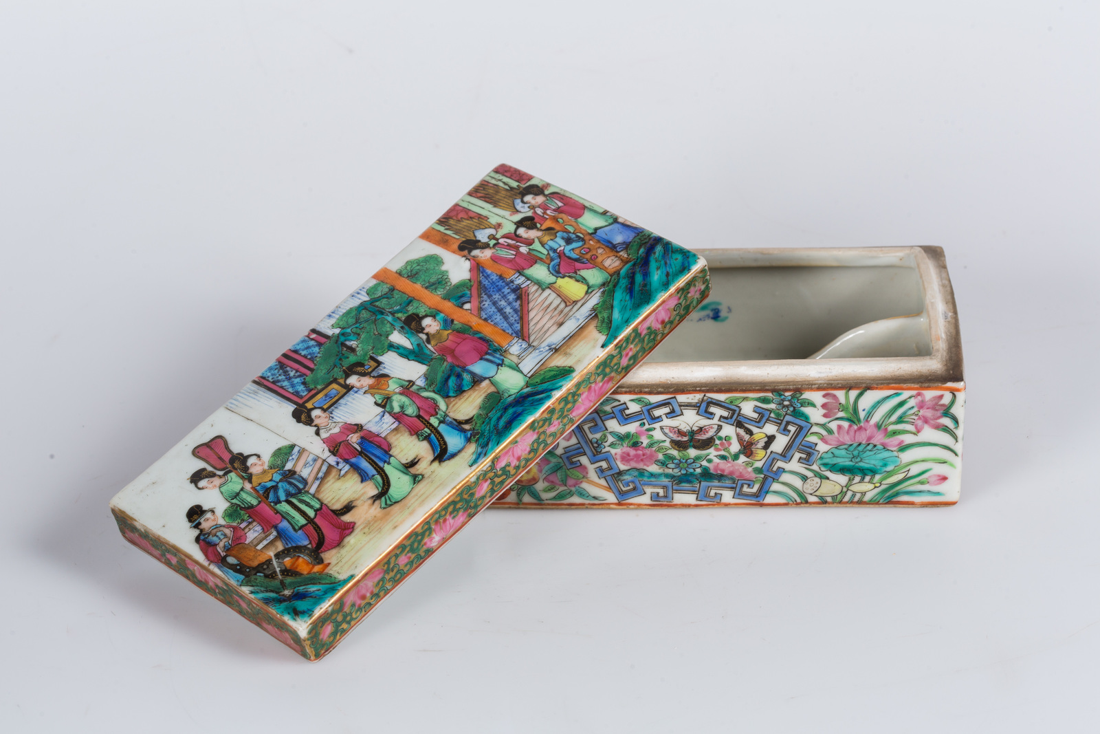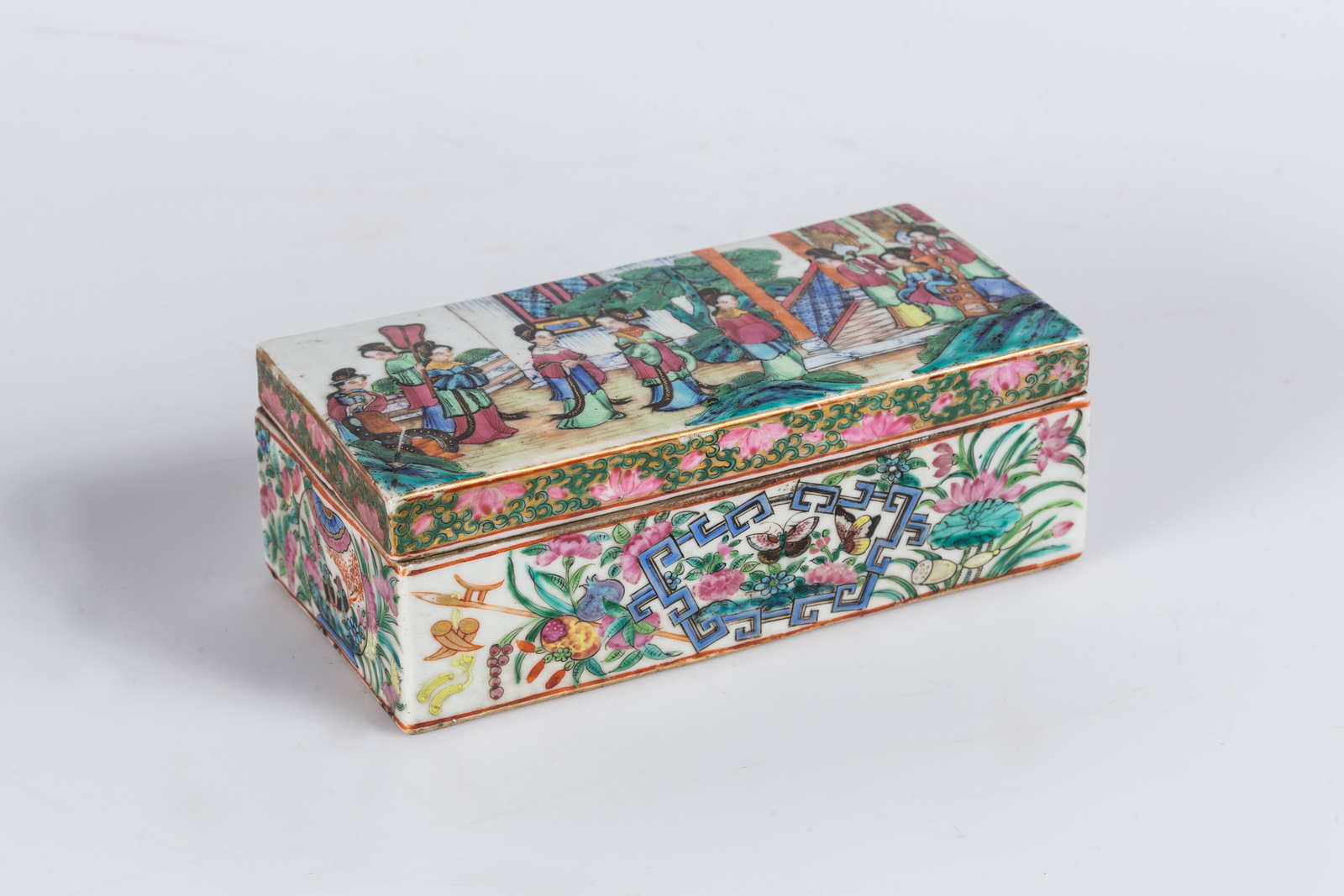 Arte Cinese Scatola rettangolare in porcellana Canton raffigurante scene cortesi