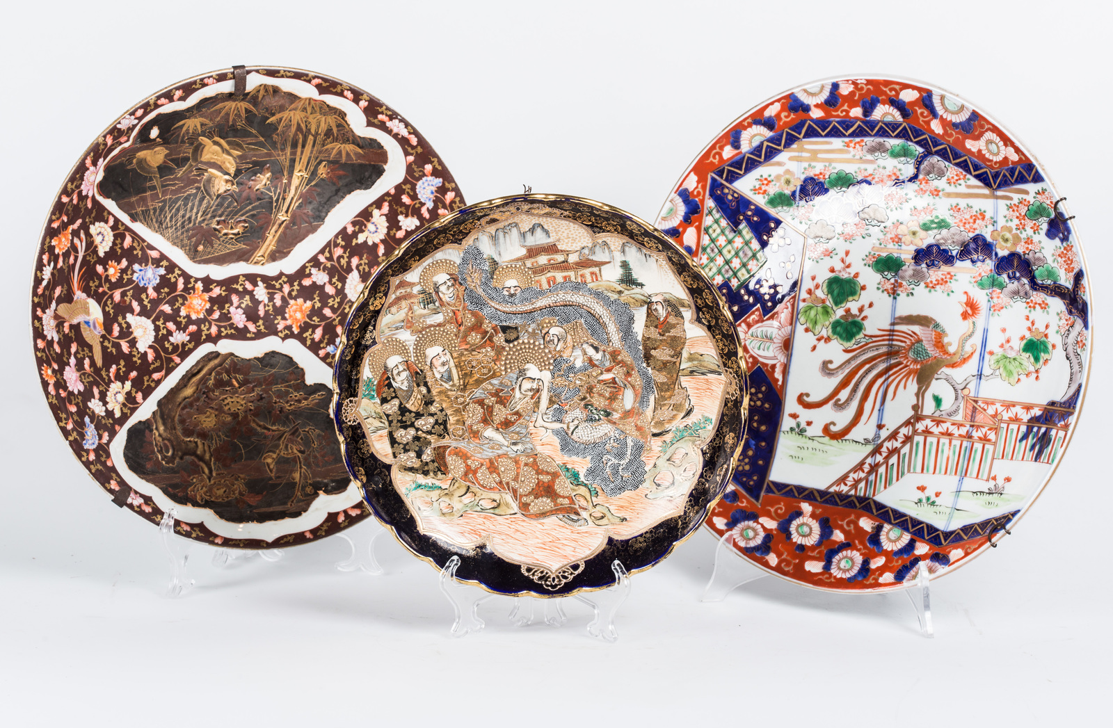 Arte Giapponese Lot composed of three porcelain chargers: one Satsuma, one Imari and one Kutani