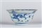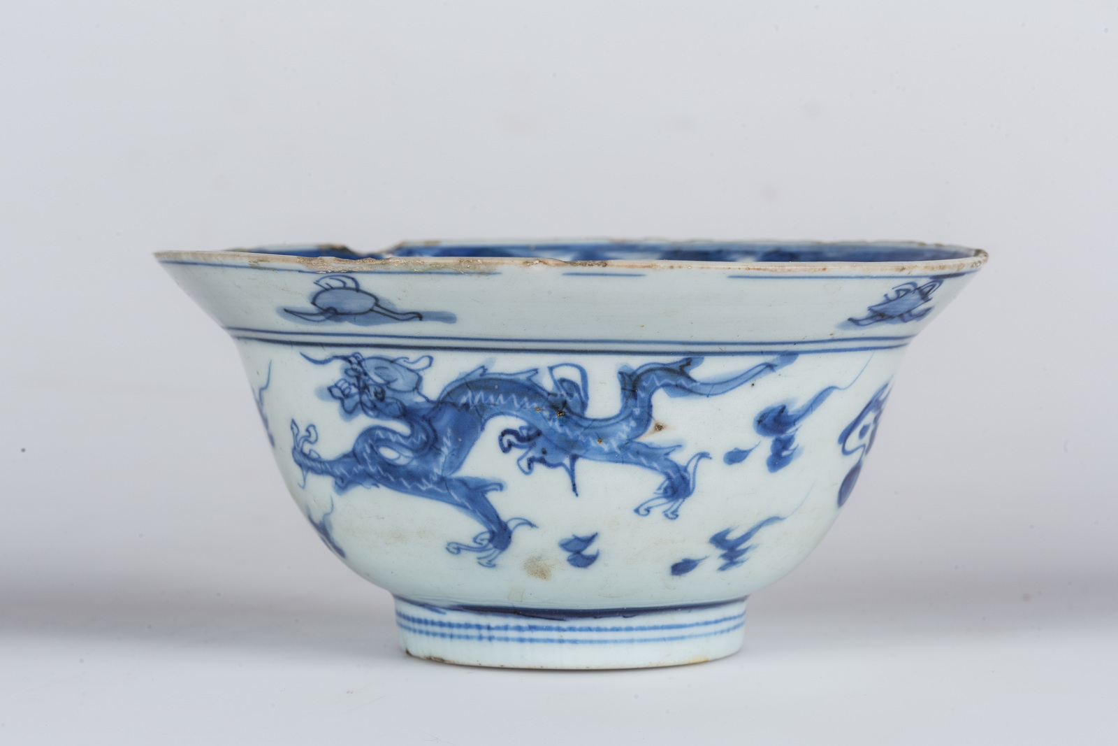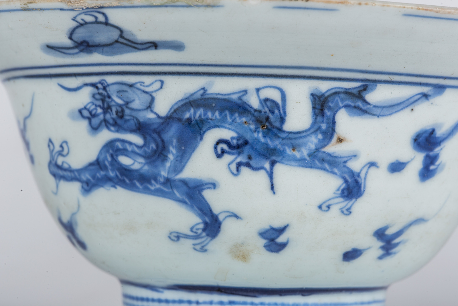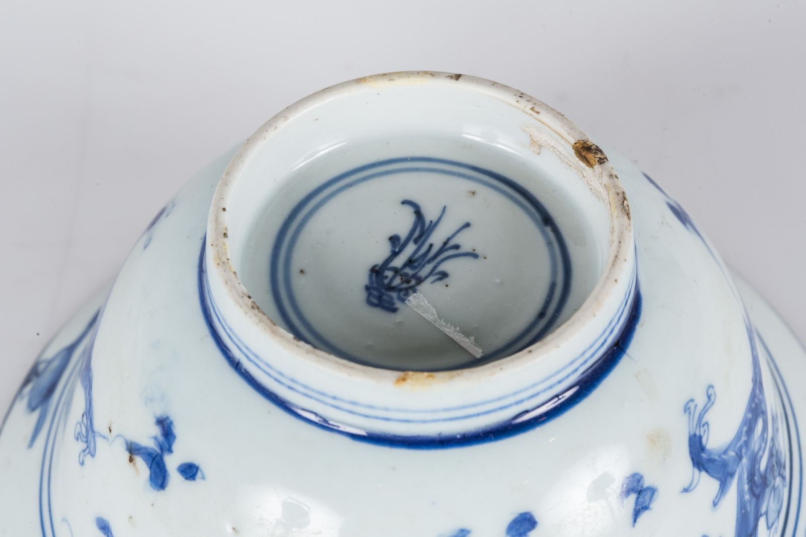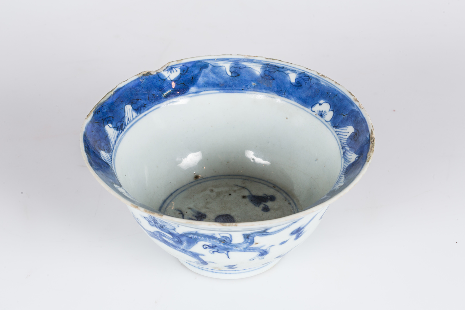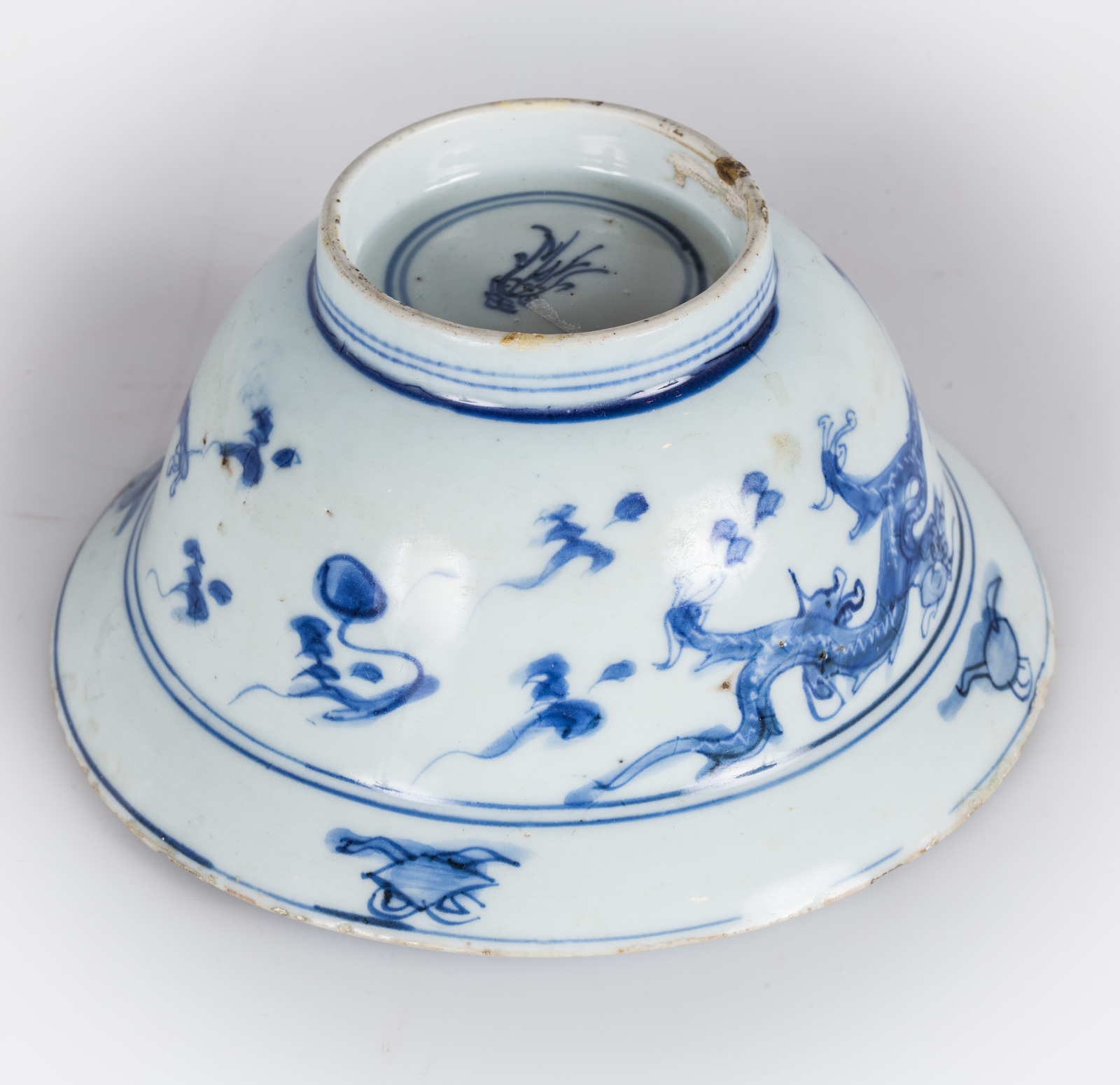 Arte Cinese A blue and white porcelain bowl painted with dragons chasing the flaming pearl and bearing a ding incense burner mark at the base