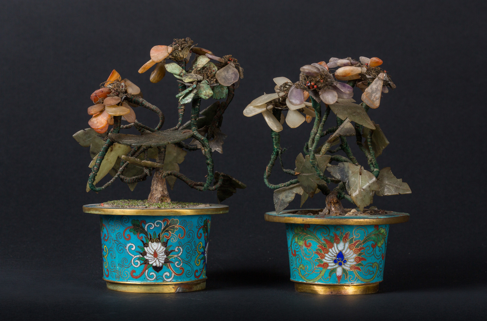 Arte Cinese Coppia di piante con petali in pietre semi-preziose Cina, XX secolo . -. Cm 11,00 x 20,00. Entro vasi decorati con smalti cloisonnè a motivo floreale.