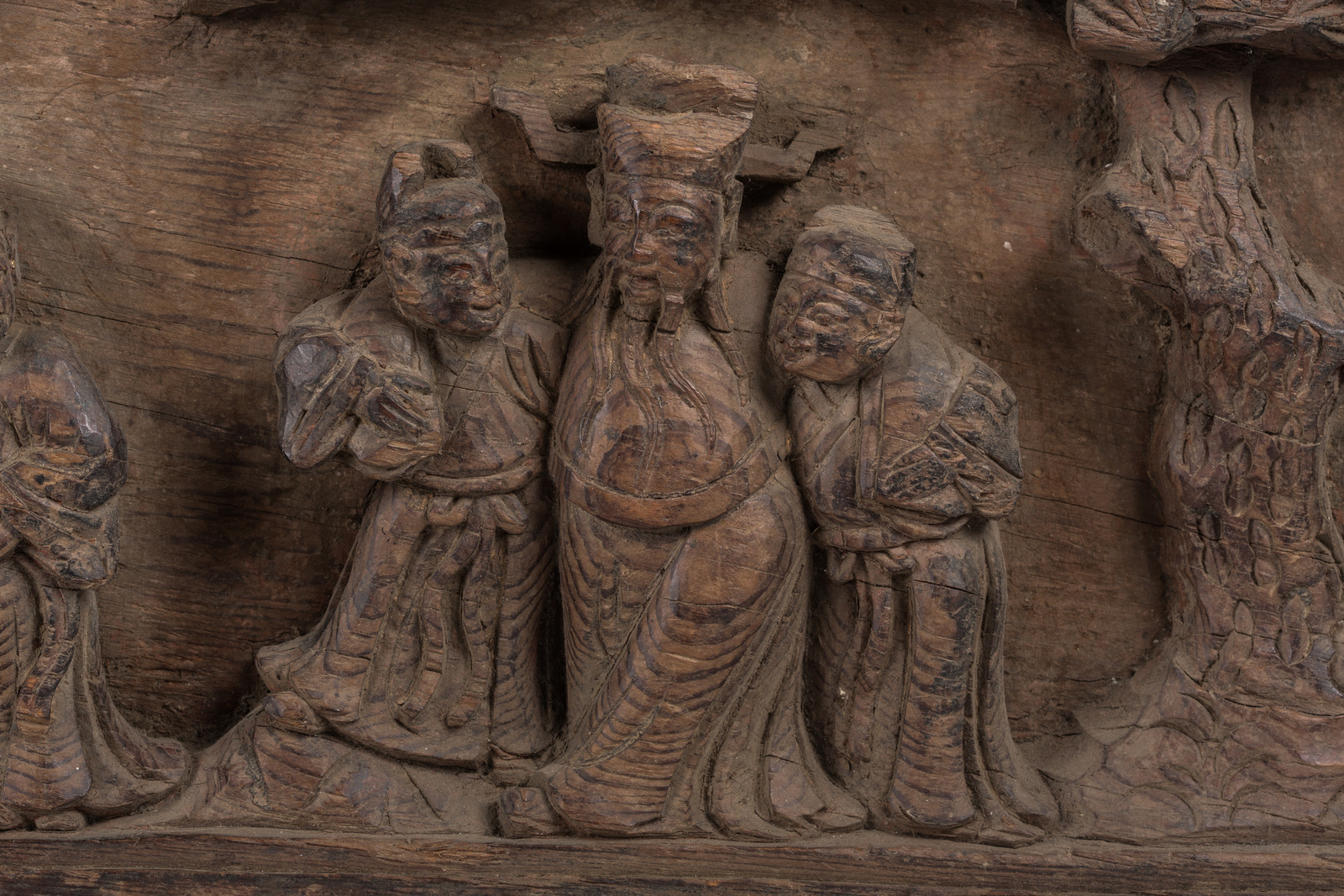 Arte Cinese A wooden lintel carved in relief with figures under trees China, Ming dynasty, 16th century . . Cm 26,00 x 75,00.
