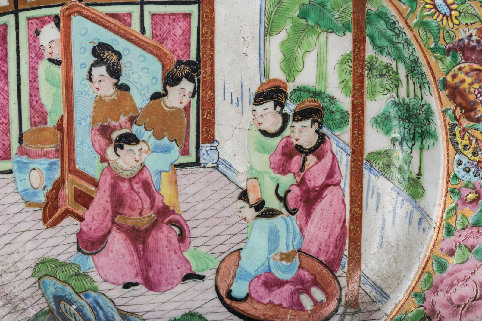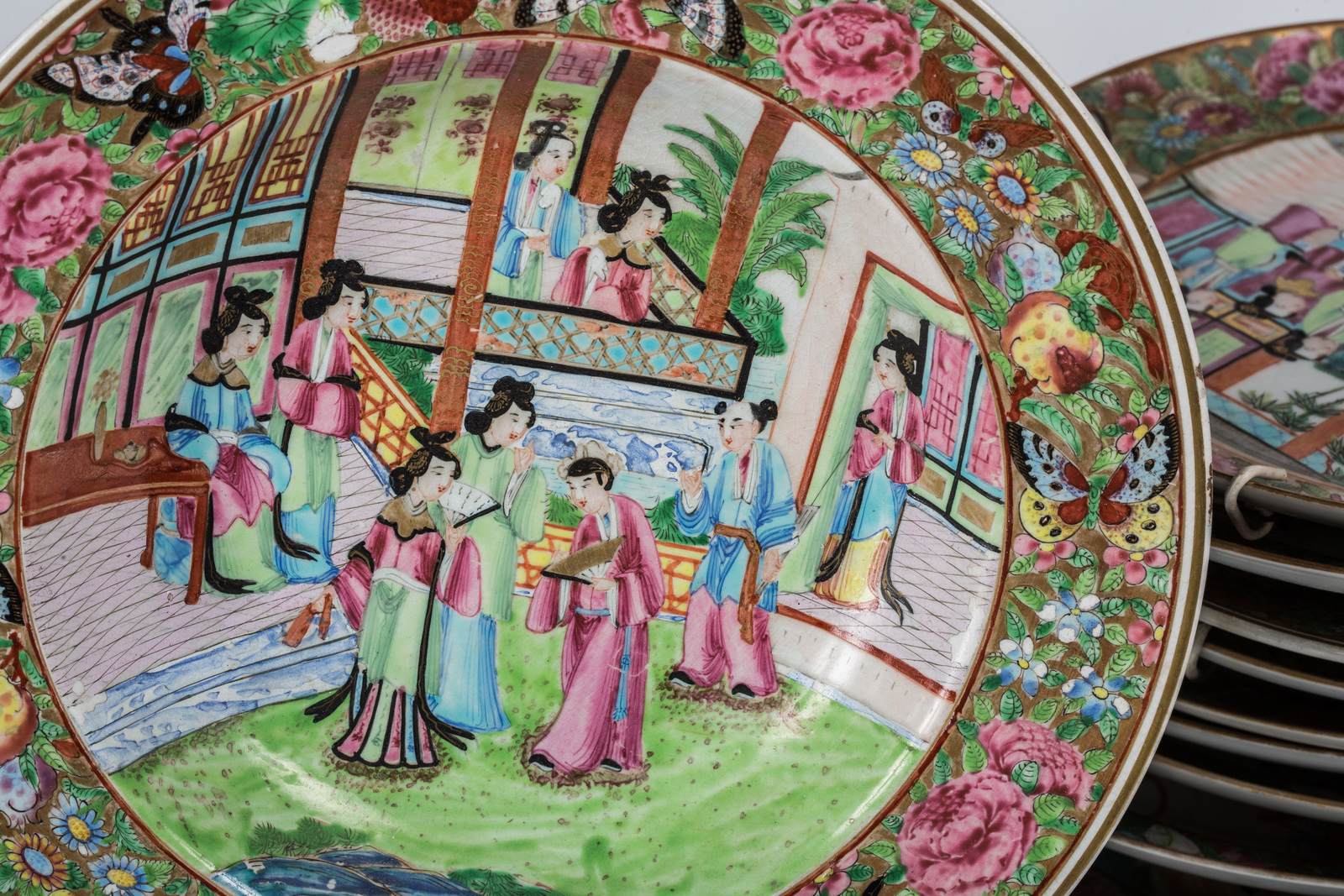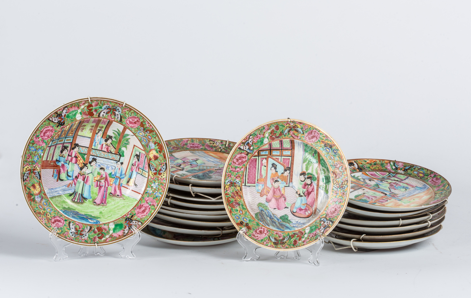 Arte Cinese Servizio di 18 piatti in porcellana Canton Cina, XIX secolo . -. Cm 24,00. Il bordo dipinto con fiori e farfalle su sfondo dorato, dame in esterno nel tondo centrale.