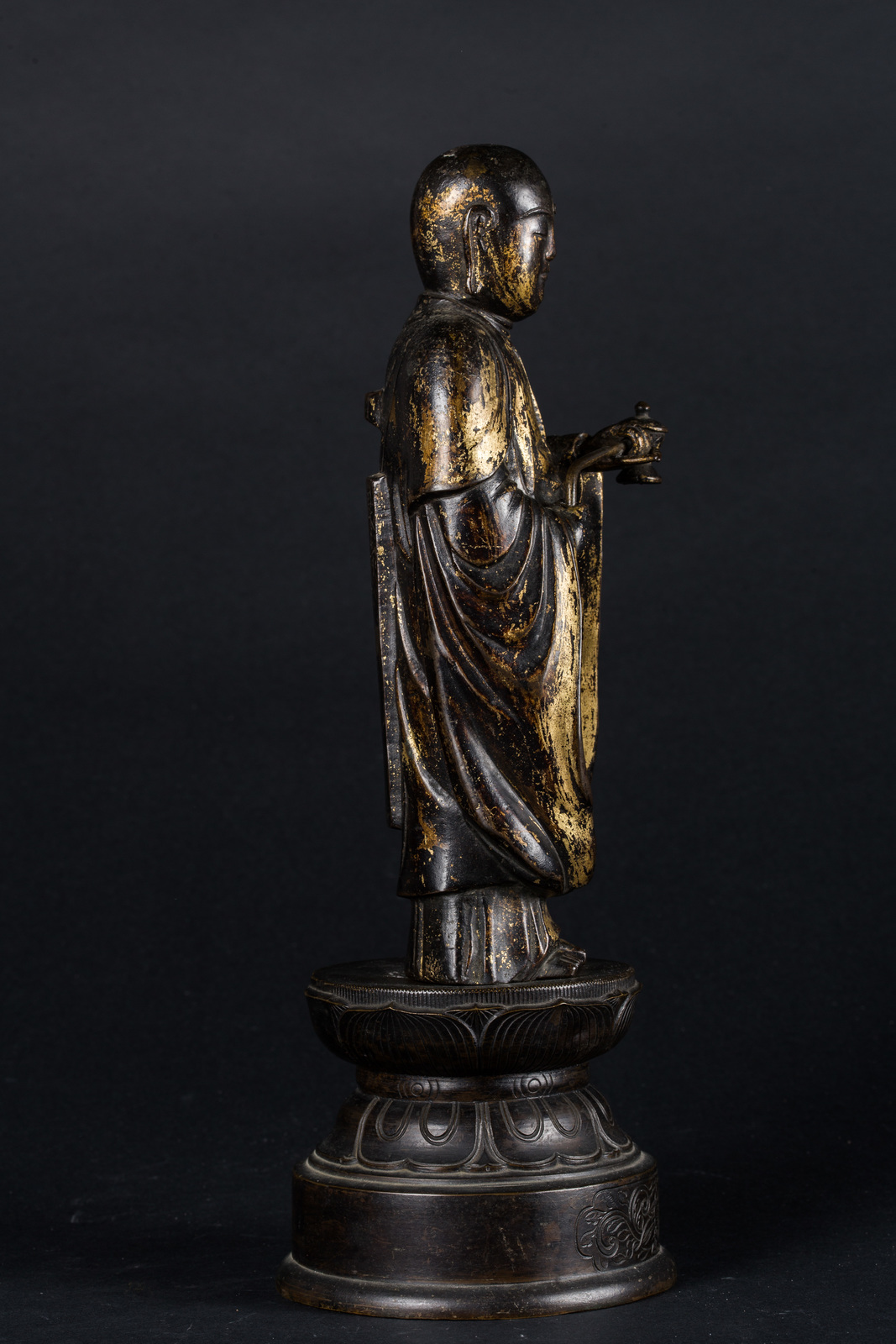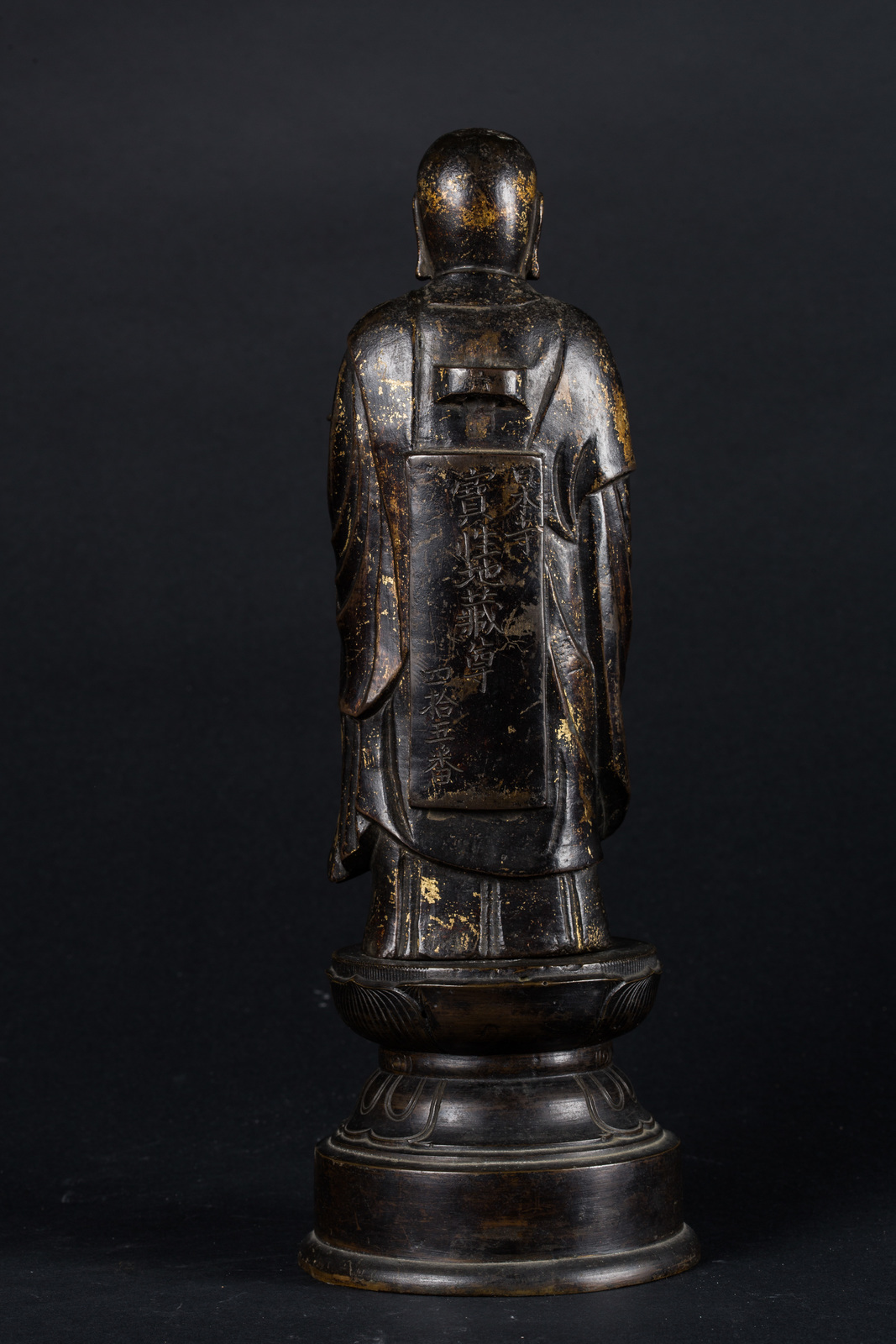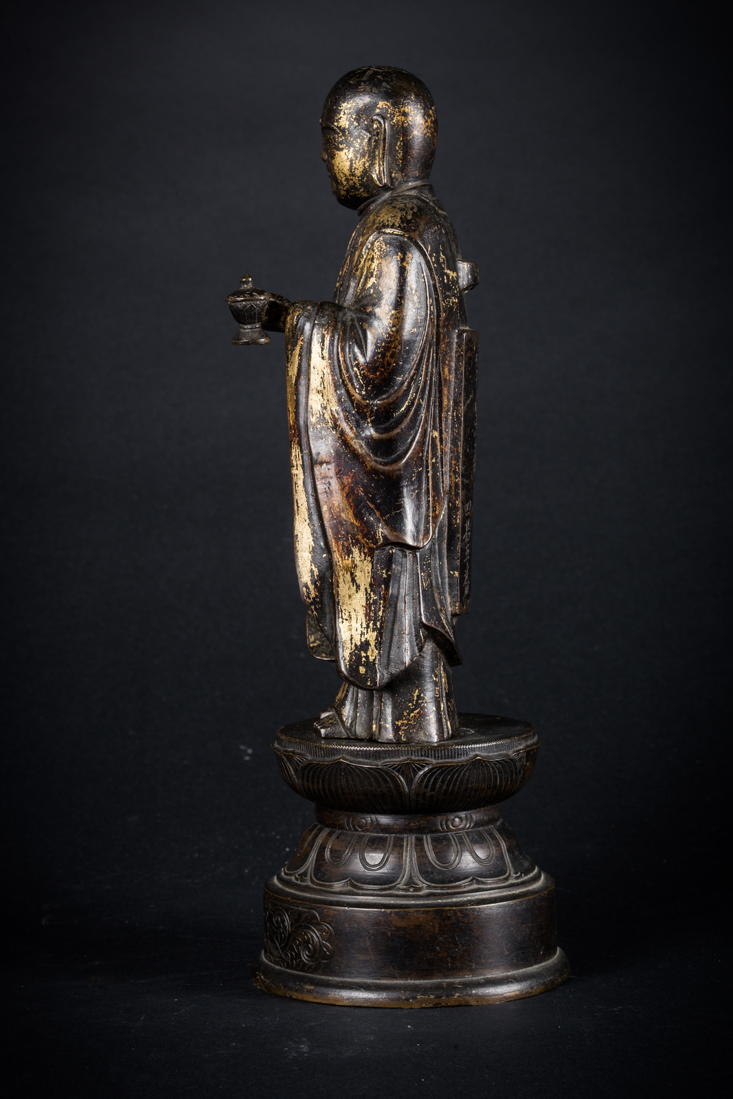 Arte Giapponese A gilt bronze figure of a standing monk carrying an incense burner and bearing inscriptions on the back