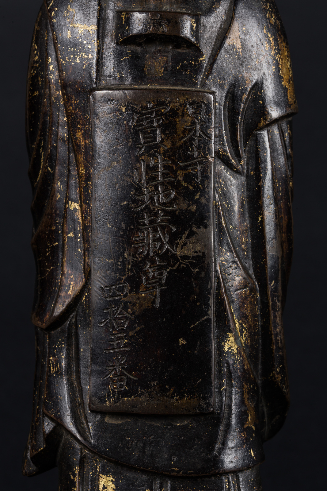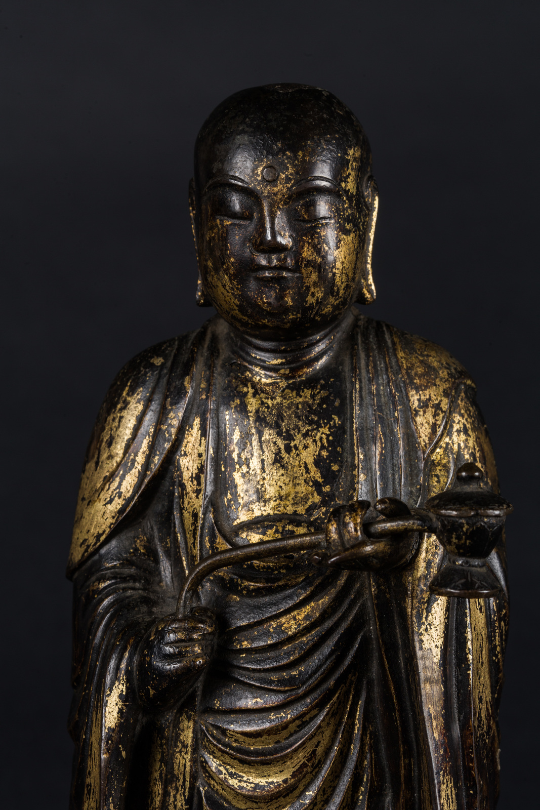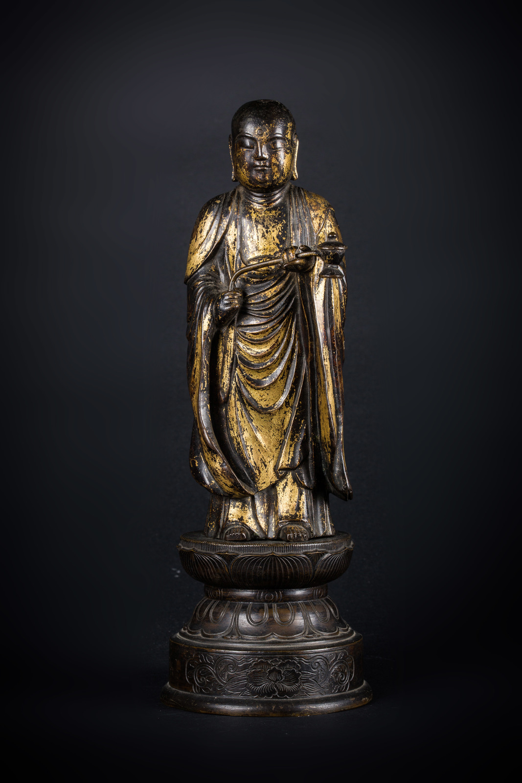 Arte Giapponese A gilt bronze figure of a standing monk carrying an incense burner and bearing inscriptions on the back