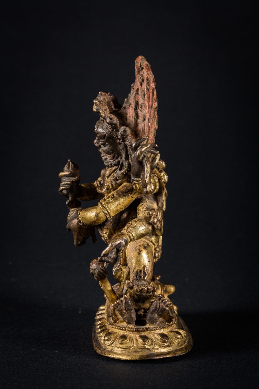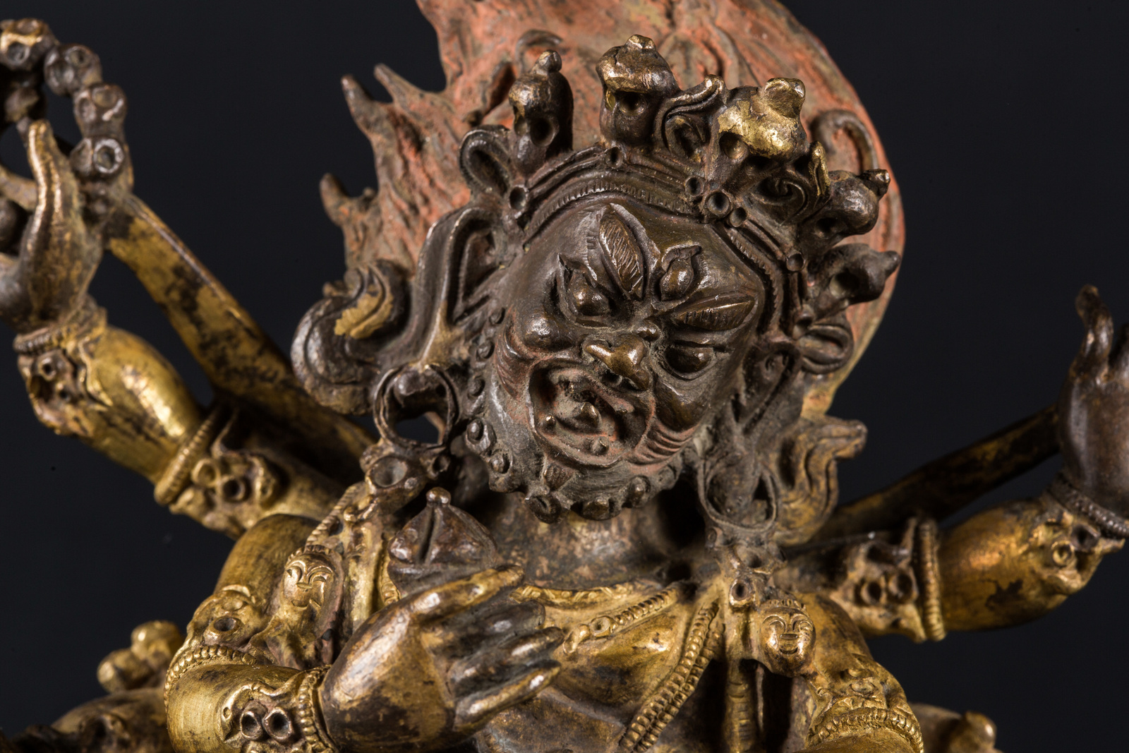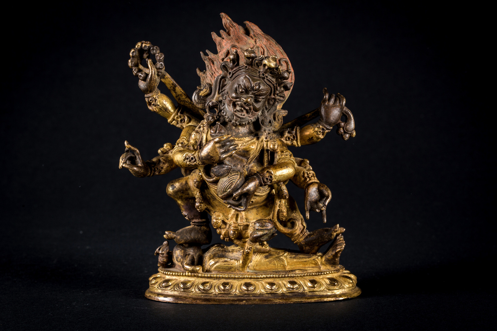 Nepal, tardo XIX secolo. -. Cm 14,00 x 17,00. Fusione raffigurante il dharmapala Mahakala poggiato a gambe divaricate sul cadavere di Ganapati, a sua volta distesa su una base a fiore di loto singolo. La figura, dall'aspetto irato, ha sei mani, ognuna delle quali stringe un attributo (tre dei quali persi), qui sono presenti: una kartika, una kapala ed una mala. Capigliatura e respiro infuocati e pigmentati di rosso.