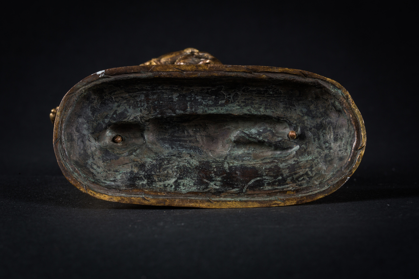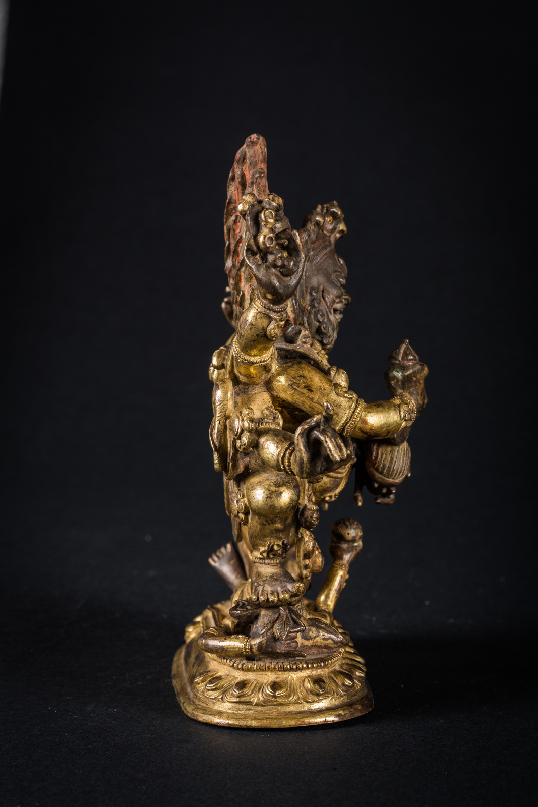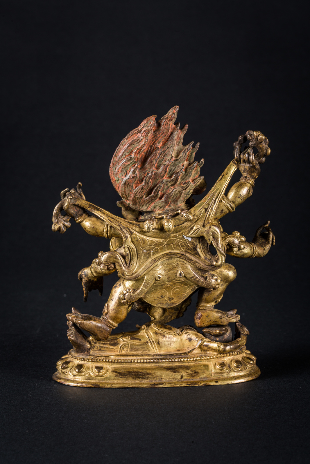 Nepal, tardo XIX secolo. -. Cm 14,00 x 17,00. Fusione raffigurante il dharmapala Mahakala poggiato a gambe divaricate sul cadavere di Ganapati, a sua volta distesa su una base a fiore di loto singolo. La figura, dall'aspetto irato, ha sei mani, ognuna delle quali stringe un attributo (tre dei quali persi), qui sono presenti: una kartika, una kapala ed una mala. Capigliatura e respiro infuocati e pigmentati di rosso.