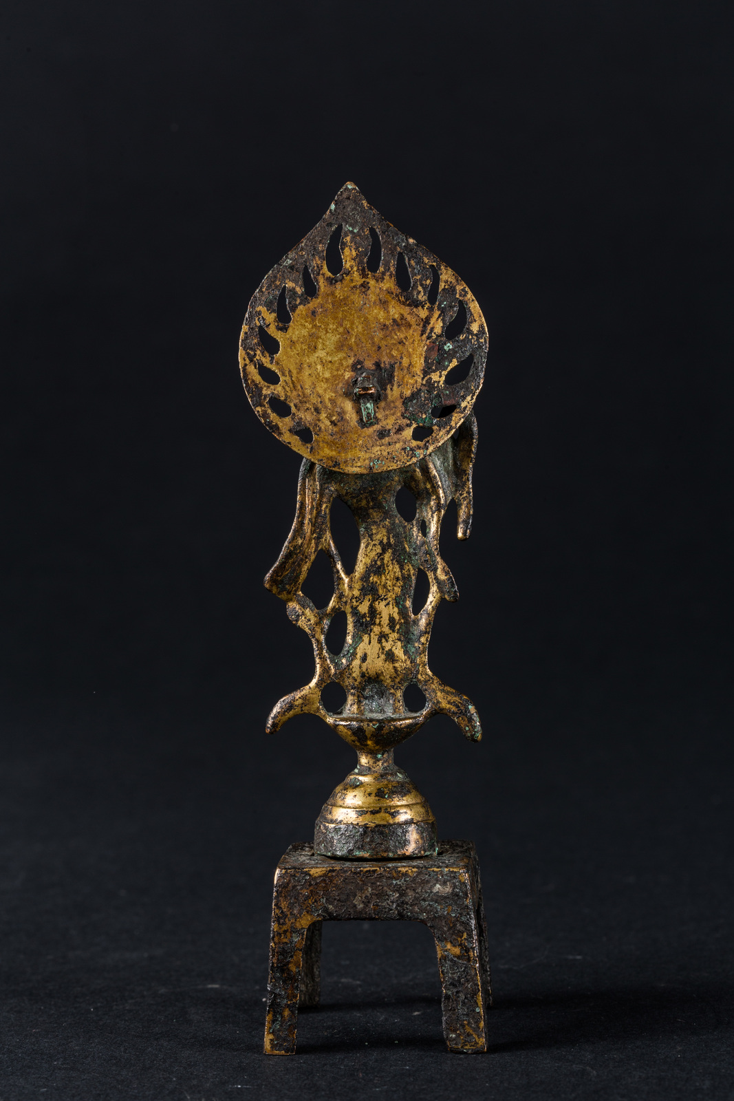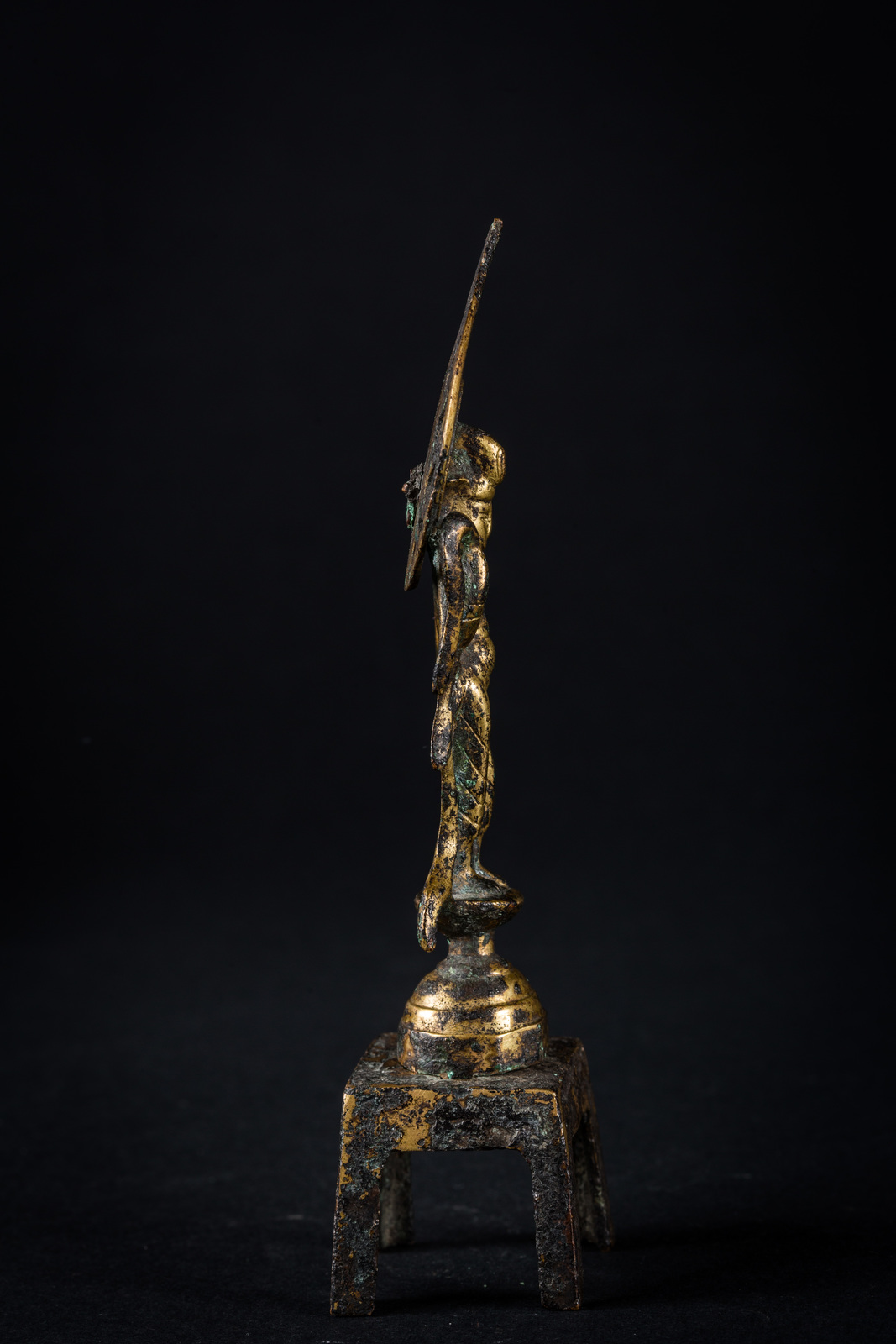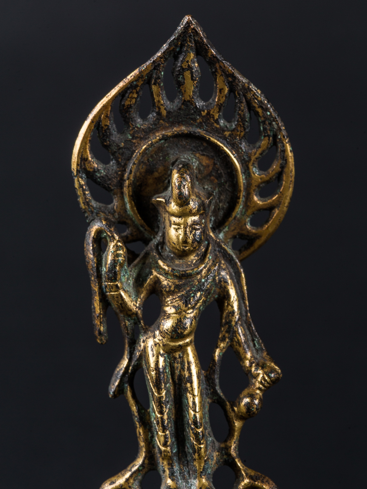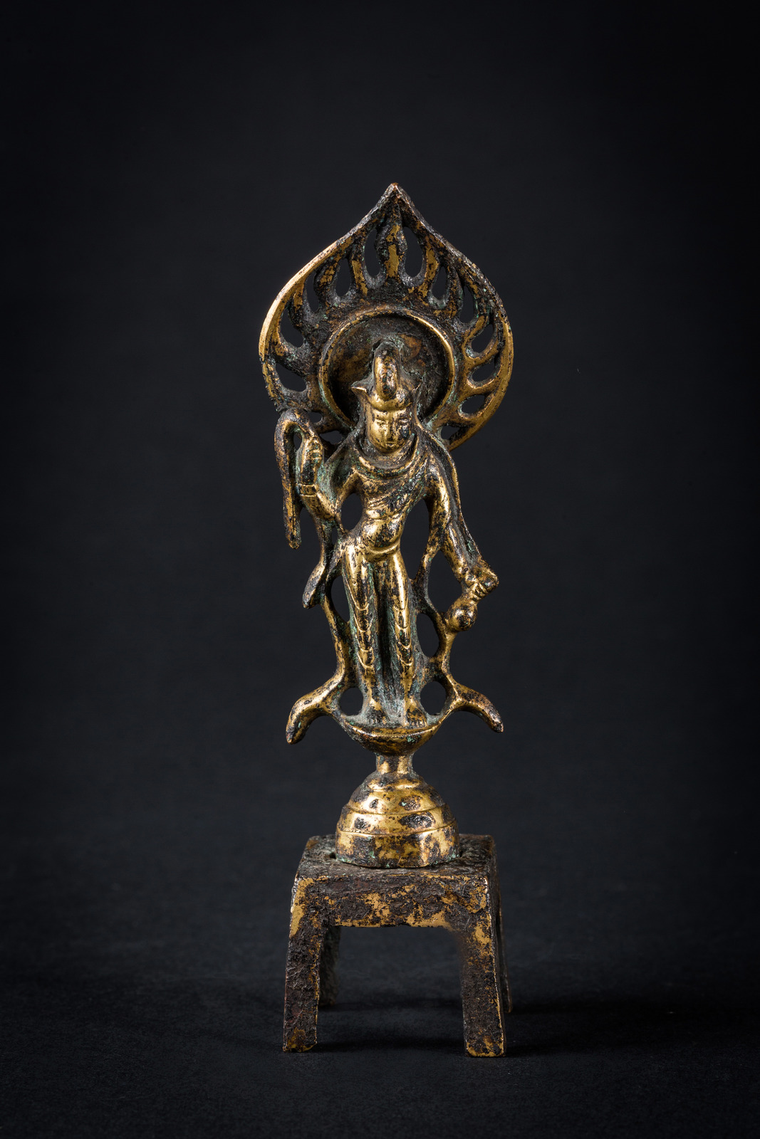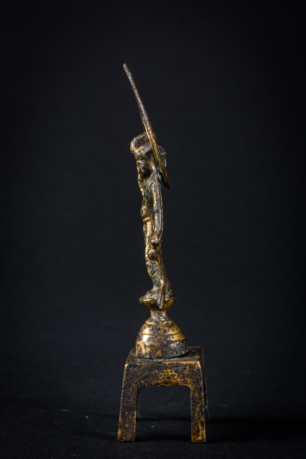 Cina, dinastia Tang, VII-X secolo . -. Cm 3,50 x 15,00. Raffigurante in bodhisattva trascendente Avalokitesvara nella sua forma denominata Padmapani, stante su un'alta base quadrata. La figura veste una tunica svolazzante e si staglia su un'aureola fiammeggiante a cuspide.